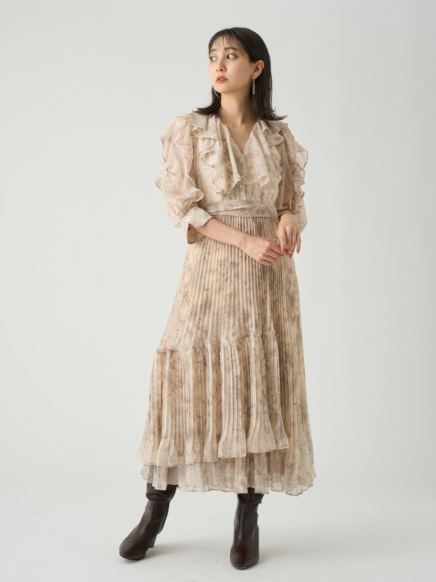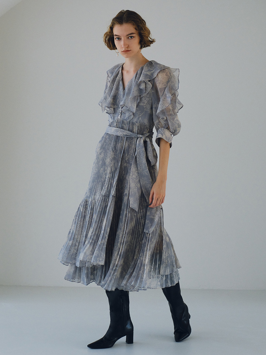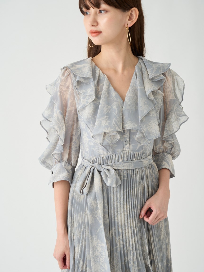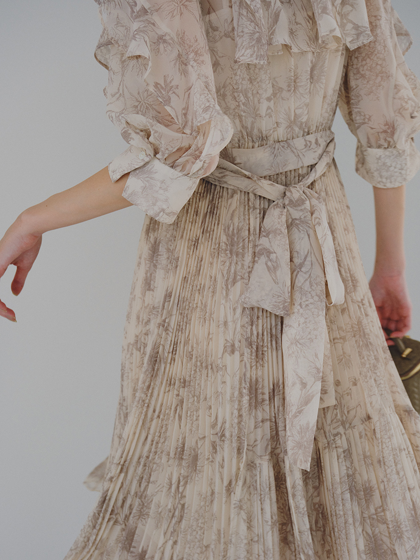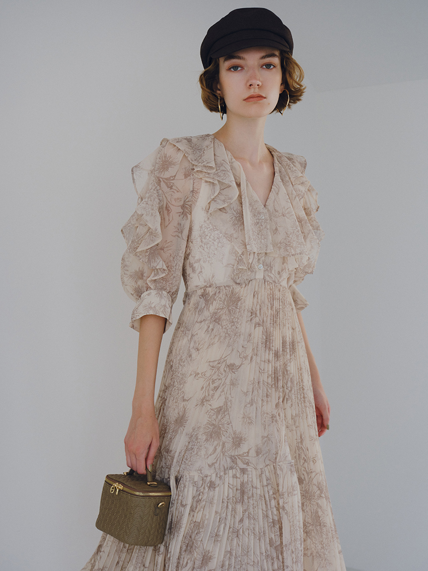 軽やかなシフォンに線描タッチのフラワープリントを施した、SNIDELらしいフェミニンなフリルプリーツドレス。