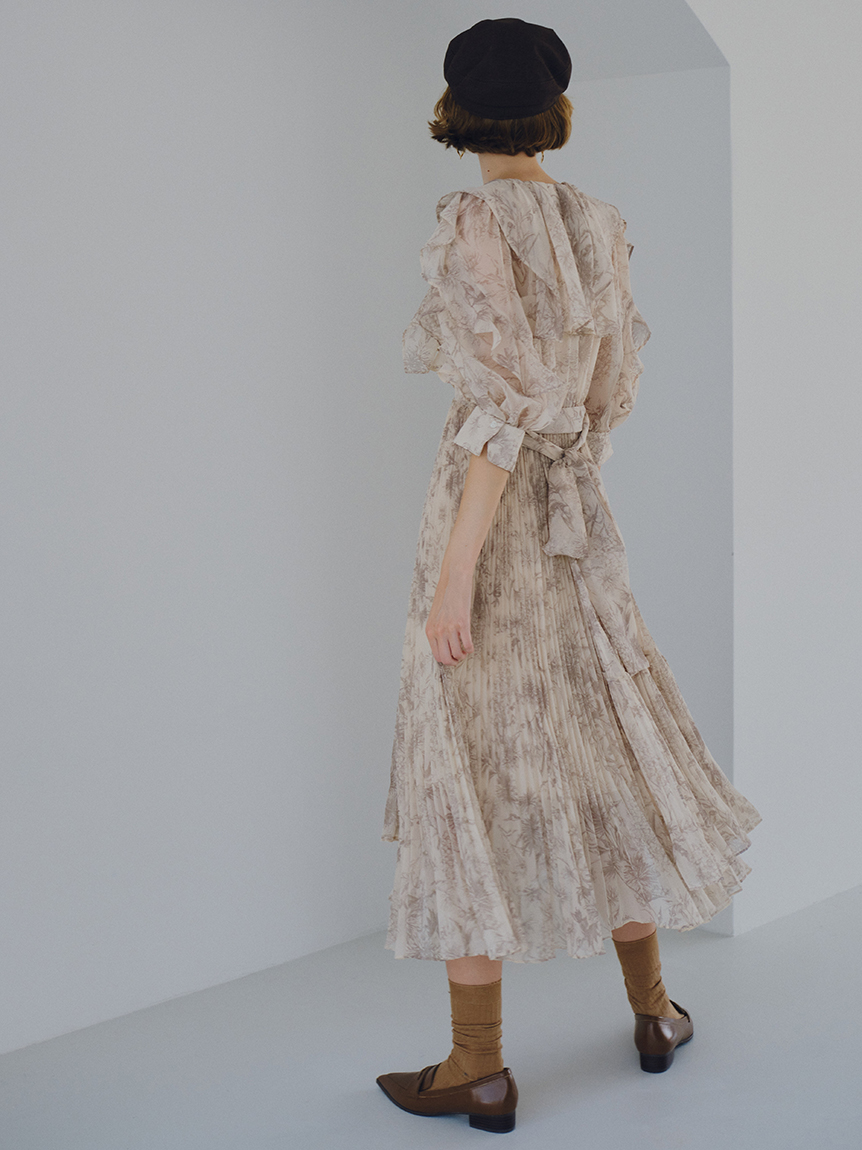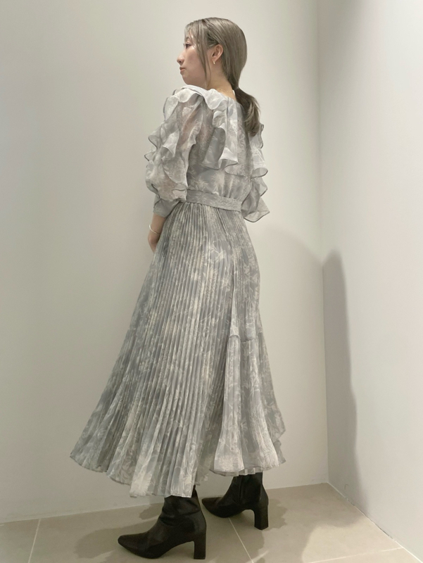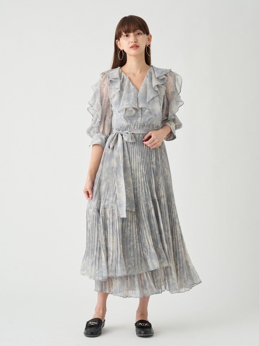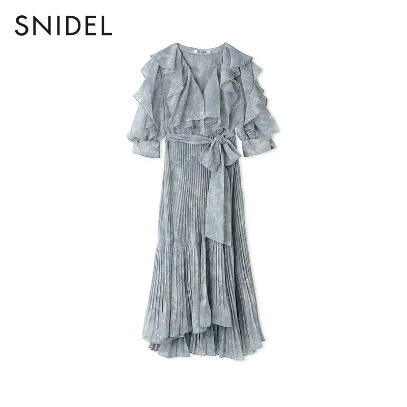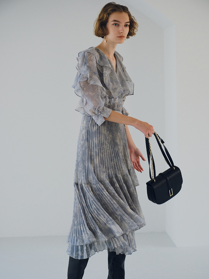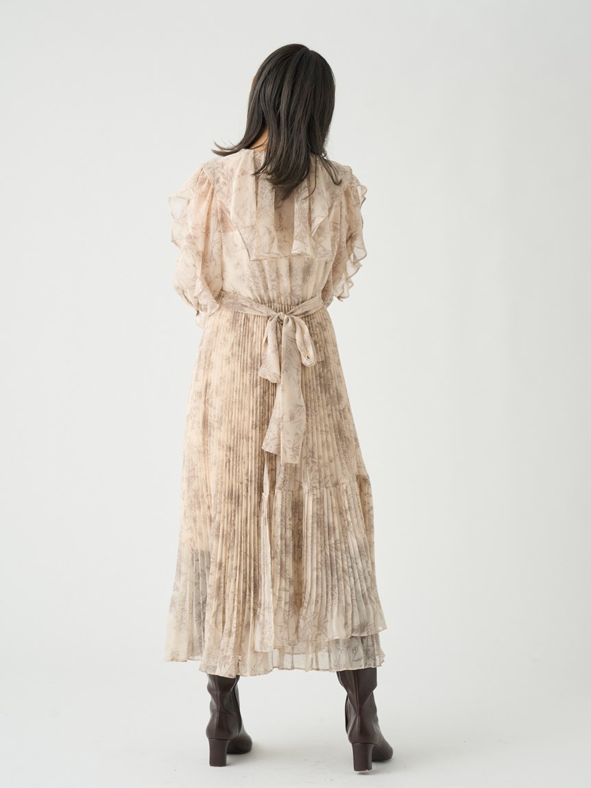 軽やかなシフォンに線描タッチのフラワープリントを施した、SNIDELらしいフェミニンなフリルプリーツドレス。