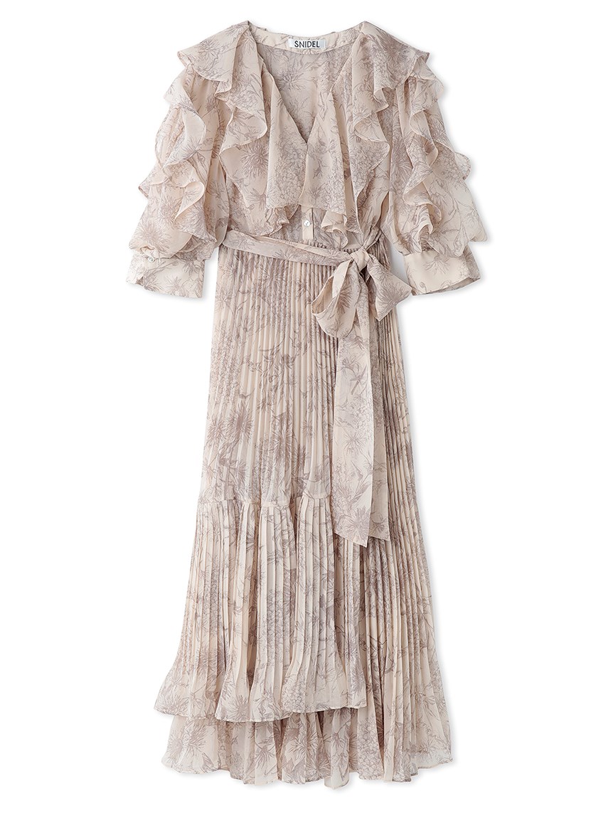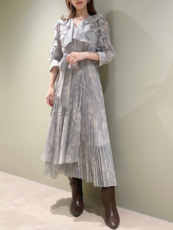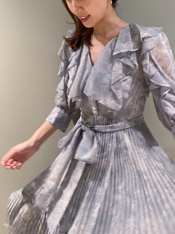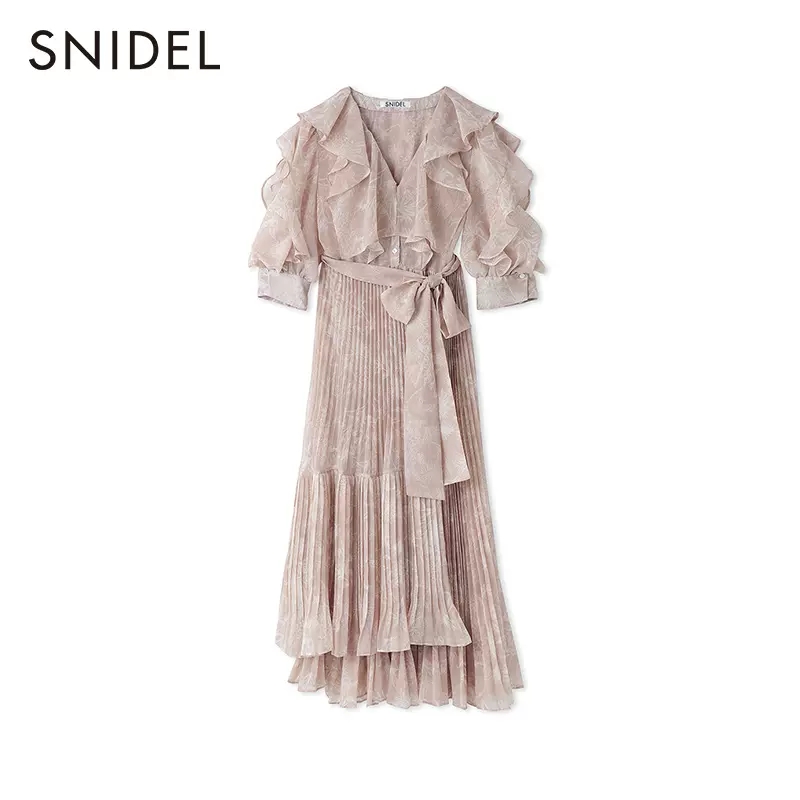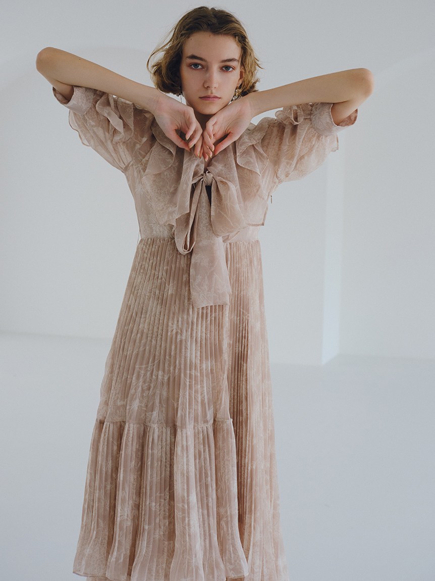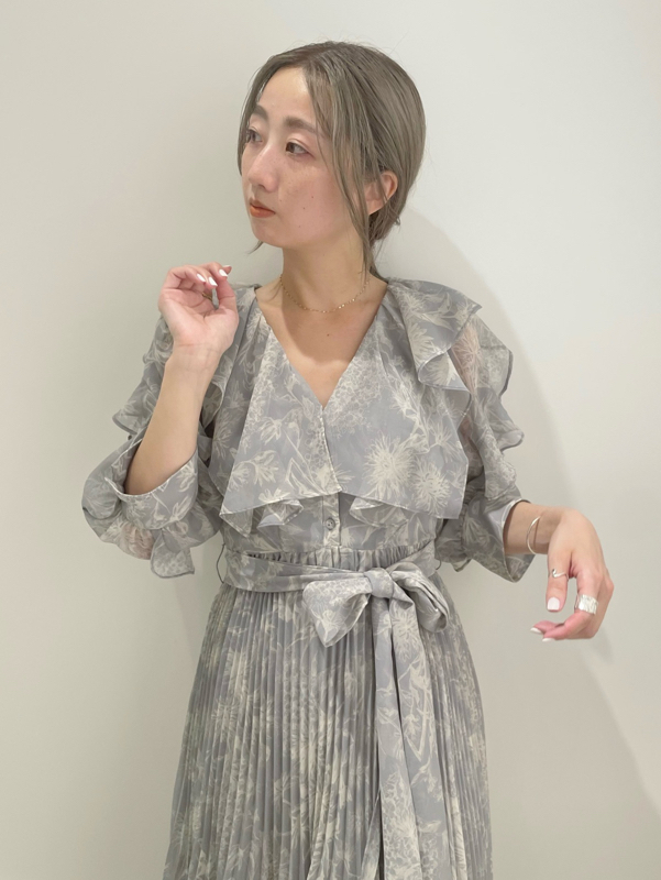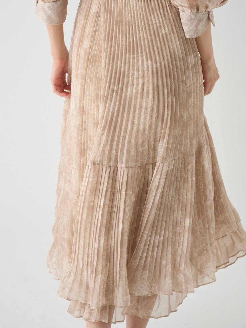 軽やかなシフォンに線描タッチのフラワープリントを施した、SNIDELらしいフェミニンなフリルプリーツドレス。