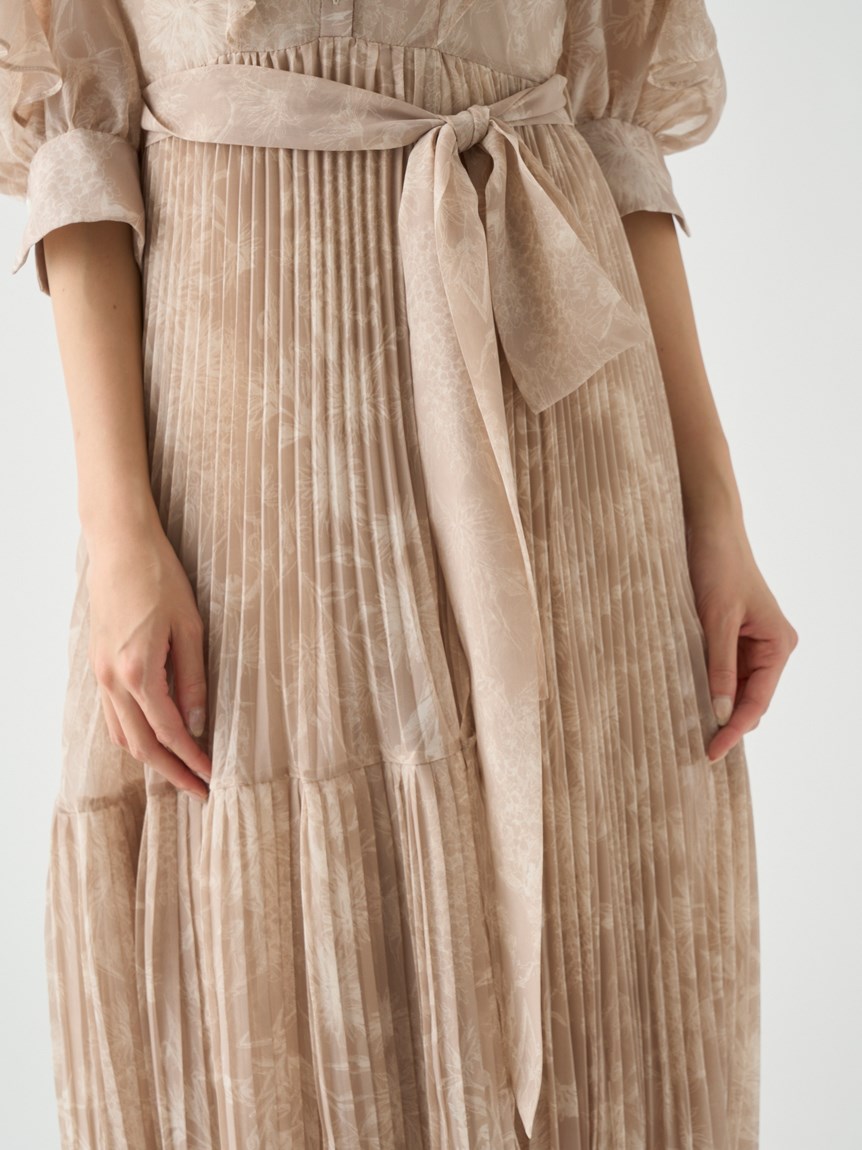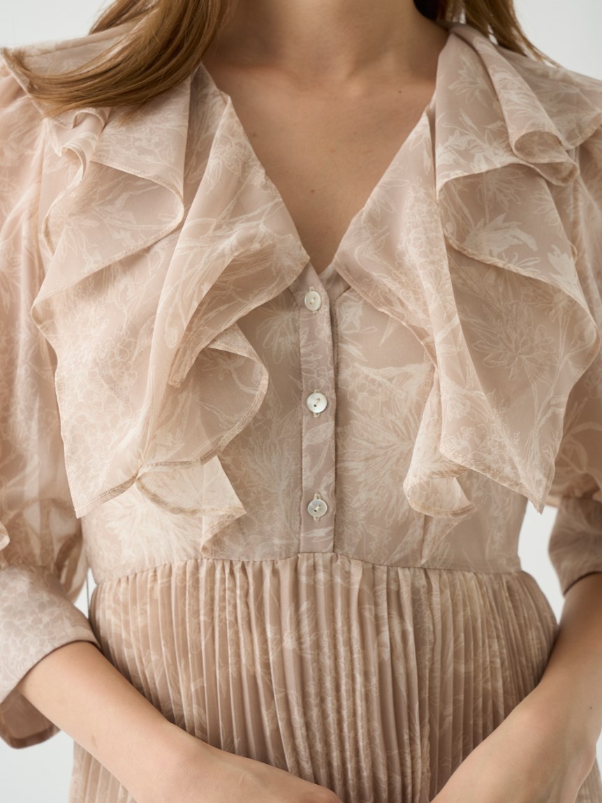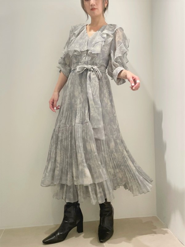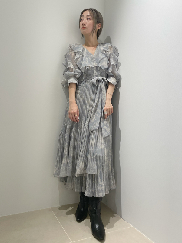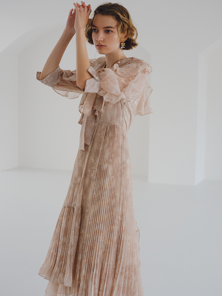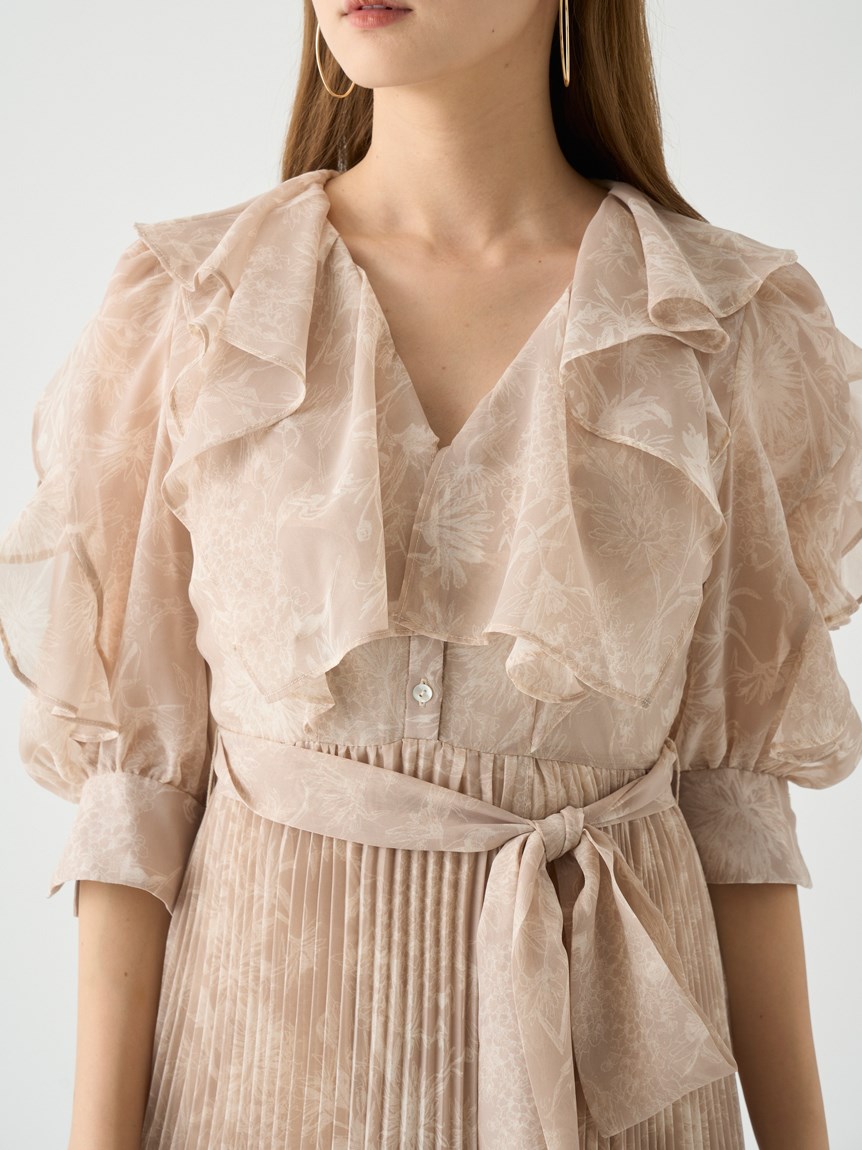 軽やかなシフォンに線描タッチのフラワープリントを施した、SNIDELらしいフェミニンなフリルプリーツドレス。