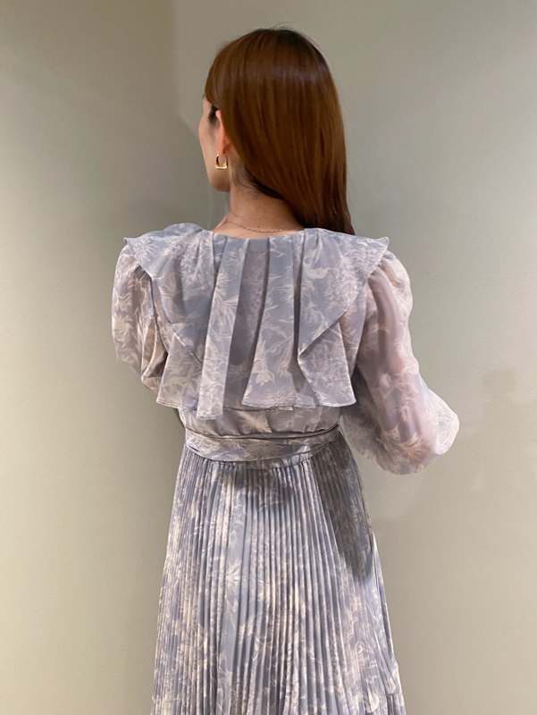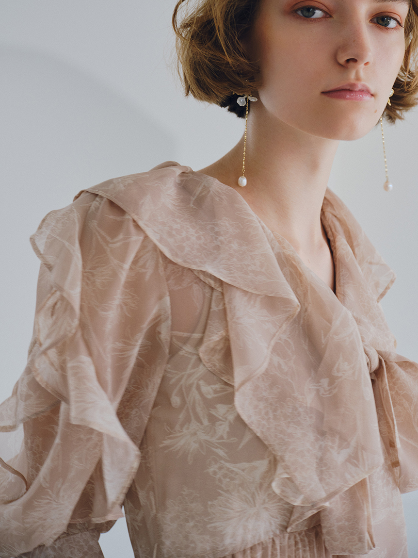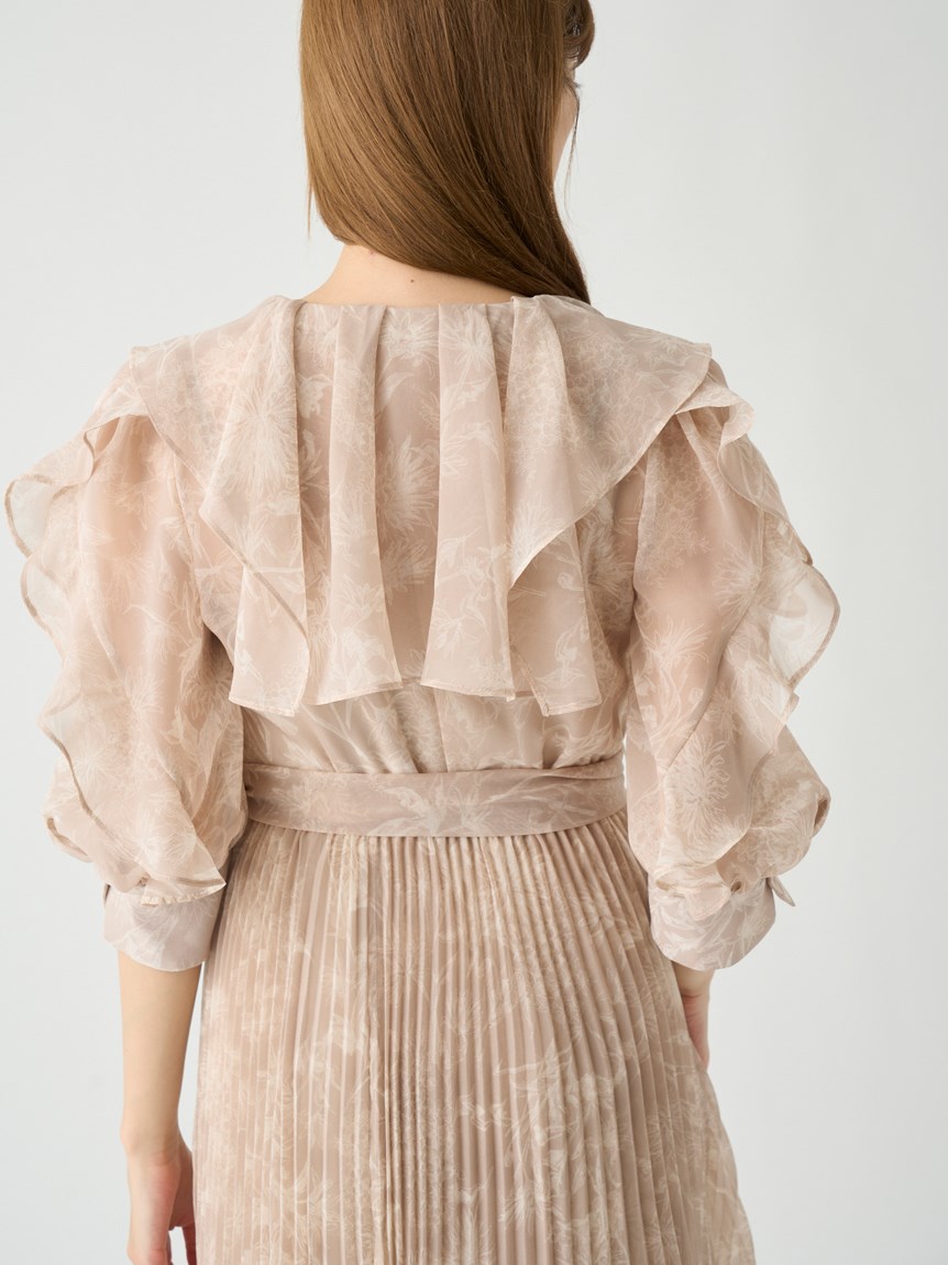 襟元の大きめフリルや袖元にあしらわれた流れるようなフリルが動くたびに揺れ、とびきり華やかな印象に。