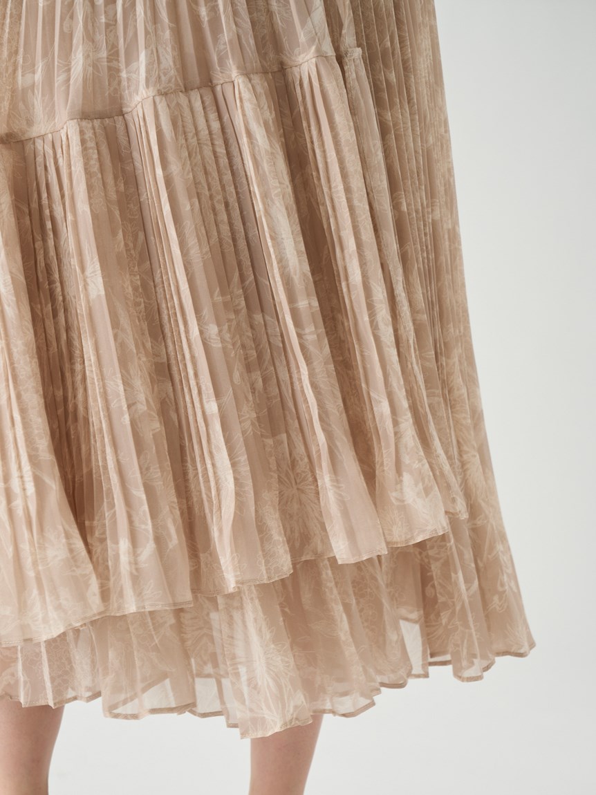 スカート部分にはプリーツ加工が施され、裾に向けて広がるシルエットがスタイルアップを実現します。