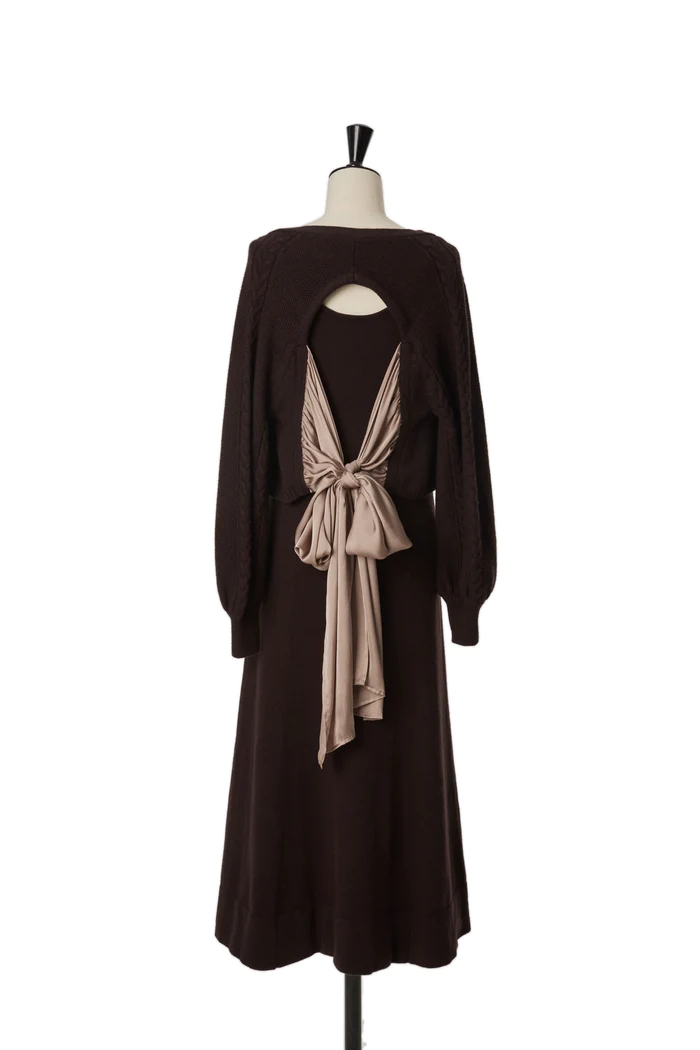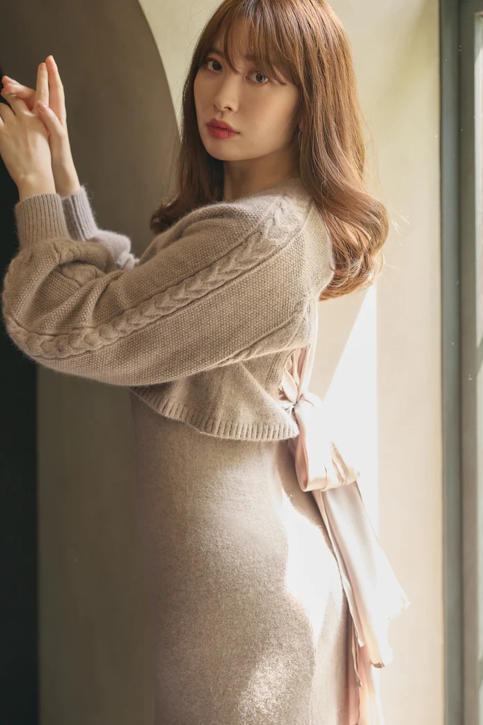 後ろ姿も女性らしく印象的なカーディガンとワンピースのセット。