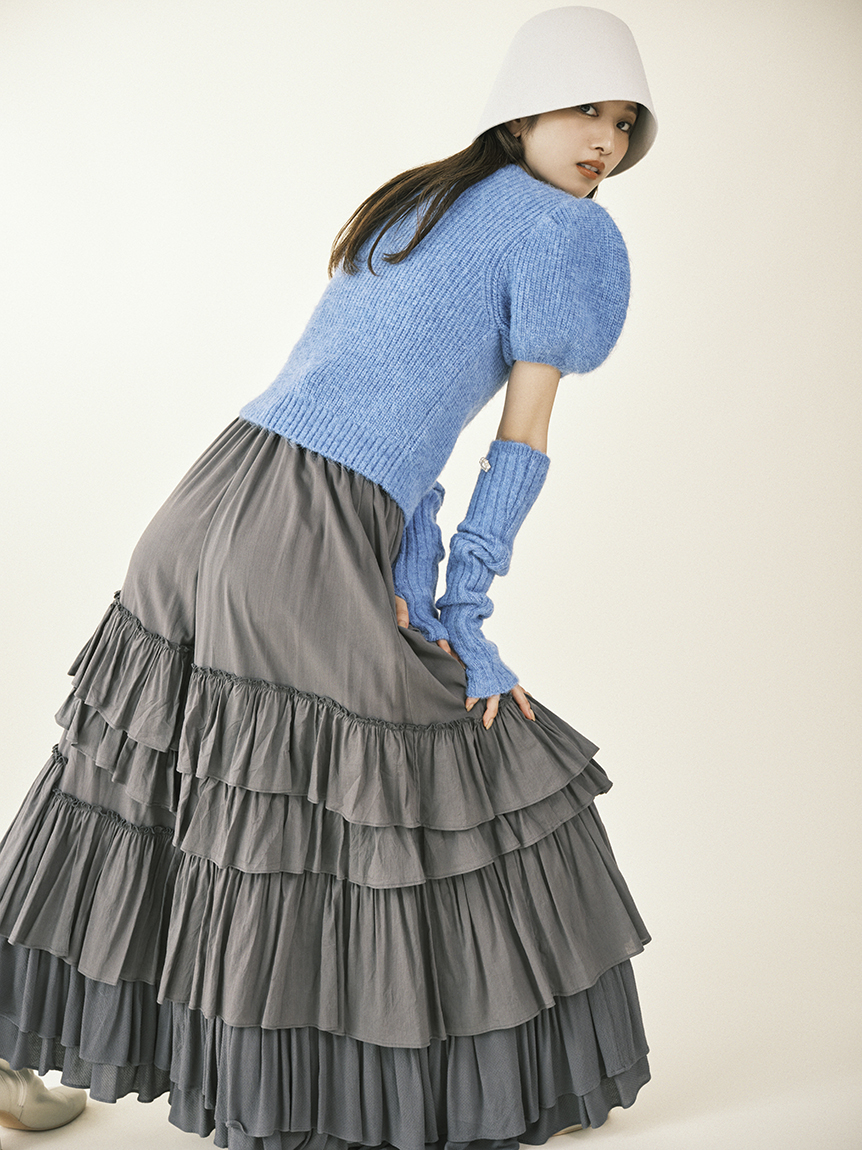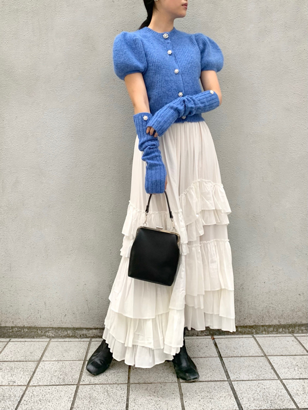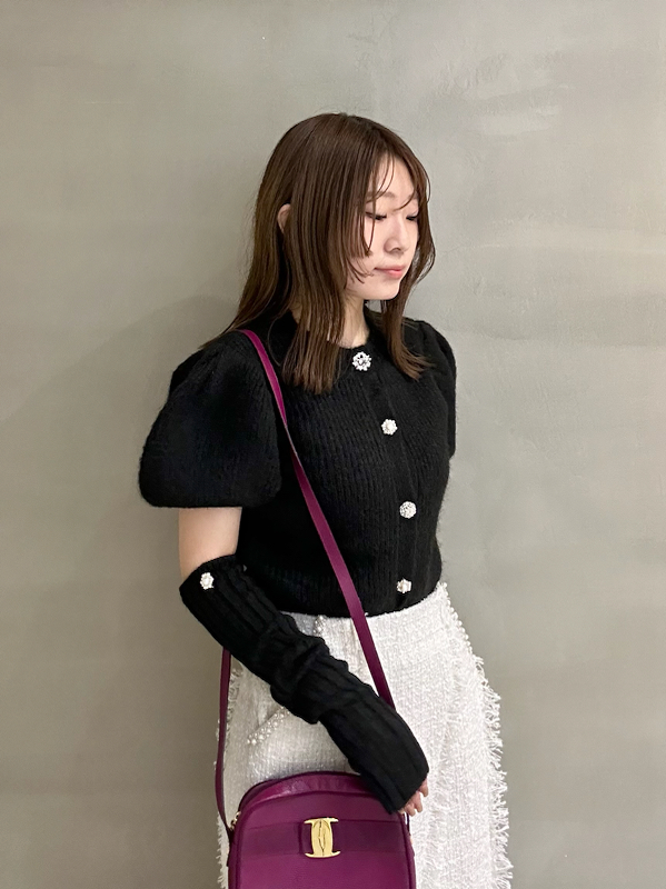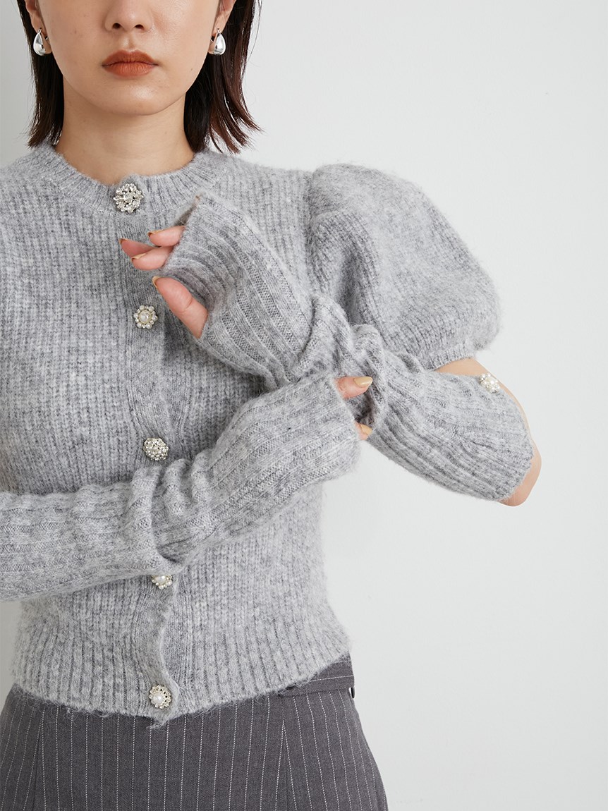 ボリュームのあるパフスリーブがポイントになったニットカーディガンとアームウォーマーのセット。どちらのアイテムにもリュクスなビジューボタンをあしらうことで、上品フェミニンに仕上げました。カーディガンは半袖なので初秋から着られ、アームウォーマーをプラスすれば寒い季節もカバーできる優秀な1着。アームウォーマーは長めに仕立てているので少しクシュっとさせてニュアンスたっぷりに。フィンガーレスで携帯の操作などもしやすく、実用性もしっかりと押さえています。