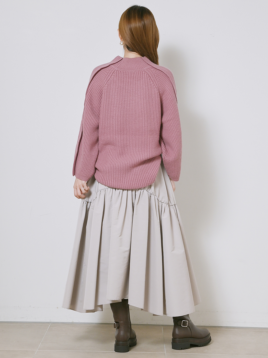 大胆で個性のある切り替えデザインが特徴的な、モード感溢れるニットプルオーバー。デコルテ部分のセンシュアルな肌見せで、カジュアルながらも女性らしさのある1着に仕上げました。シルエットは程よくゆるめのラインでスタイリングに抜け感をプラス。カジュアルなMA-1から、フェミニンなチュールスカートまで幅広いアイテムとマッチし、見た目以上に着まわし力の高い万能アイテムです。