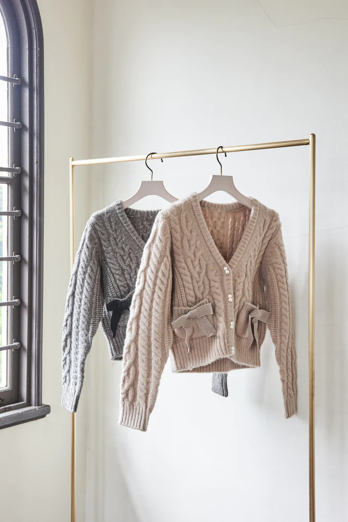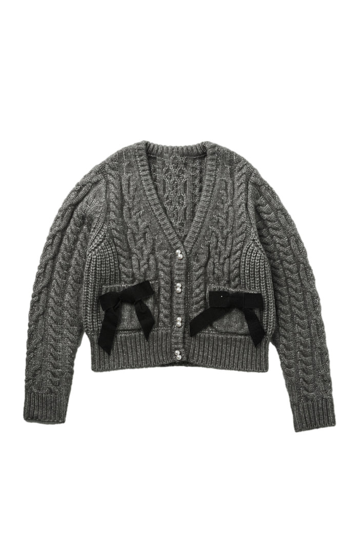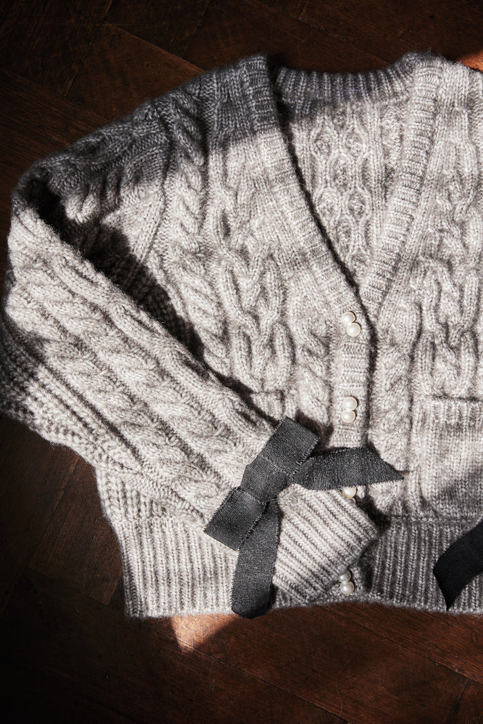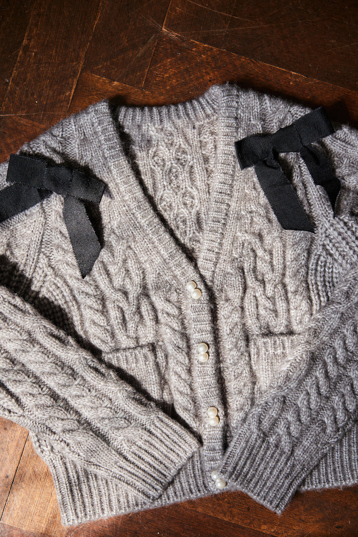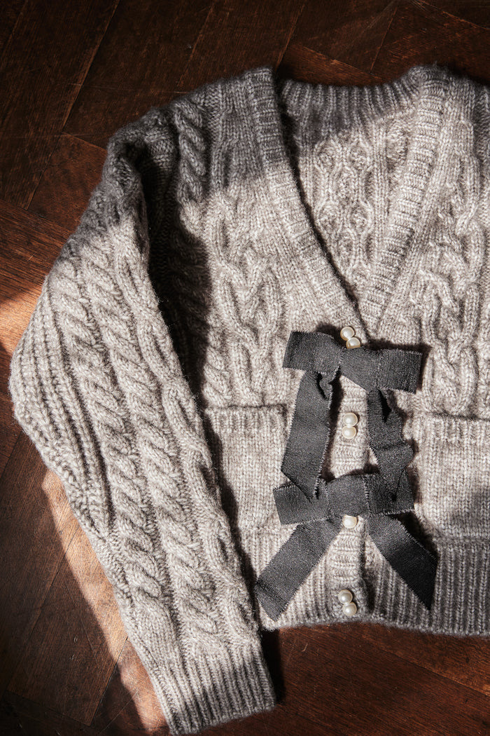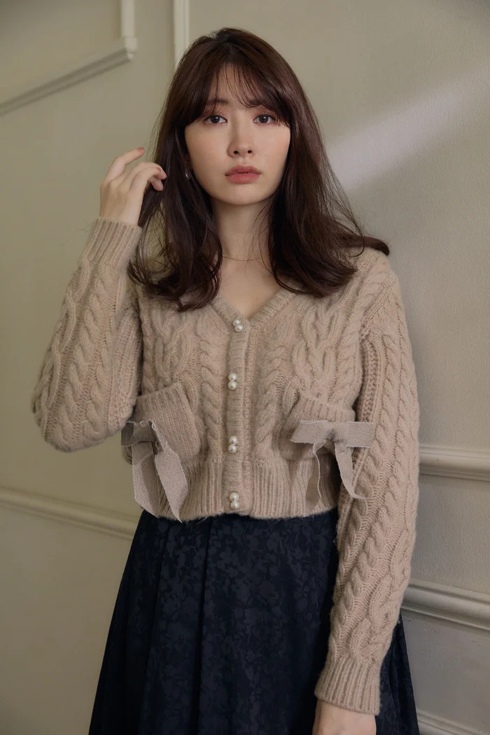 Wパールボタンが印象的な上品なメランジ糸を使ったケーブルニットカーディガン。