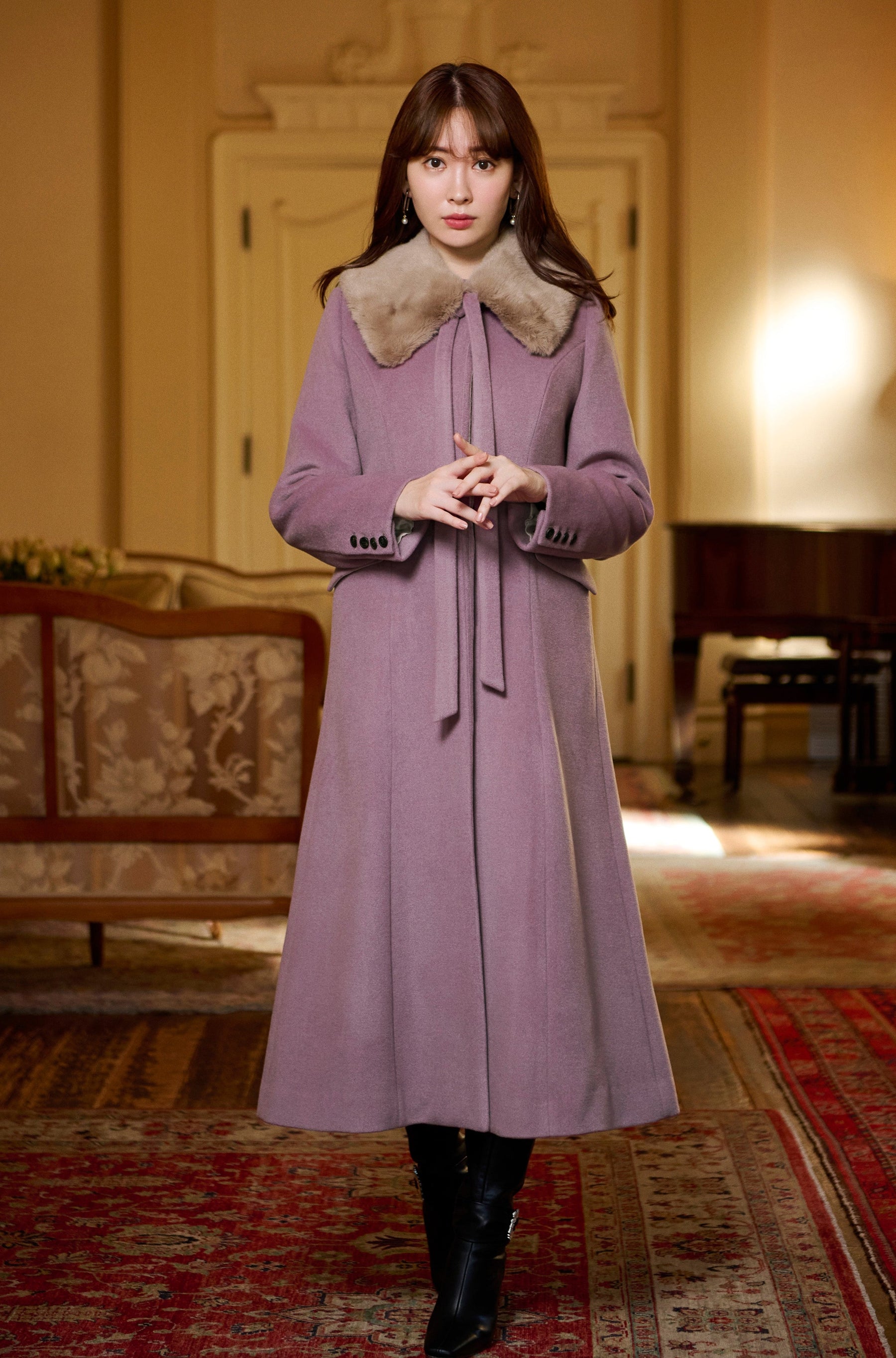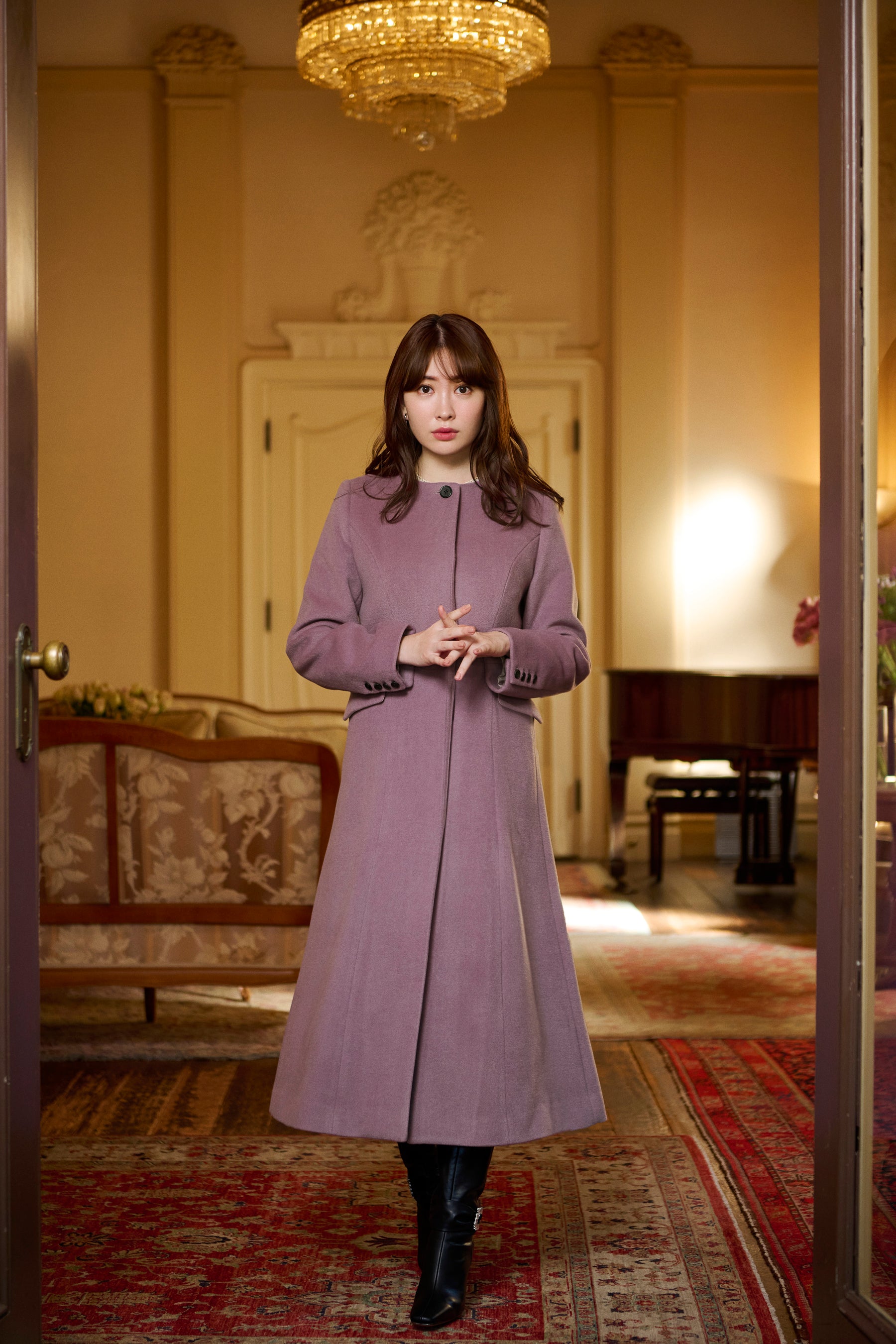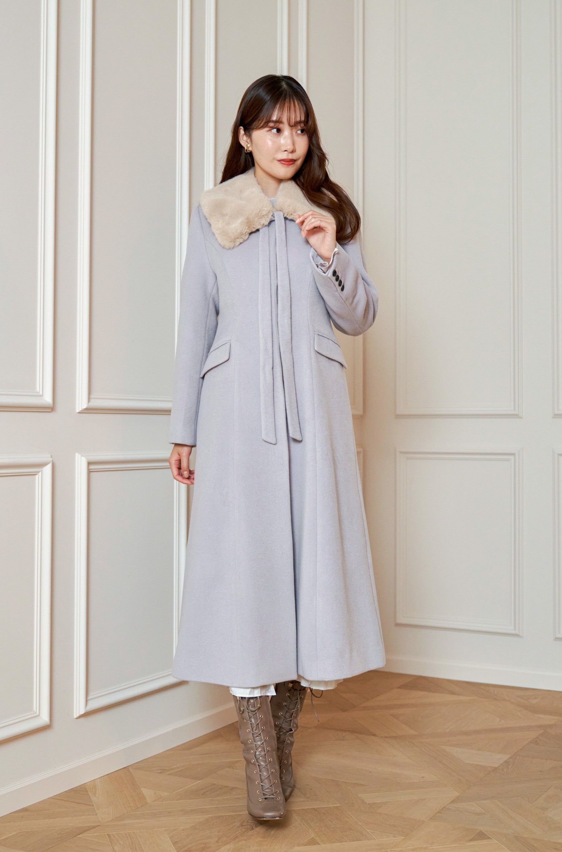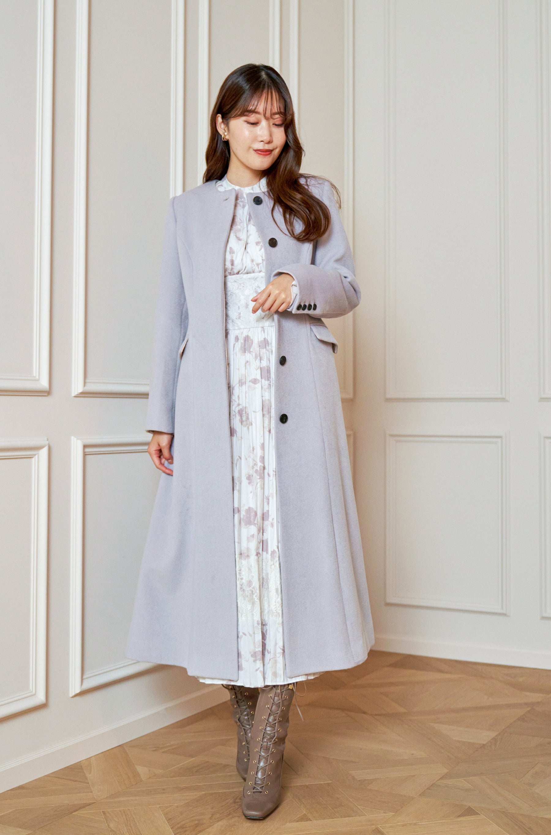 ノーカラーがとても使いやすい細身シルエットのティペット付き2wayロングコート。