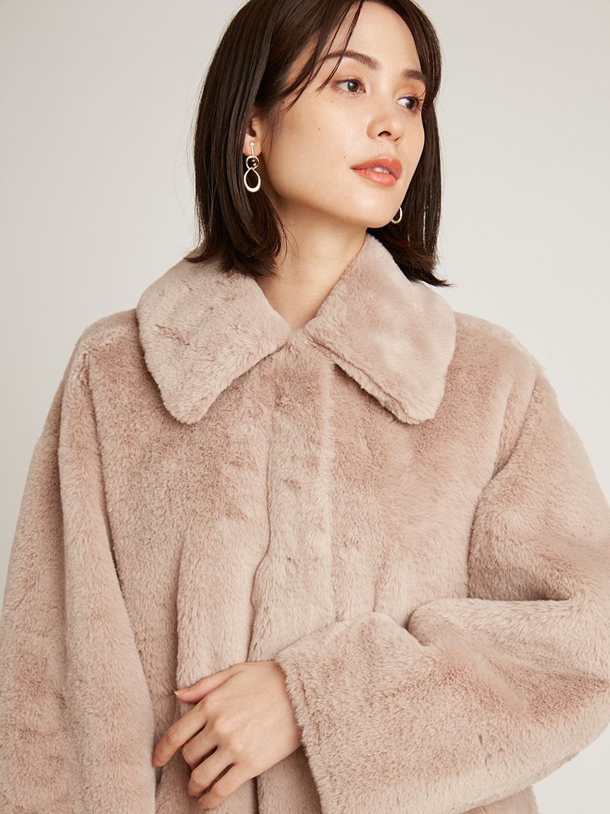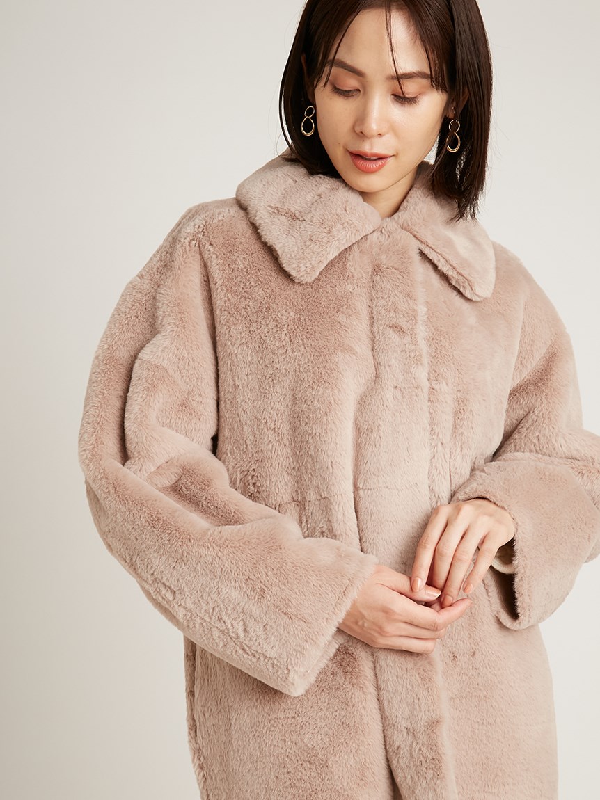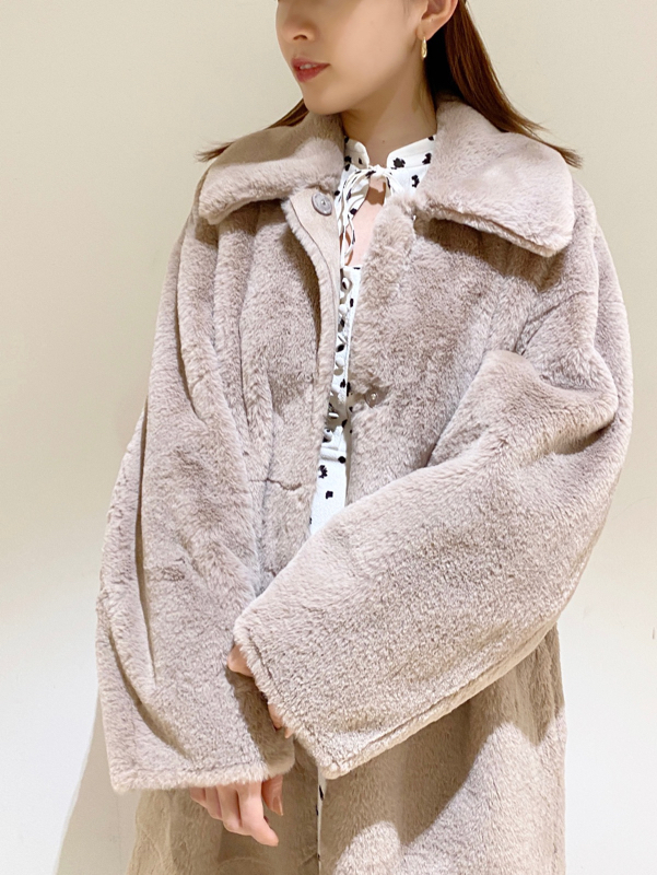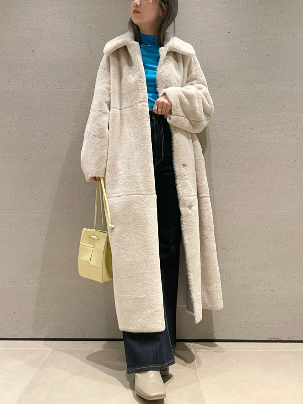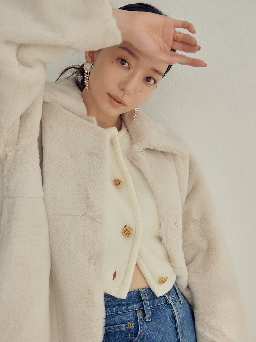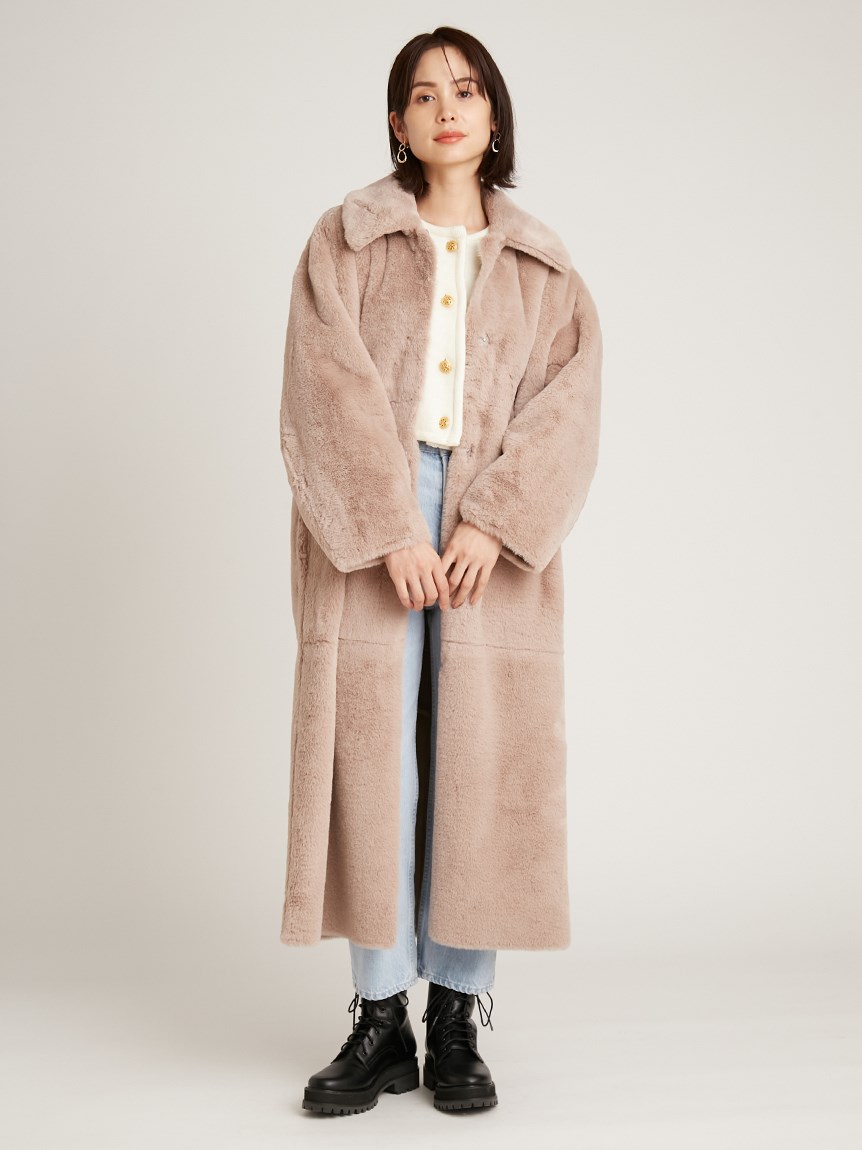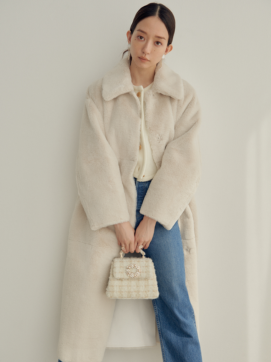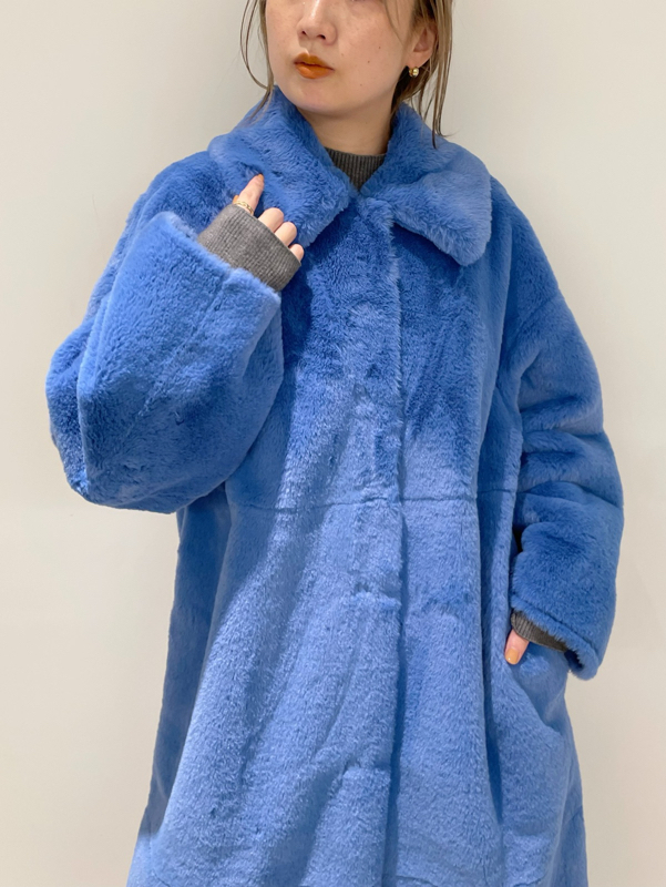 表地のファーはリサイクルポリエステル100%使用。裏地にフェイクスエードを張り合わせ、軽い着心地に仕立てました。優しい色合いで着まわしやすいアイボリー、ピンクベージュに、鮮やかな色合いで差し色にぴったりなブルーを加えた3色をご用意。