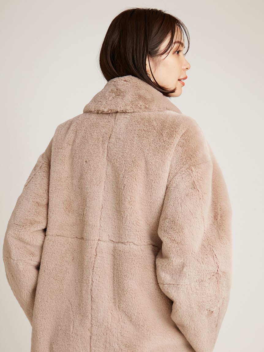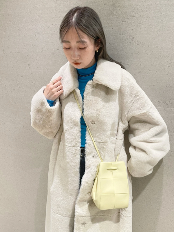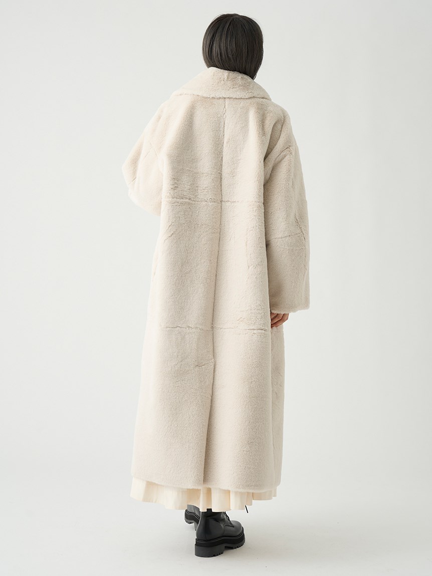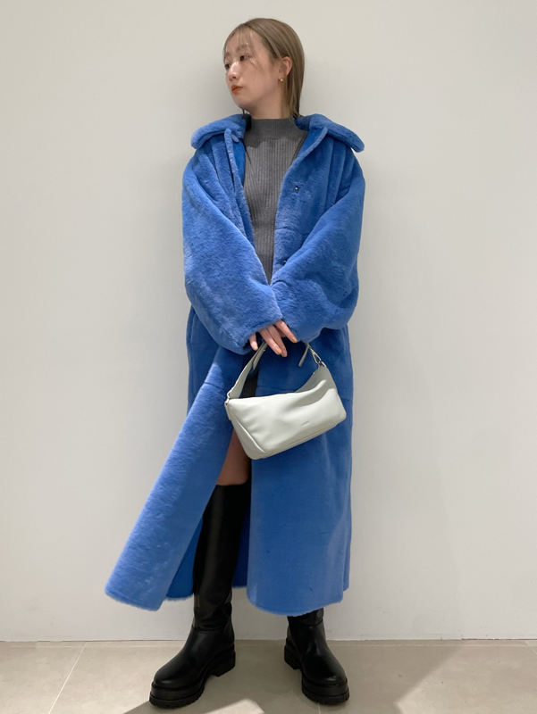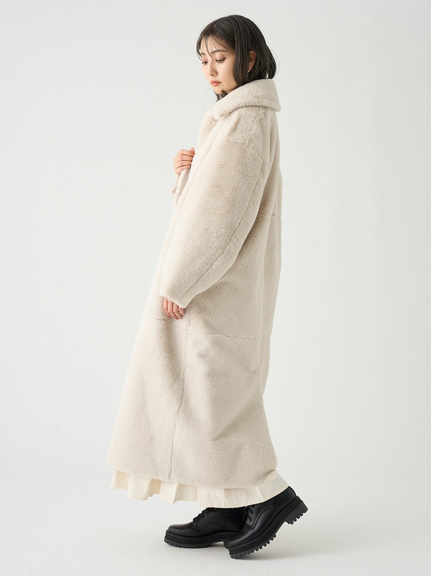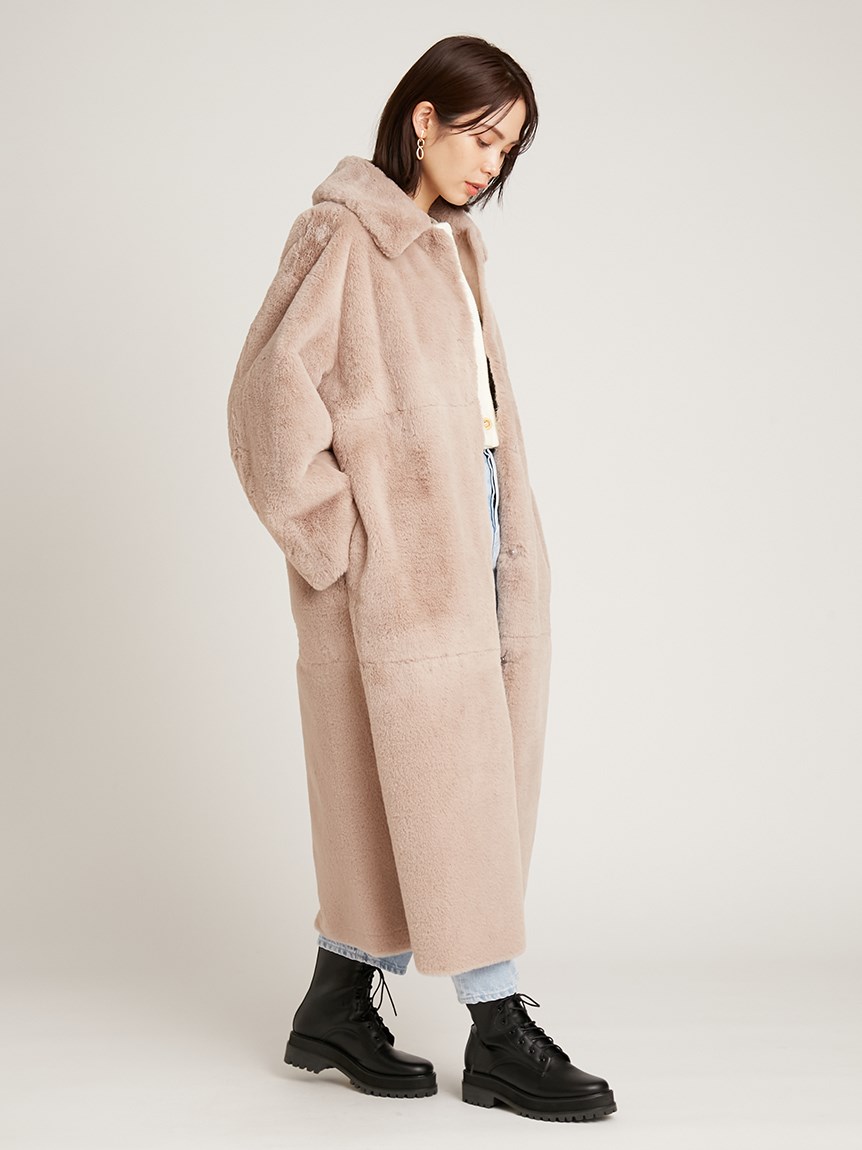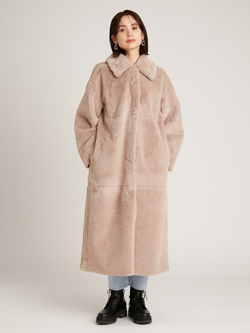 表地のファーはリサイクルポリエステル100%使用。裏地にフェイクスエードを張り合わせ、軽い着心地に仕立てました。優しい色合いで着まわしやすいアイボリー、ピンクベージュに、鮮やかな色合いで差し色にぴったりなブルーを加えた3色をご用意。
