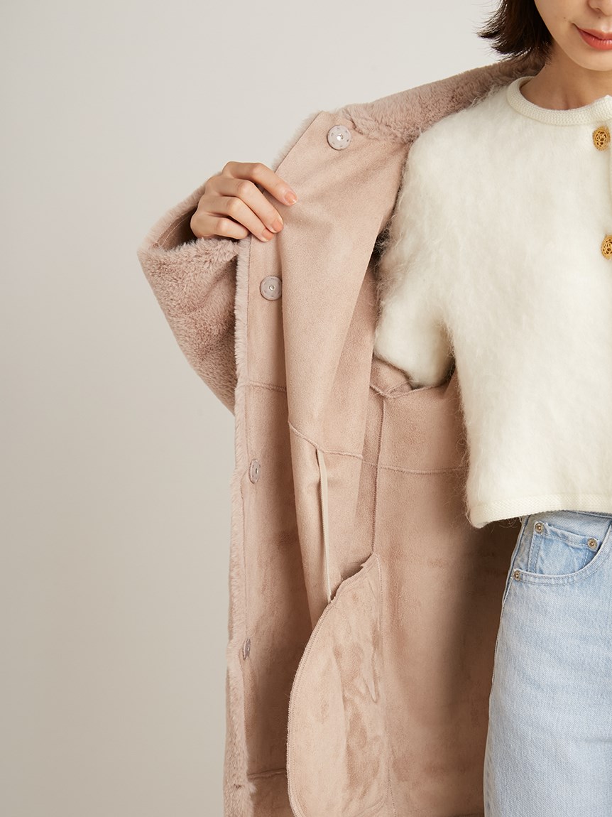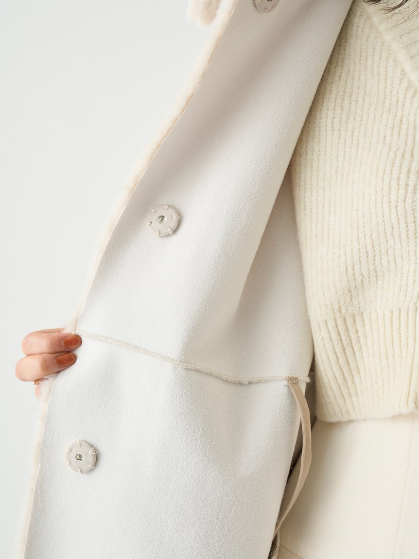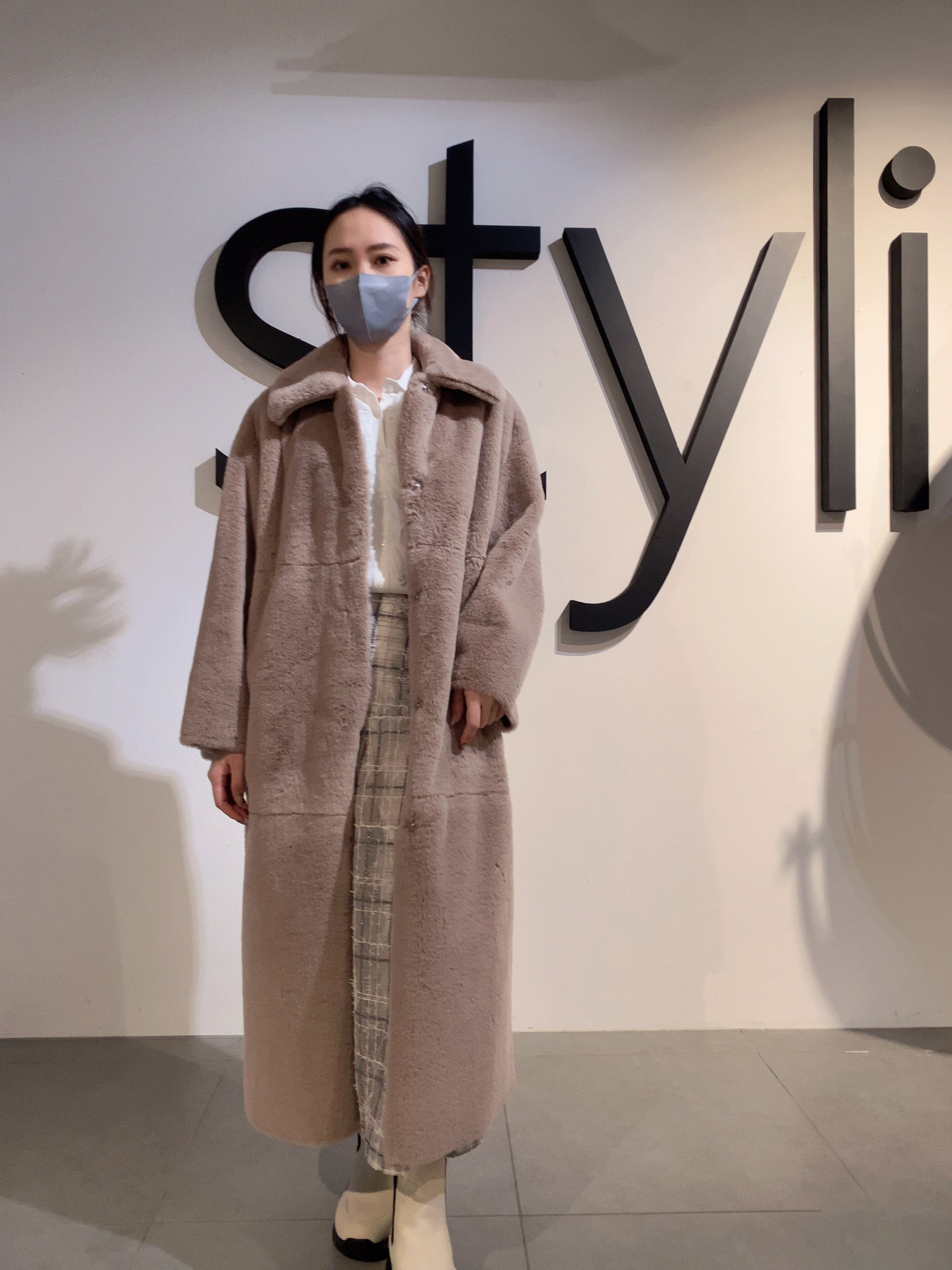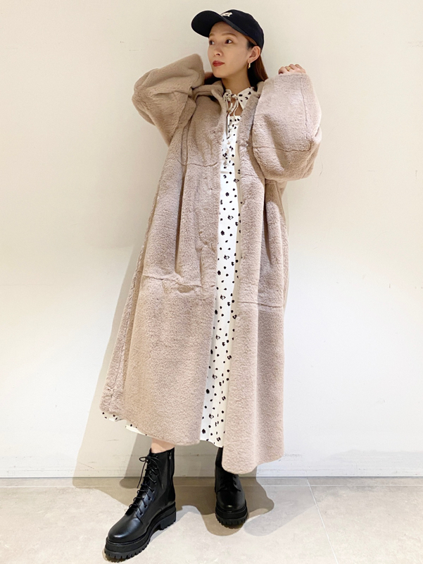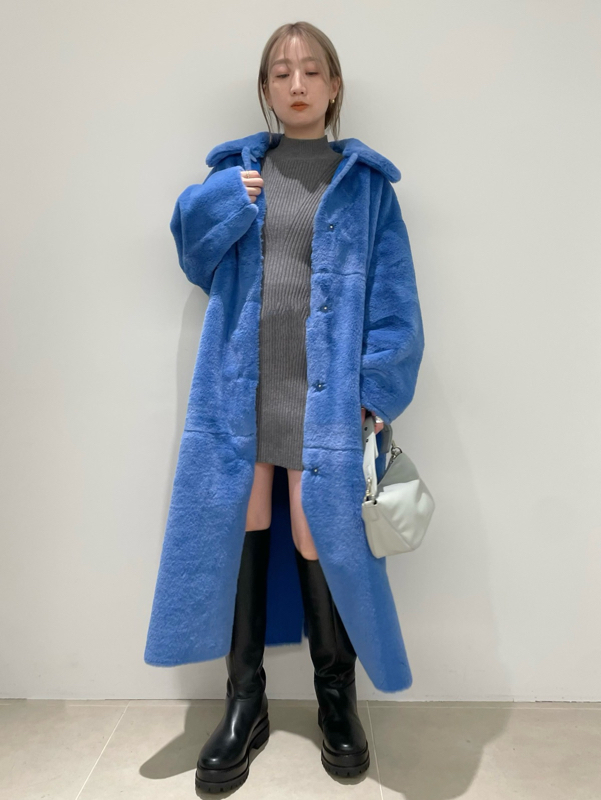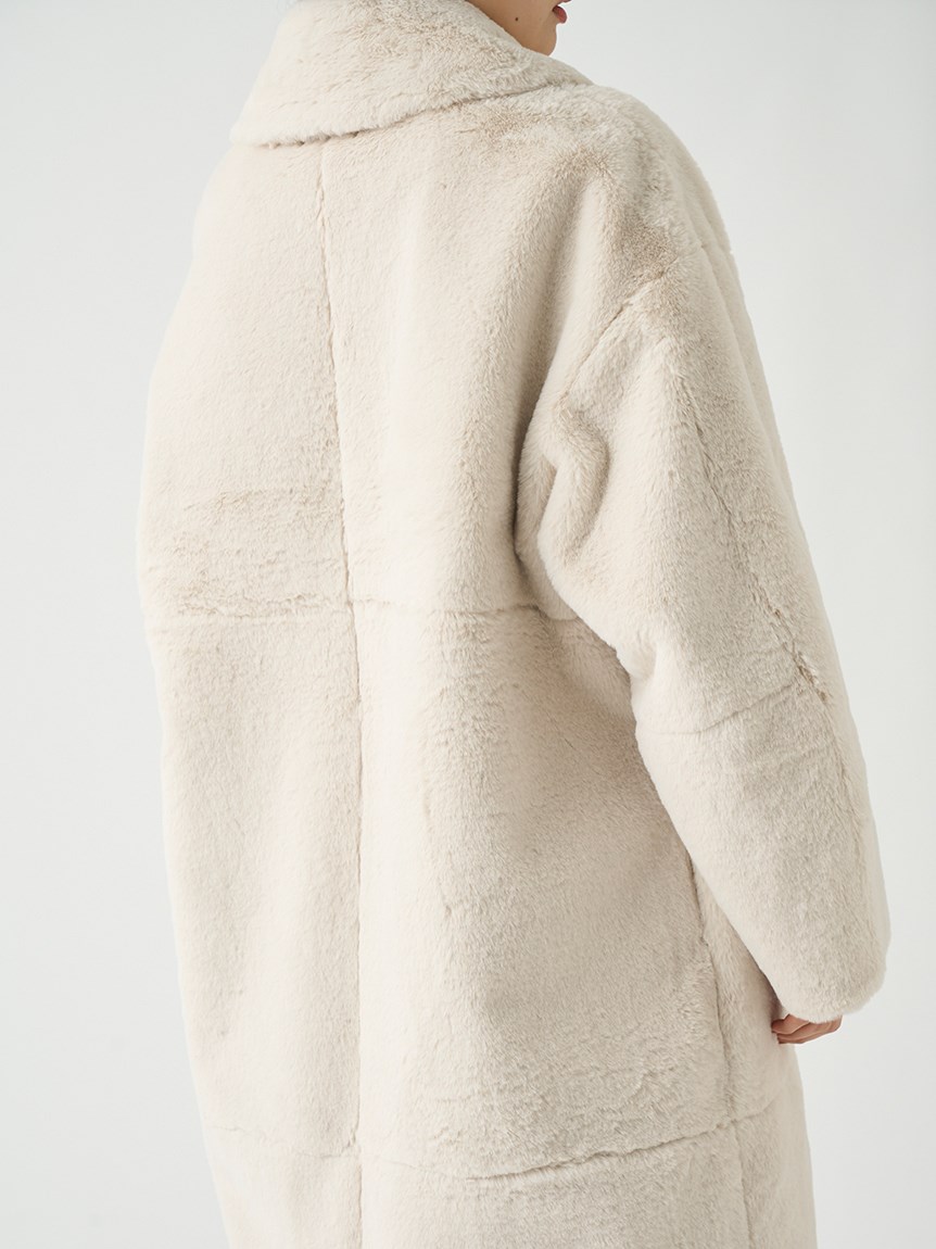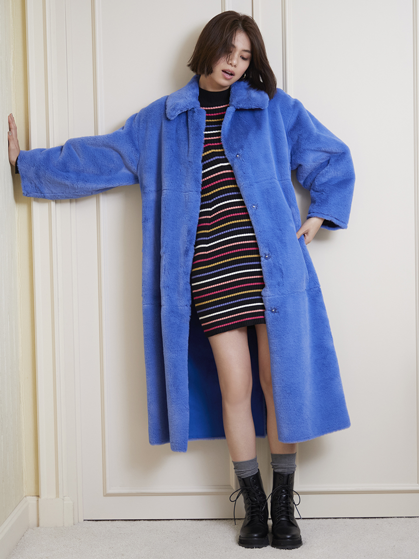 表地のファーはリサイクルポリエステル100%使用。裏地にフェイクスエードを張り合わせ、軽い着心地に仕立てました。優しい色合いで着まわしやすいアイボリー、ピンクベージュに、鮮やかな色合いで差し色にぴったりなブルーを加えた3色をご用意。