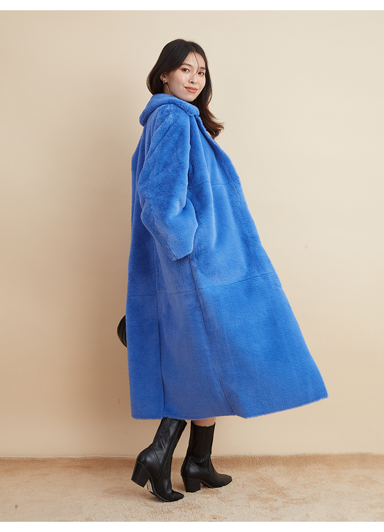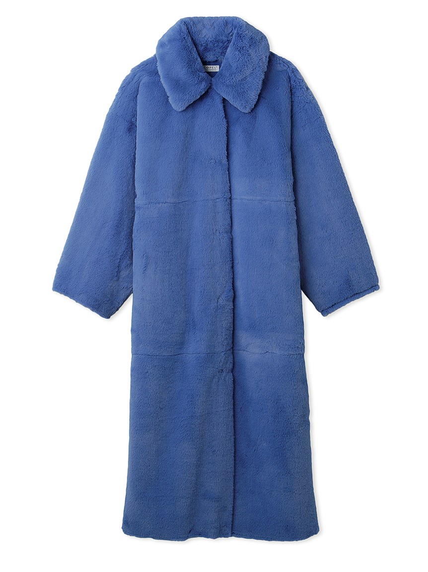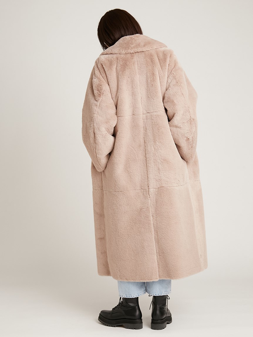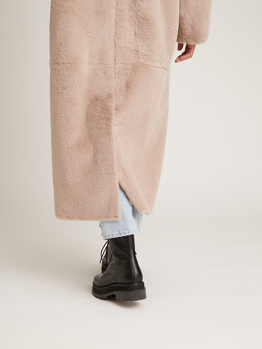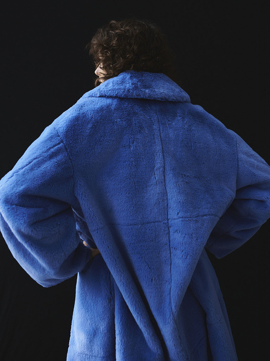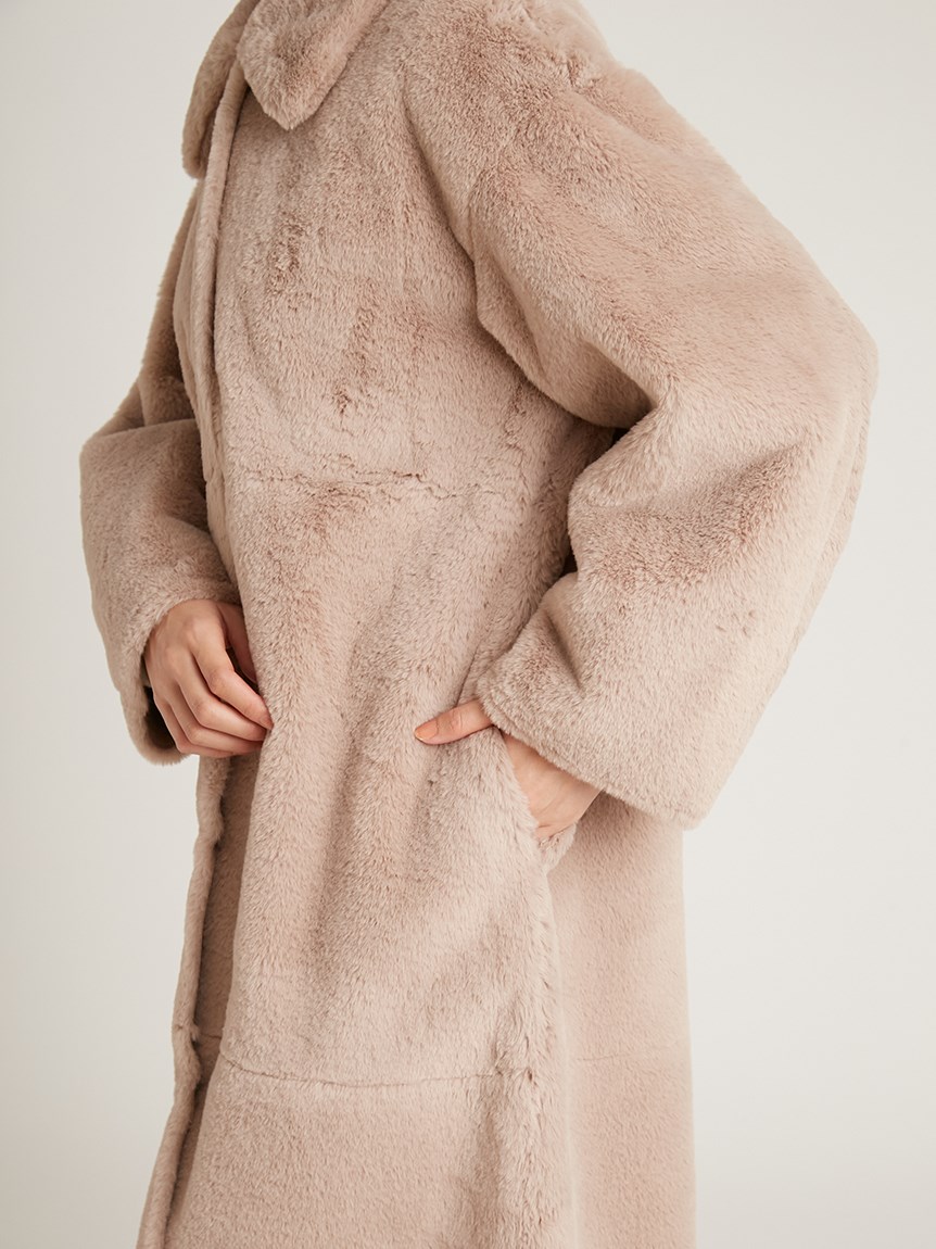 表地のファーはリサイクルポリエステル100%使用。裏地にフェイクスエードを張り合わせ、軽い着心地に仕立てました。優しい色合いで着まわしやすいアイボリー、ピンクベージュに、鮮やかな色合いで差し色にぴったりなブルーを加えた3色をご用意。