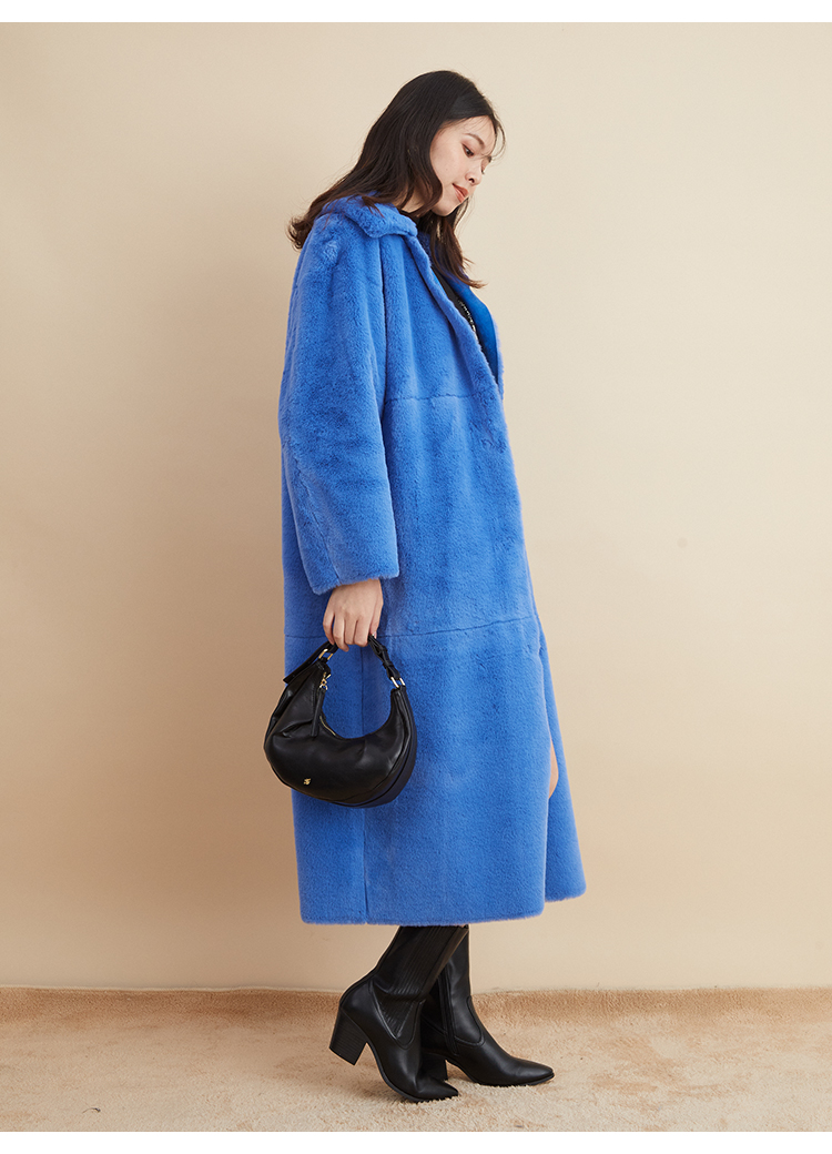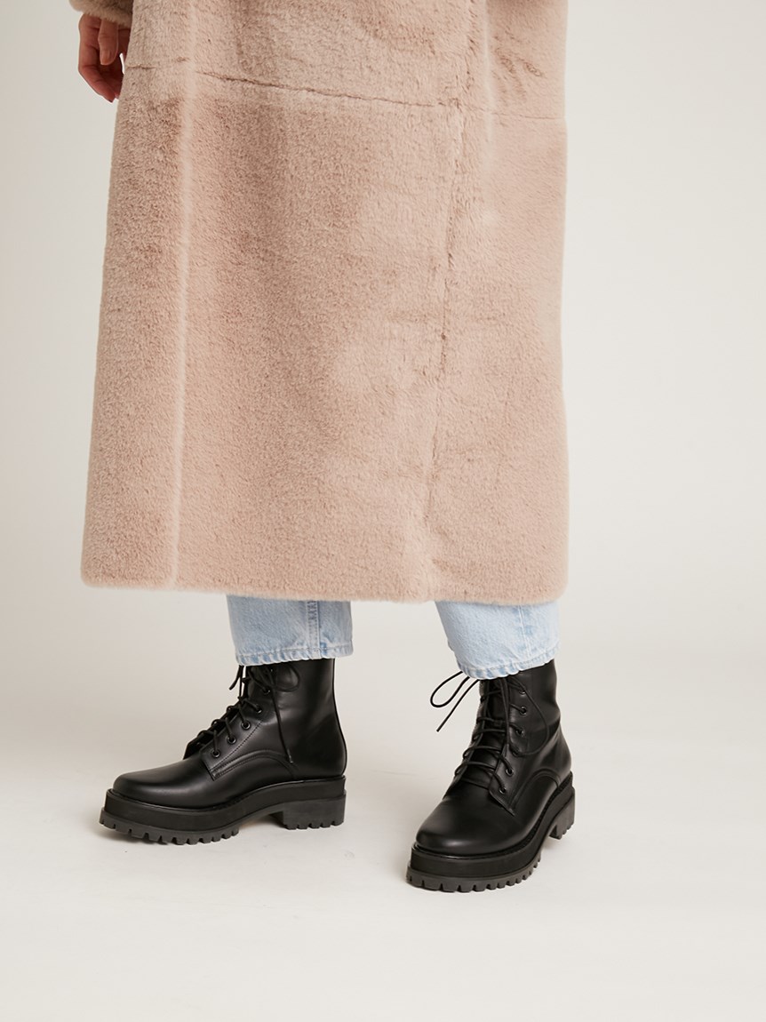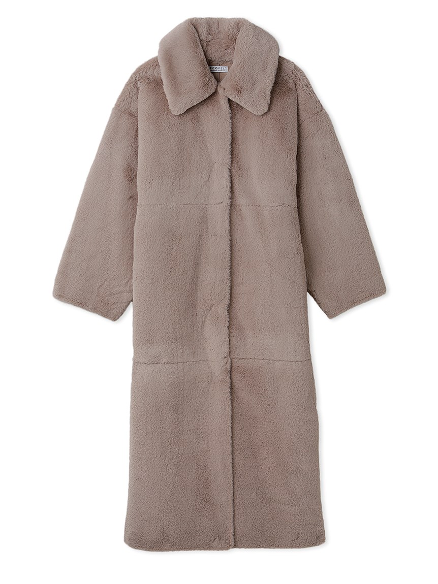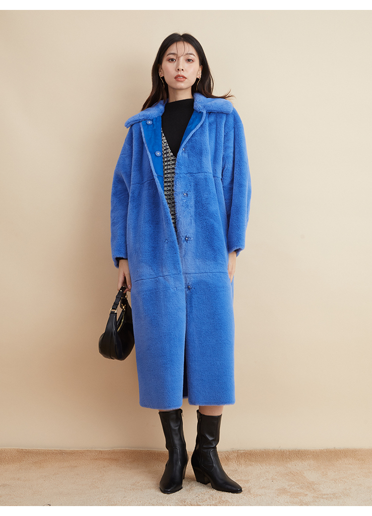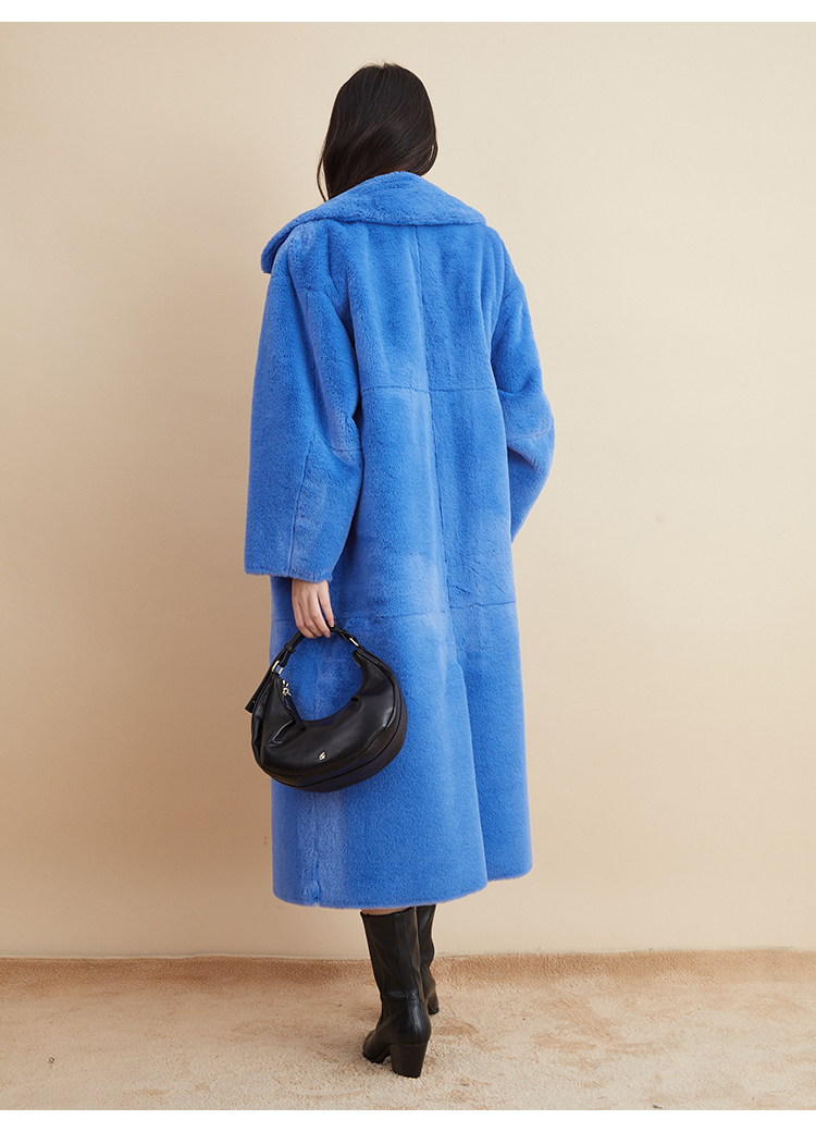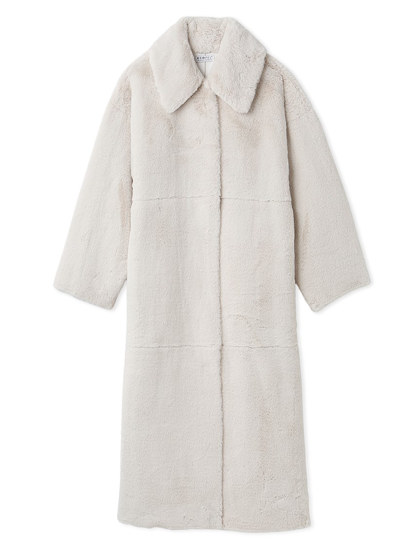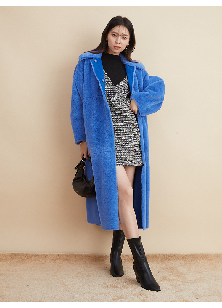 表地のファーはリサイクルポリエステル100%使用。裏地にフェイクスエードを張り合わせ、軽い着心地に仕立てました。優しい色合いで着まわしやすいアイボリー、ピンクベージュに、鮮やかな色合いで差し色にぴったりなブルーを加えた3色をご用意。