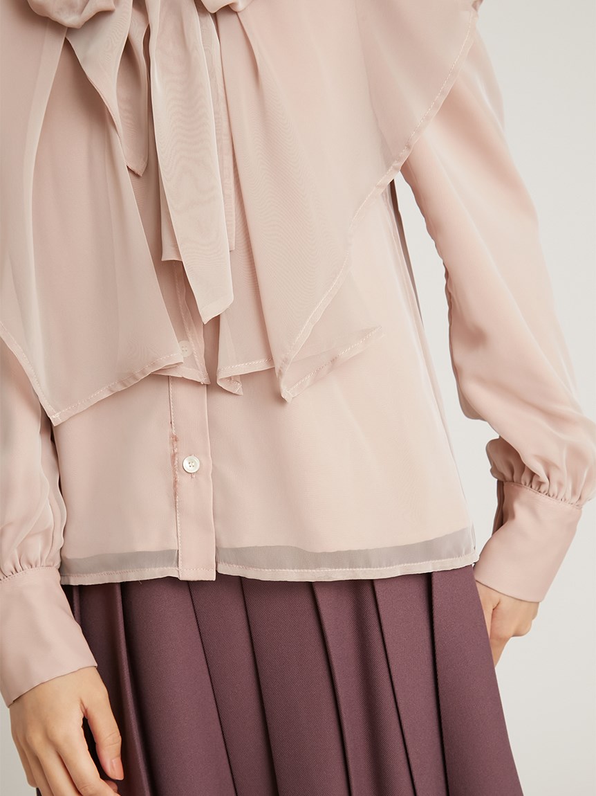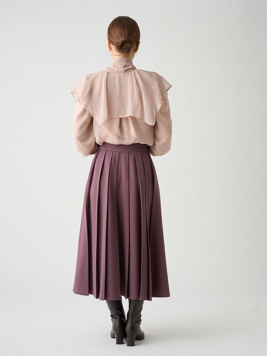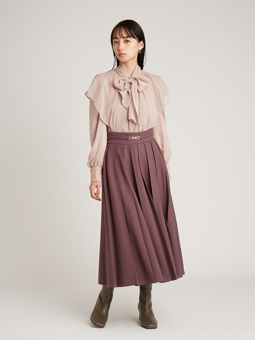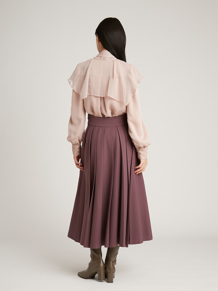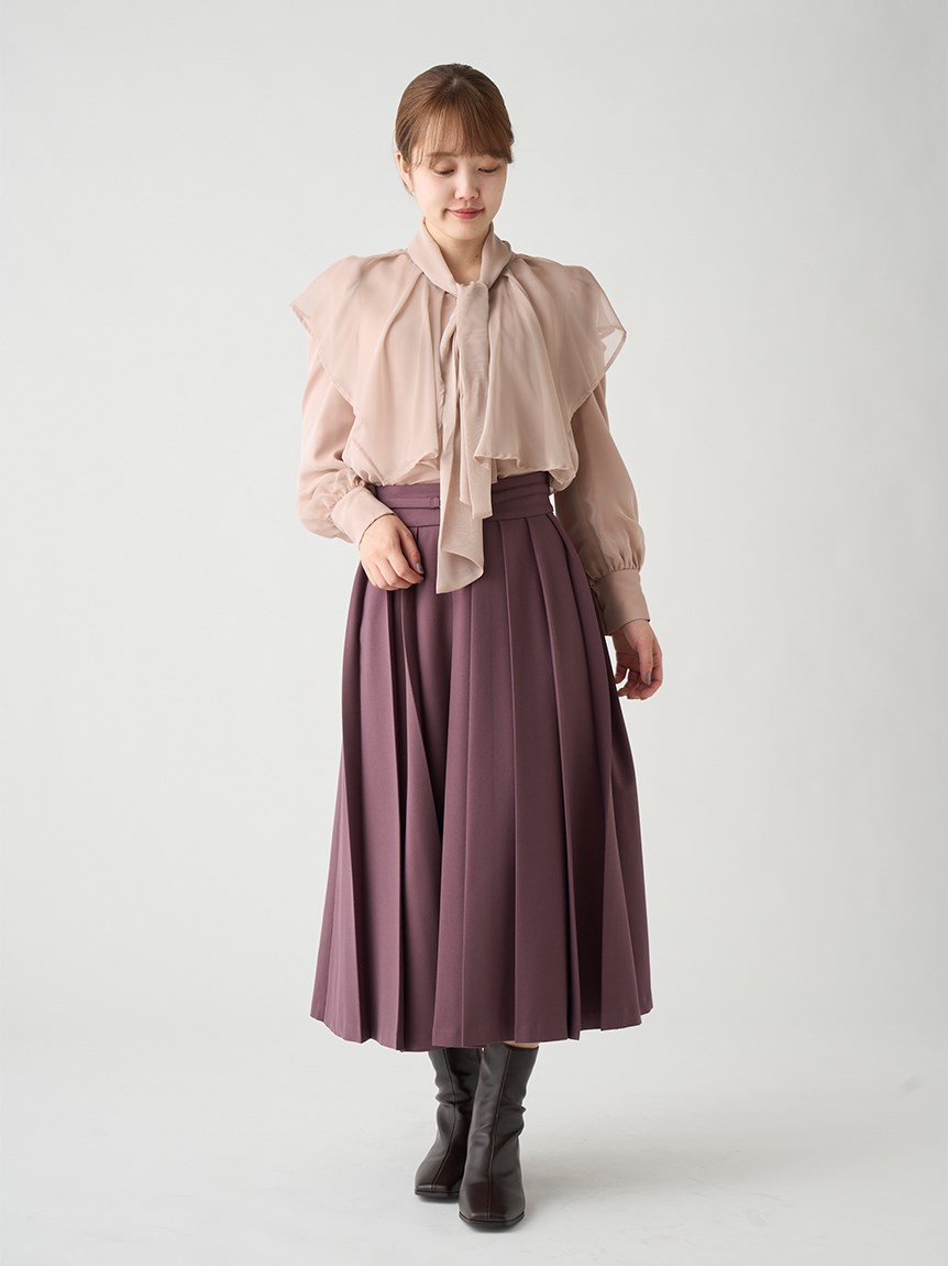 エレガントに波打つ大きめのデザインカラーが印象的なブラウス。首元から垂らしたボウタイも相まって、女性らしさを高めてくれる上品な1着です。軽やかな素材感ながら総裏仕様なので1枚でも着用可能。ビット付きプリーツスカート(SWFS225140)と合わせた王道クラシカルなスタイリングがオススメです。