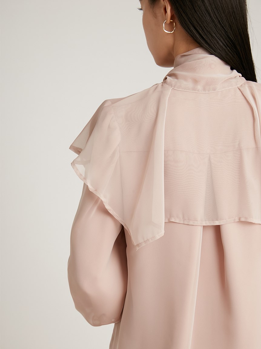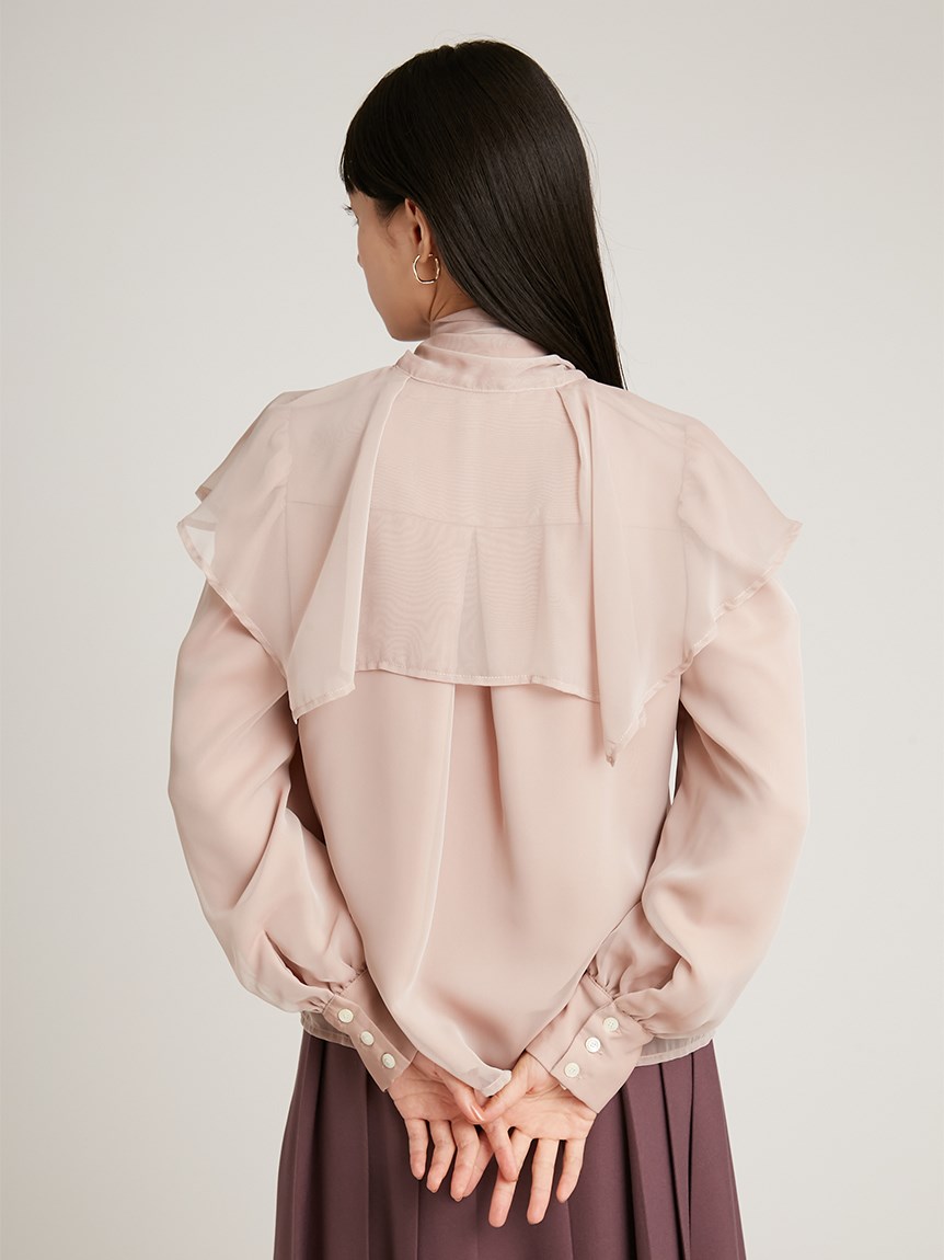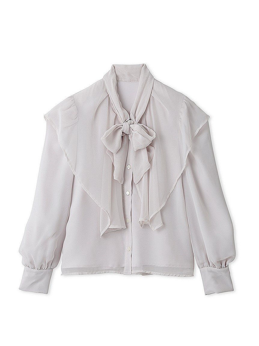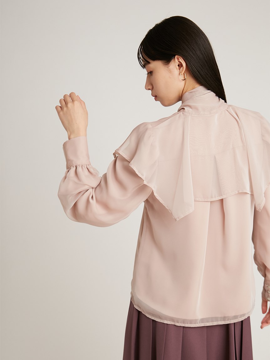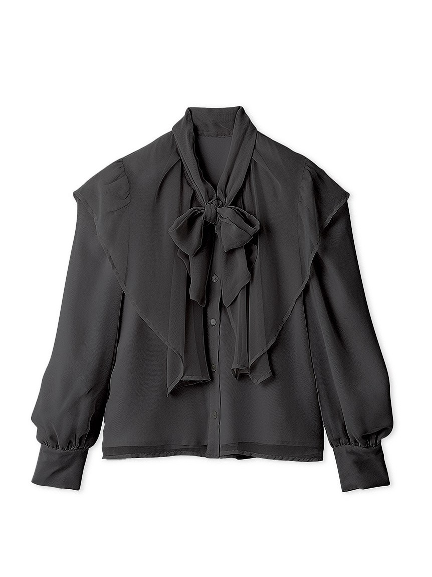 エレガントに波打つ大きめのデザインカラーが印象的なブラウス。首元から垂らしたボウタイも相まって、女性らしさを高めてくれる上品な1着です。軽やかな素材感ながら総裏仕様なので1枚でも着用可能。ビット付きプリーツスカート(SWFS225140)と合わせた王道クラシカルなスタイリングがオススメです。