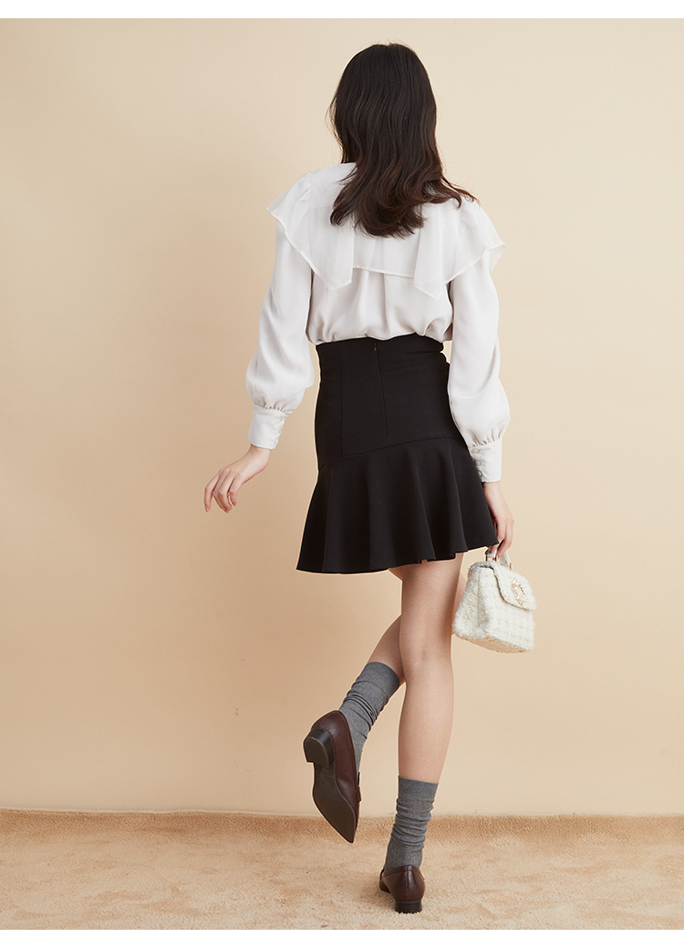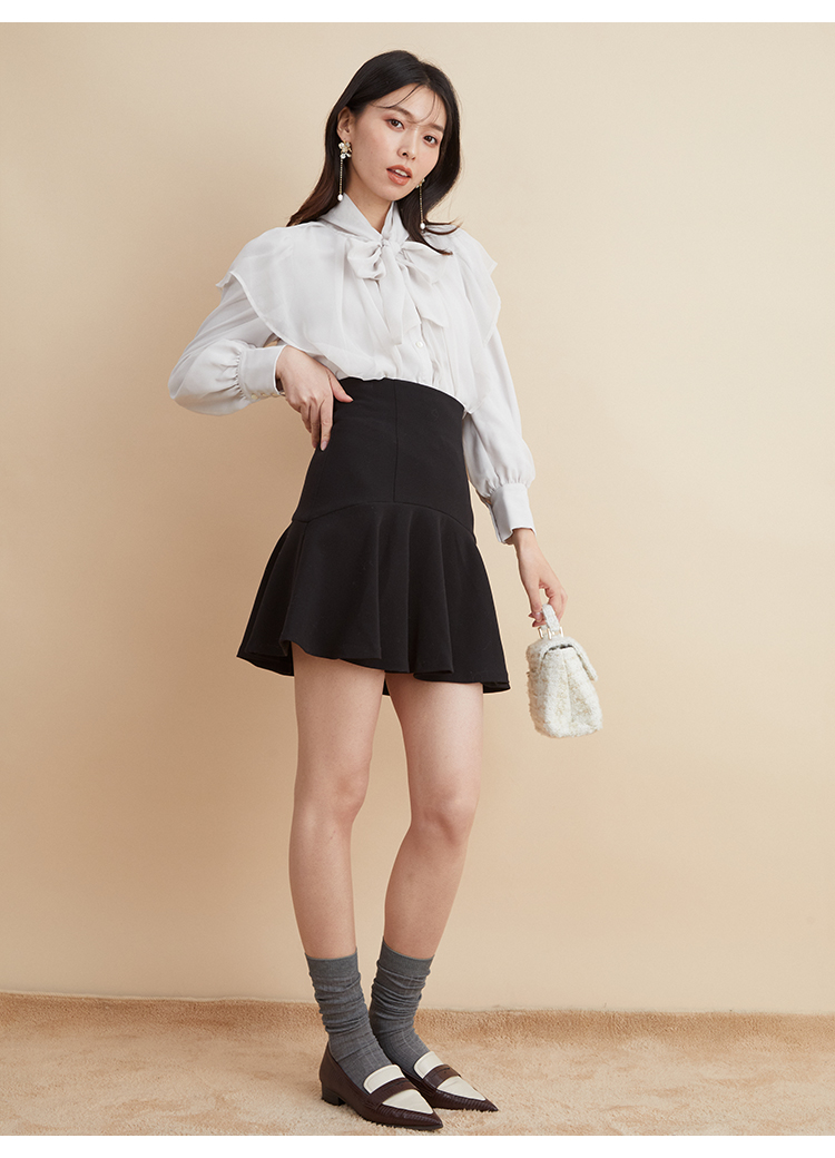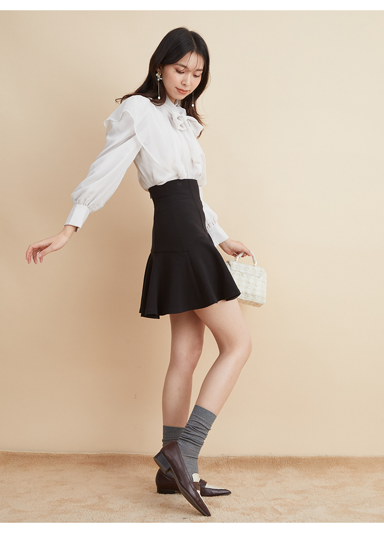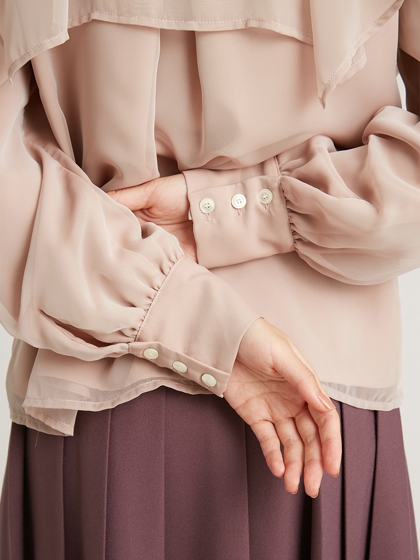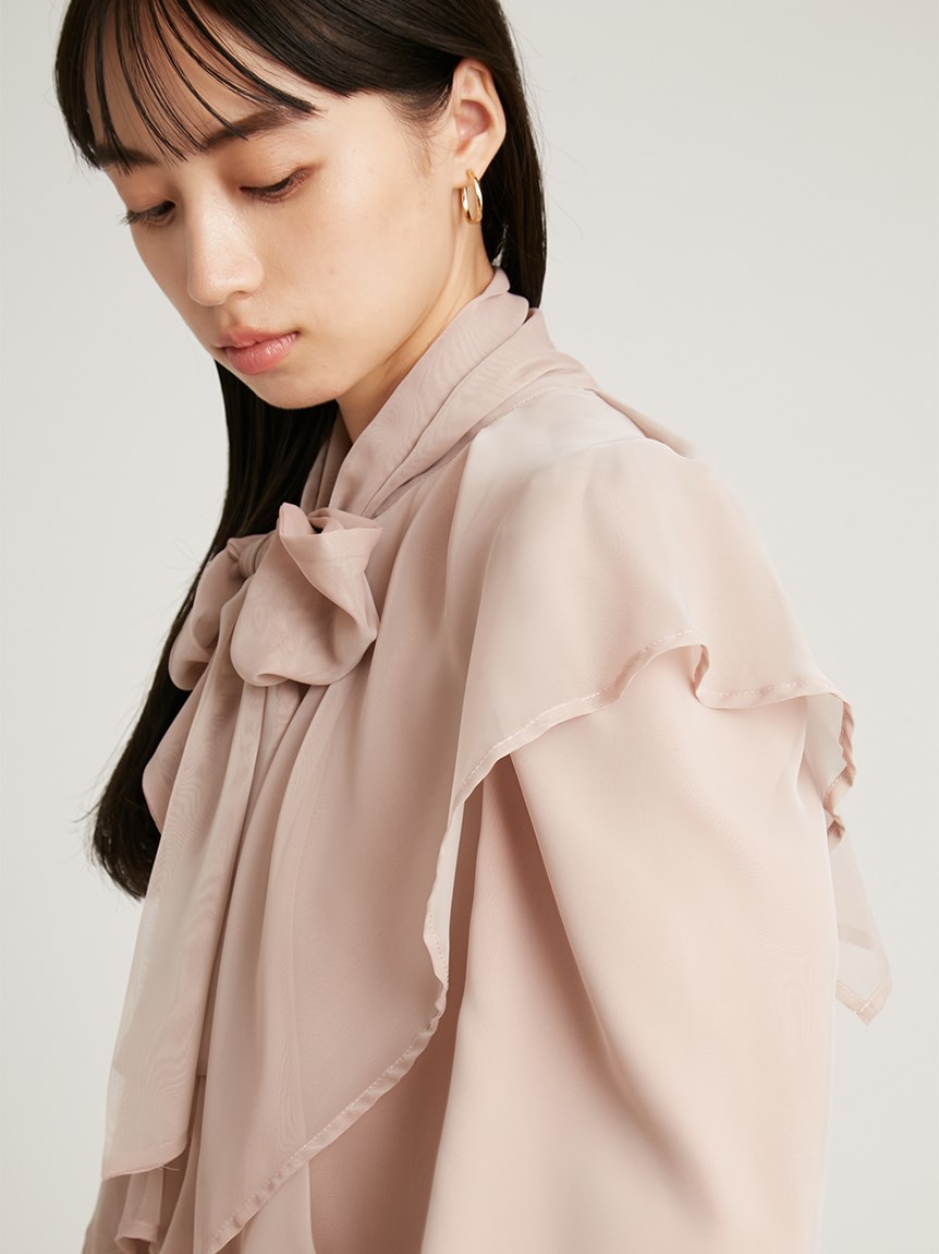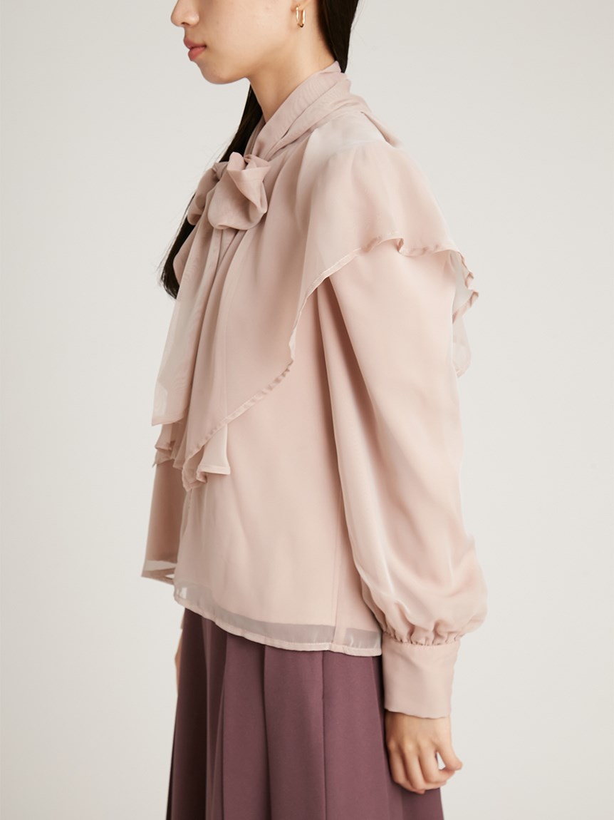 エレガントに波打つ大きめのデザインカラーが印象的なブラウス。首元から垂らしたボウタイも相まって、女性らしさを高めてくれる上品な1着です。軽やかな素材感ながら総裏仕様なので1枚でも着用可能。ビット付きプリーツスカート(SWFS225140)と合わせた王道クラシカルなスタイリングがオススメです。