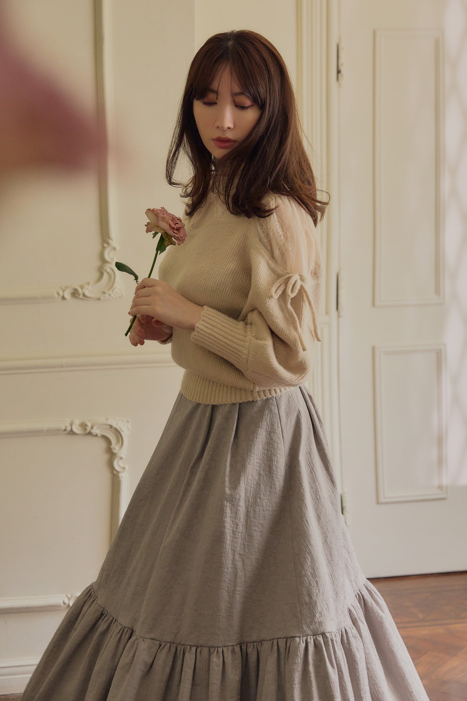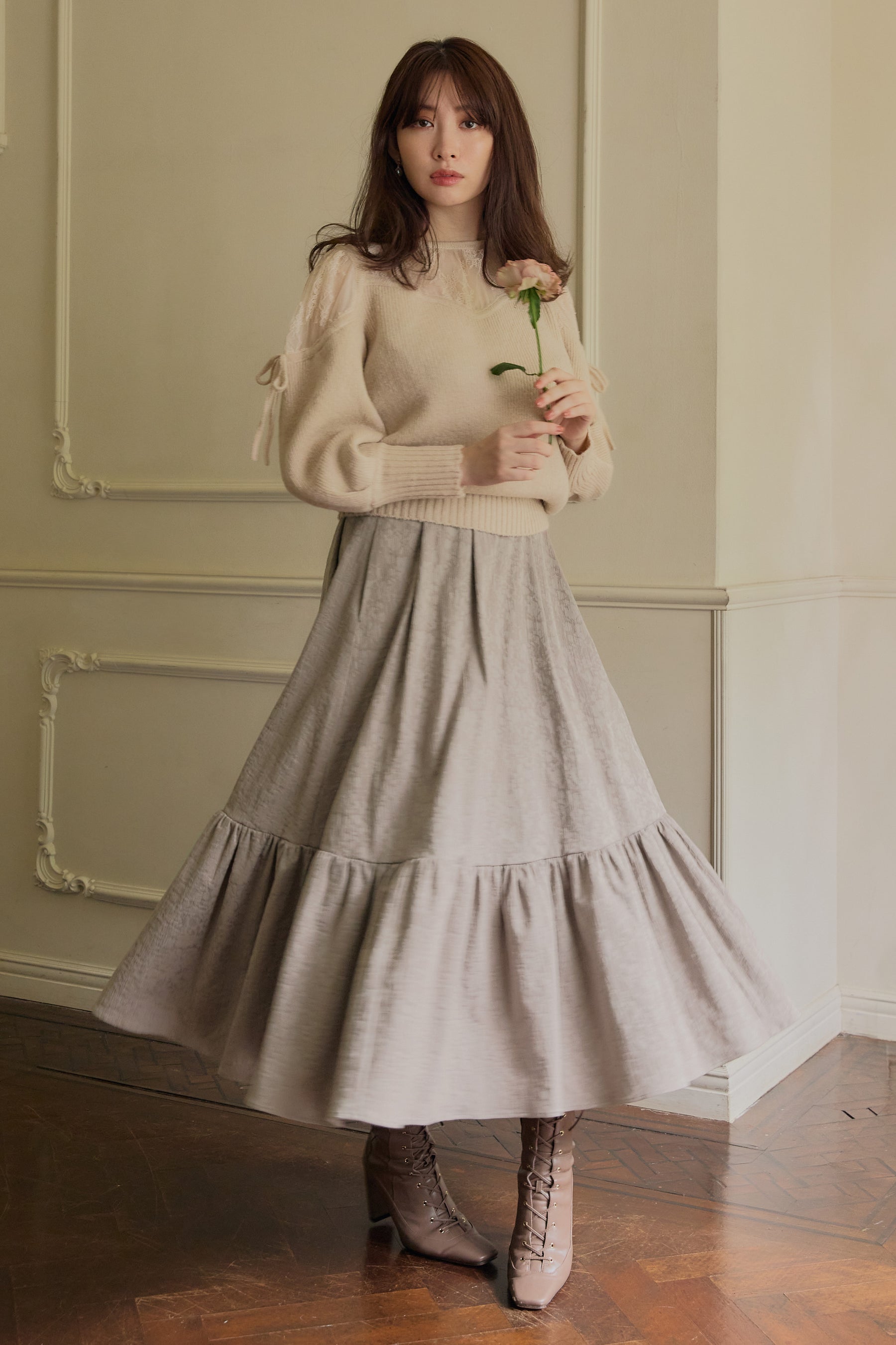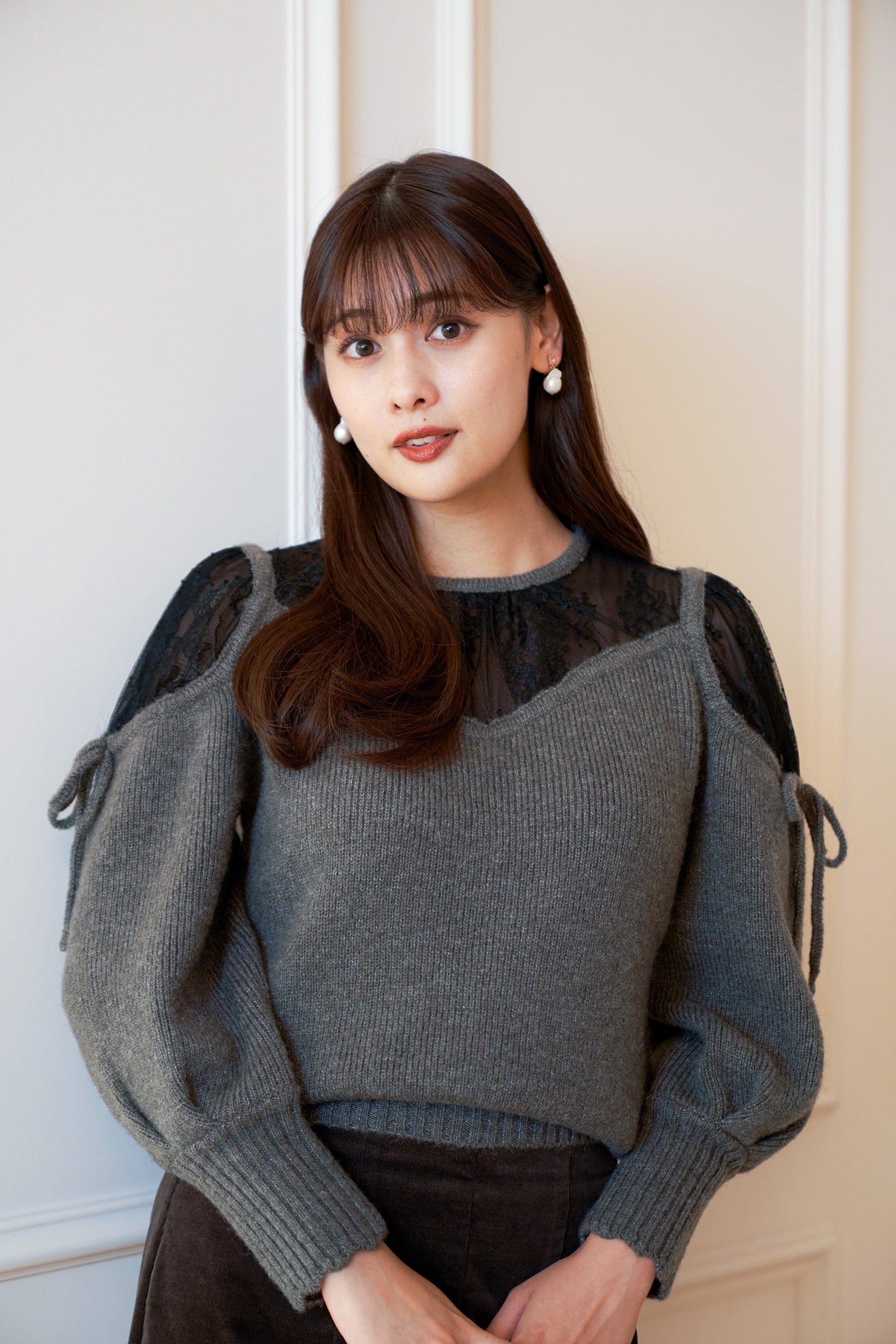 ヨークと肩部分をレース使いにすることにより、程よい肌見せが女性らしく、秋冬の気分を高めてくれます。
