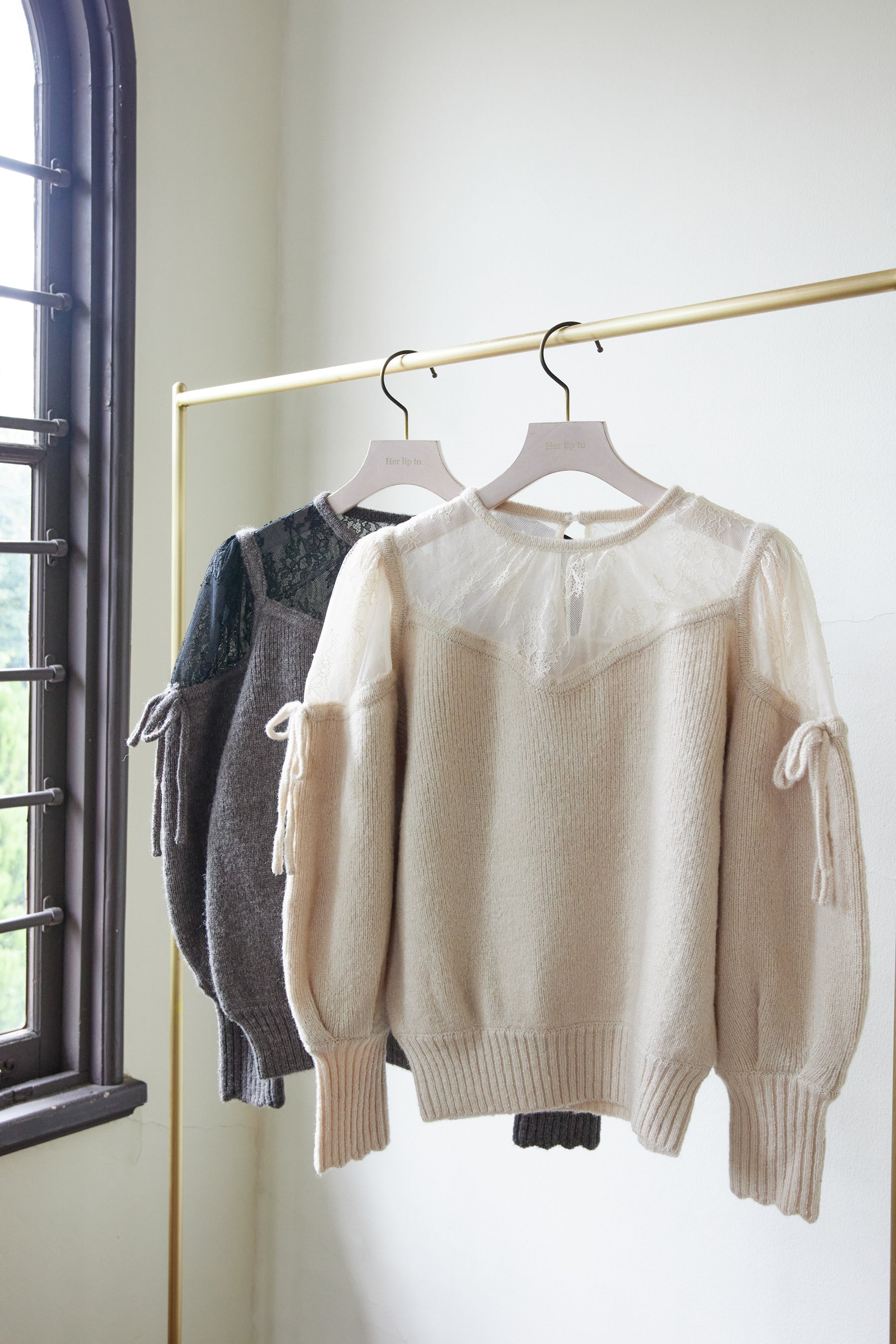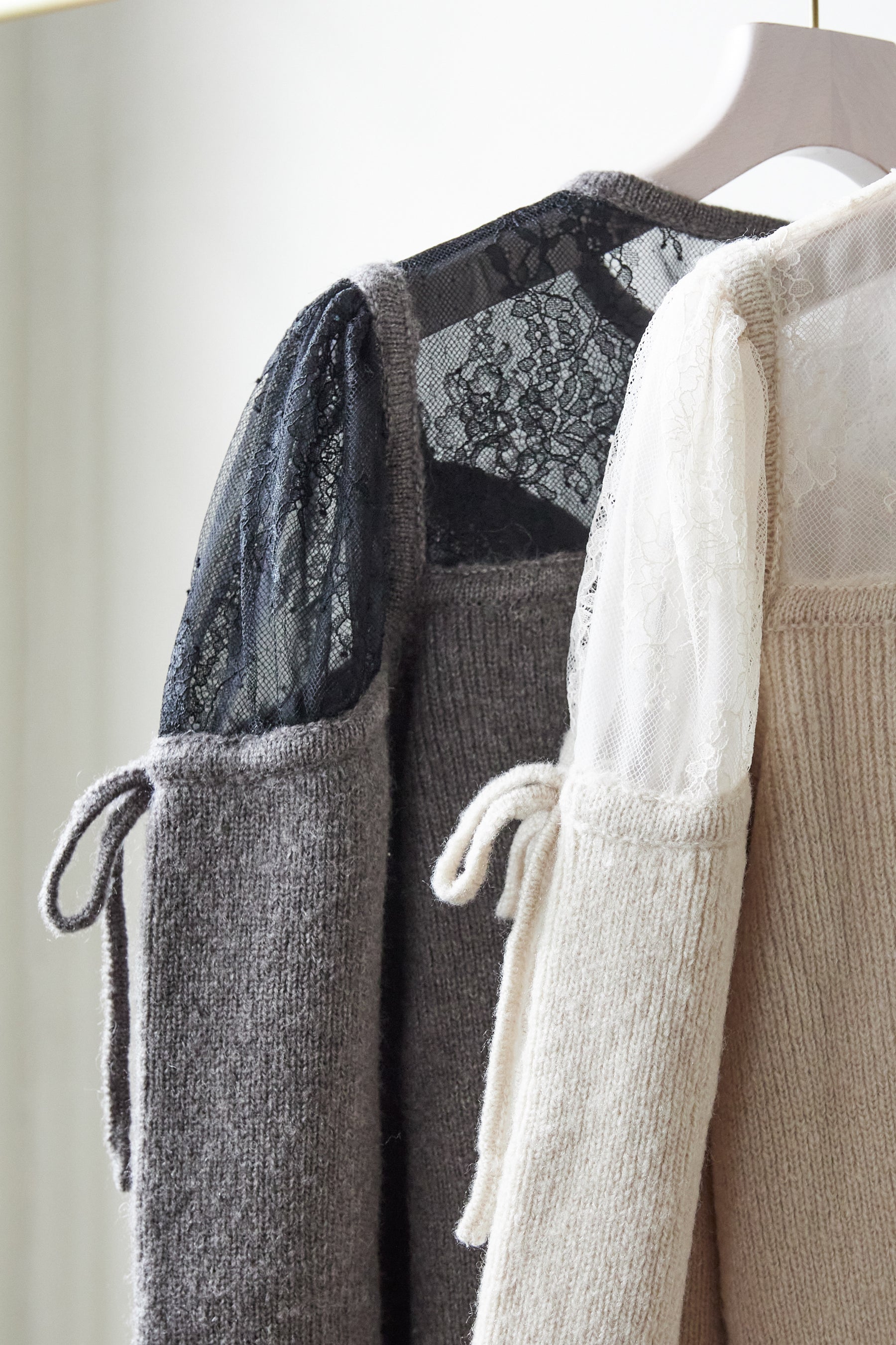 袖口のスカラップには繊細なニット地のリボンを使用し、後ろ衿には程よいスリットを配し抜け感を演出。