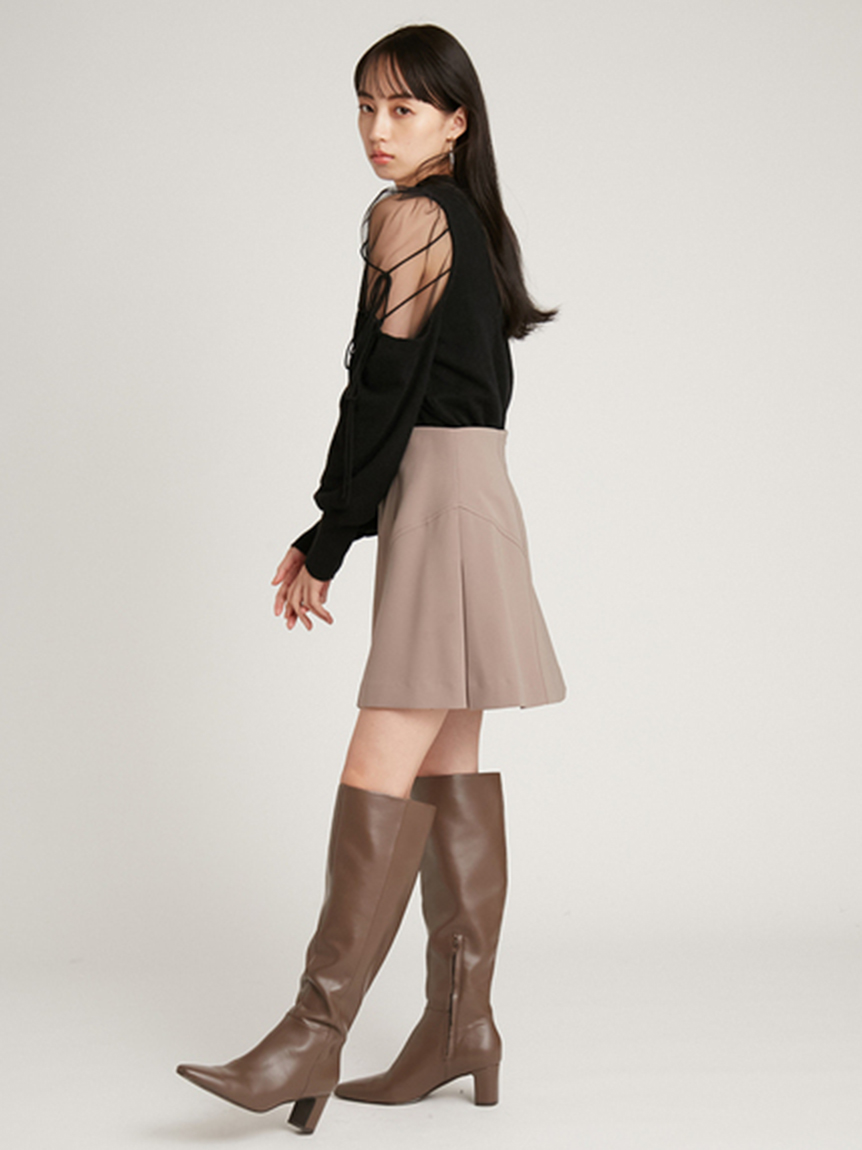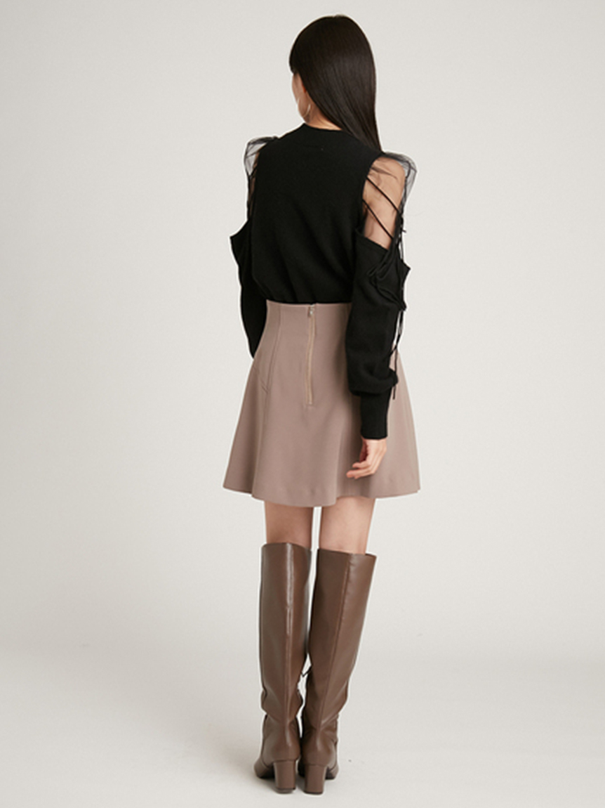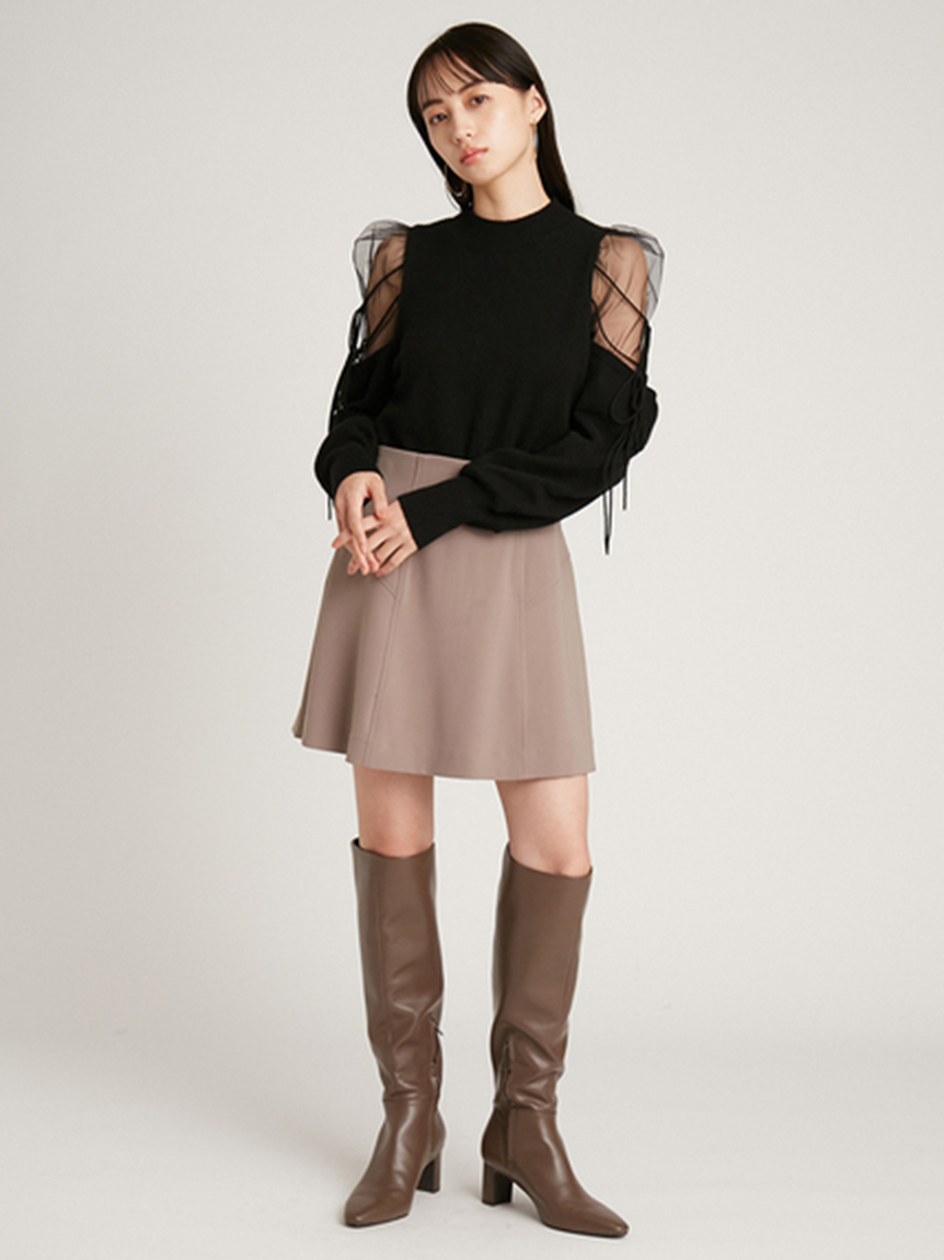 リサイクルナイロンを用いたサステナブルなニットとシアーなオーガンジーを組み合わせました。アイボリー、ブラック、モカの着まわしやすいベーシックなカラー展開でお届けします。