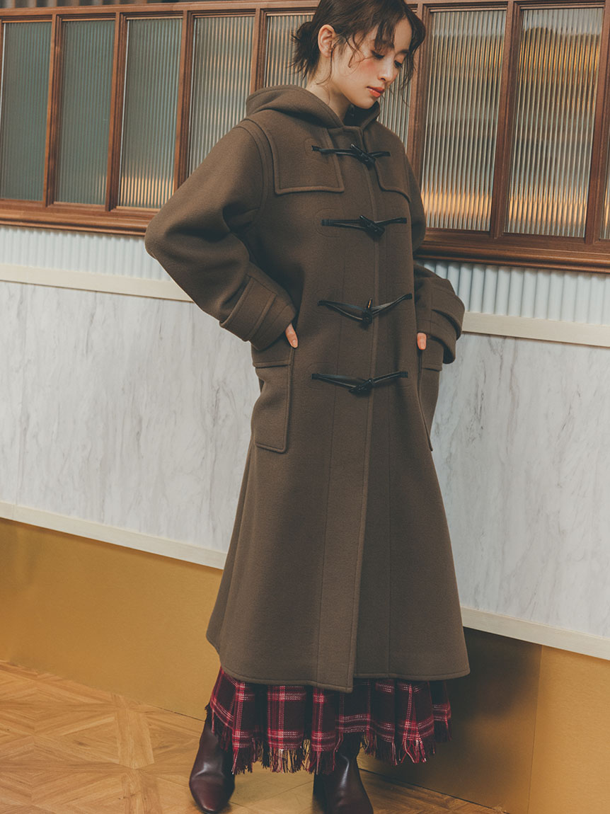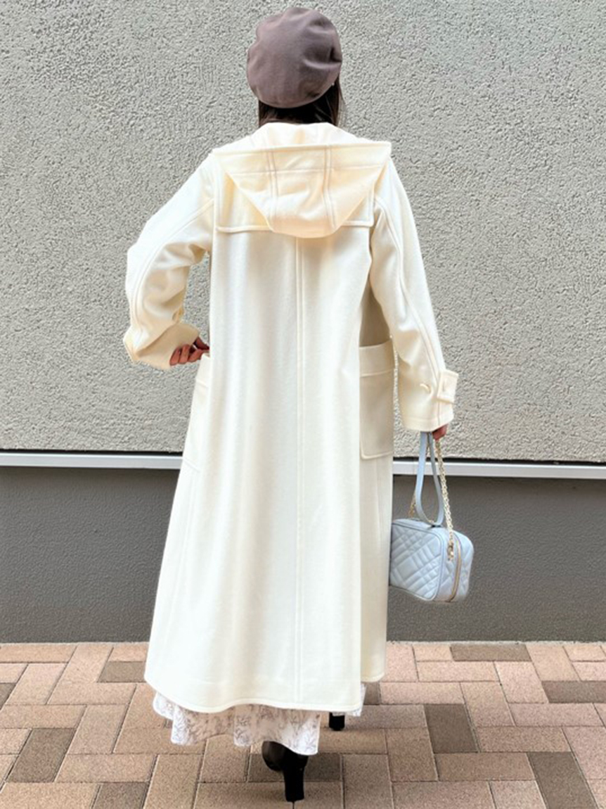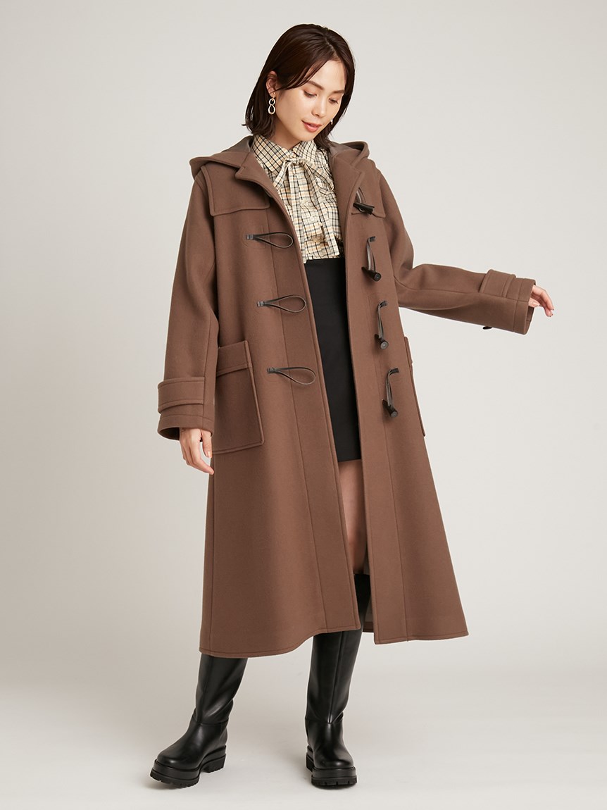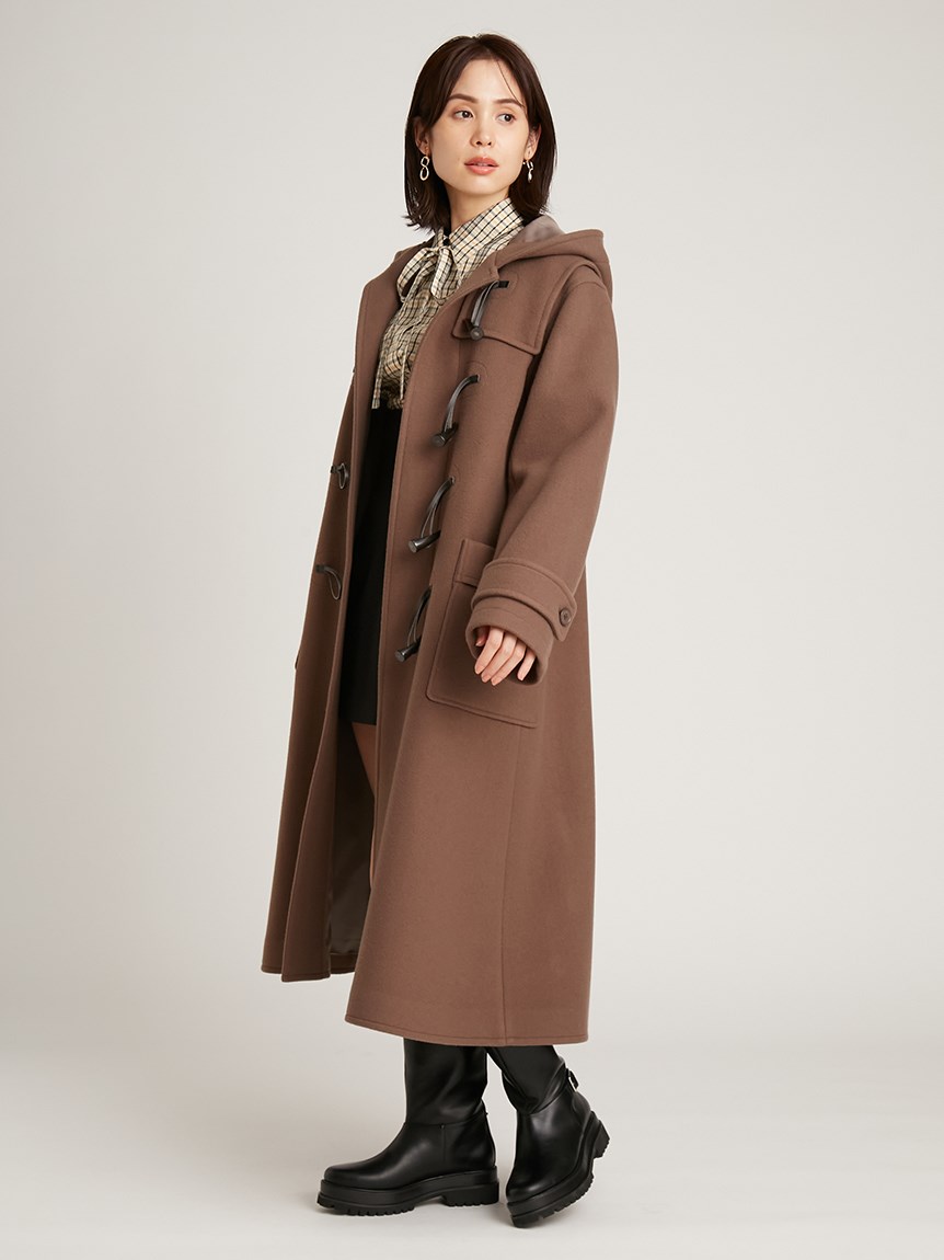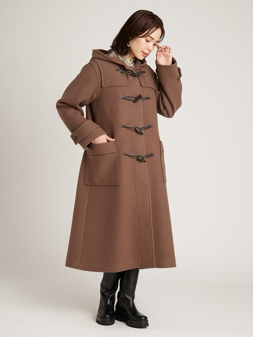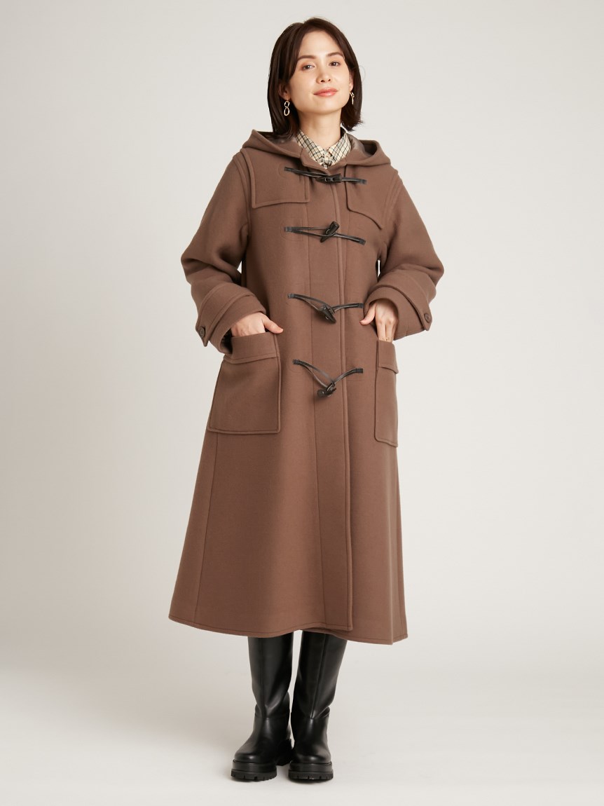 【こだわりのシルエットで女性らしく仕上げたロングダッフルコート】