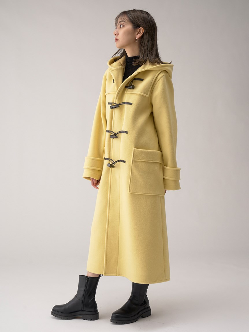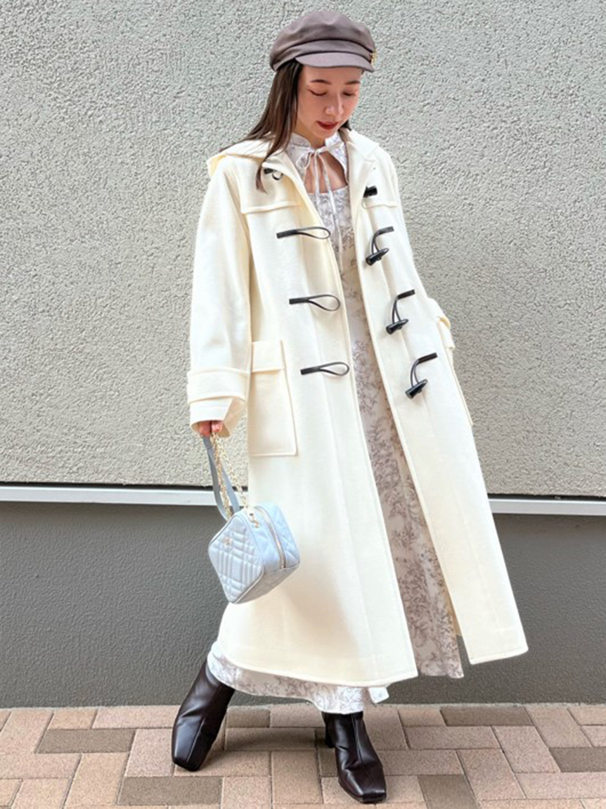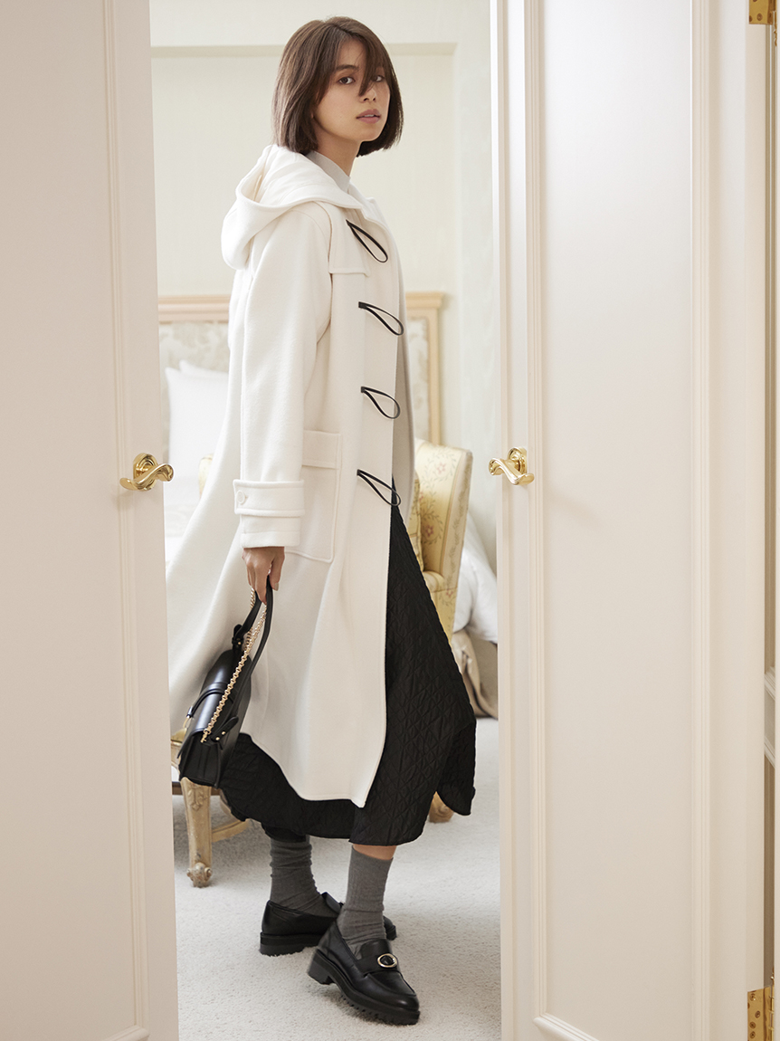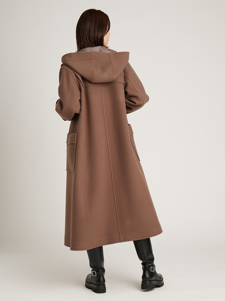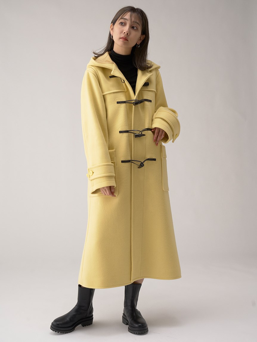 【こだわりのシルエットで女性らしく仕上げたロングダッフルコート】