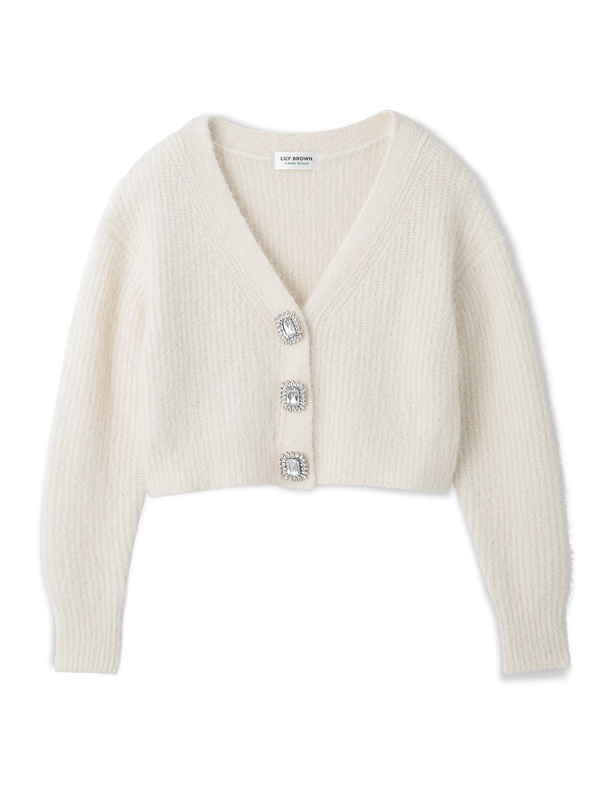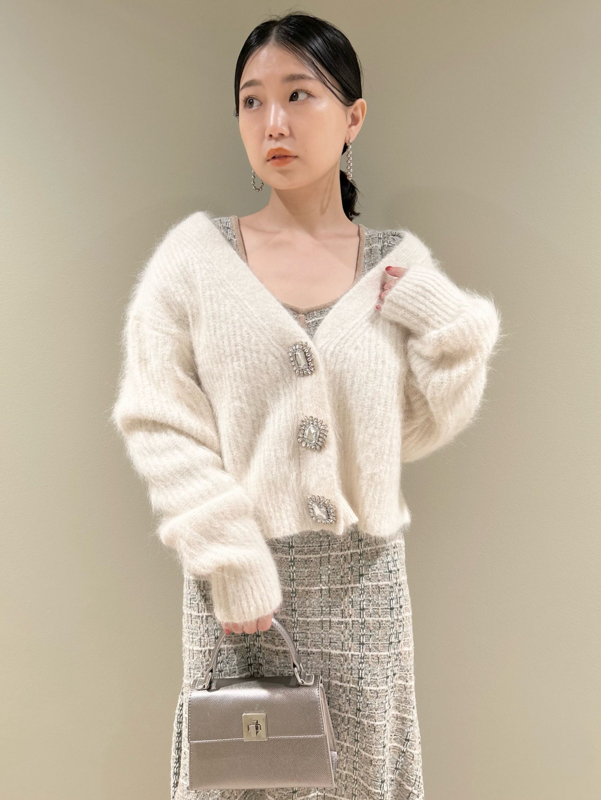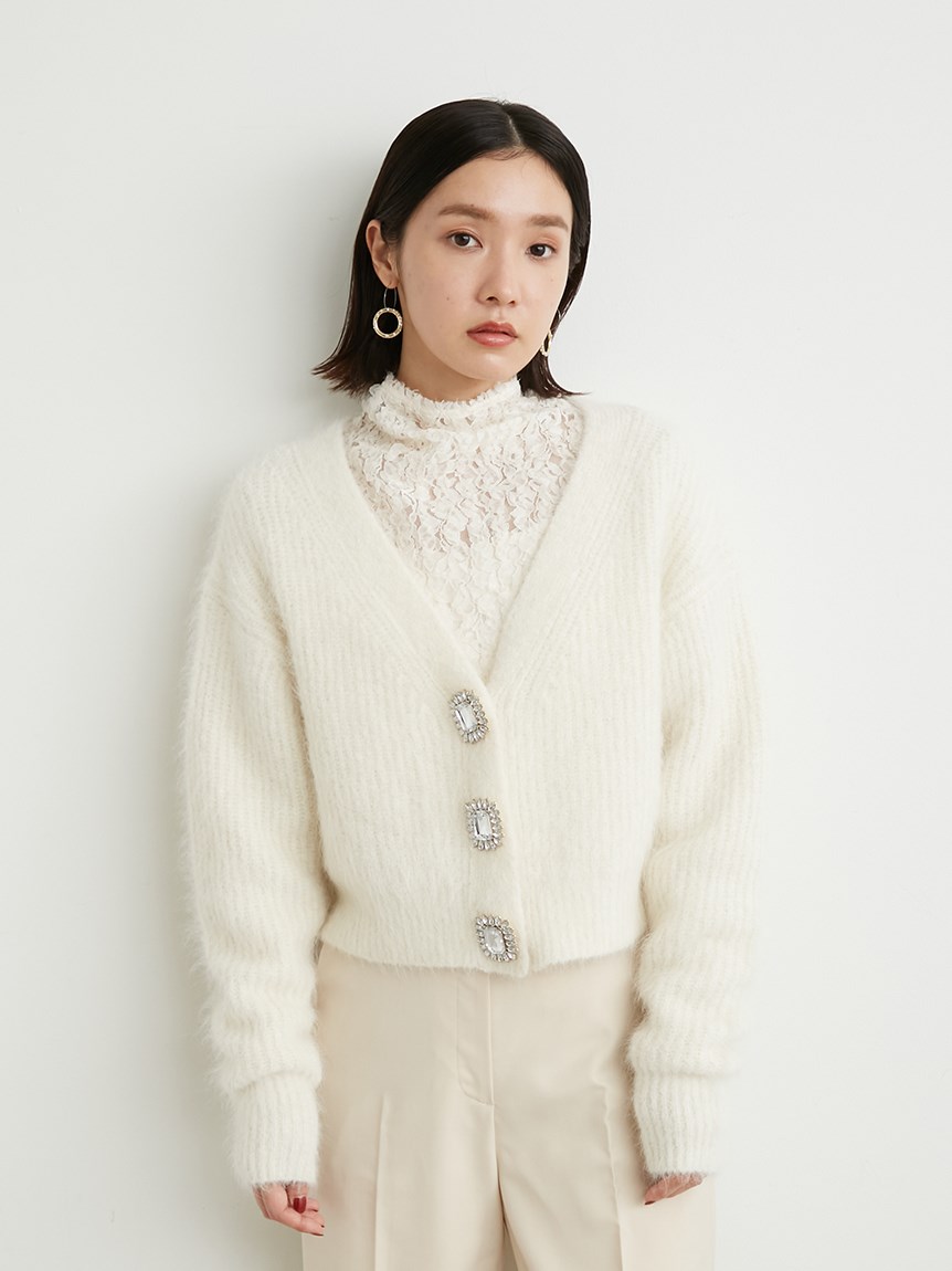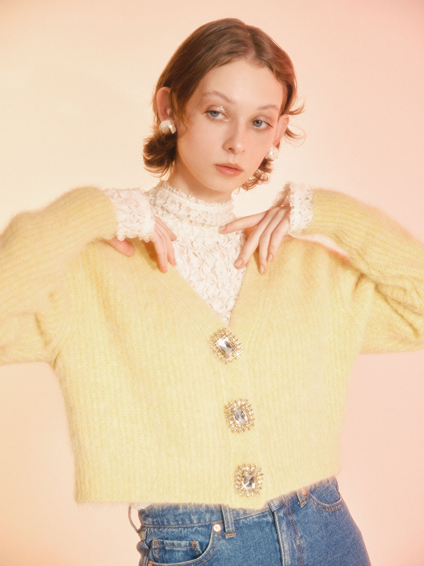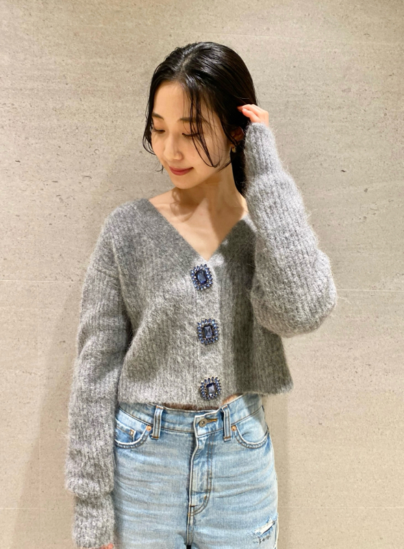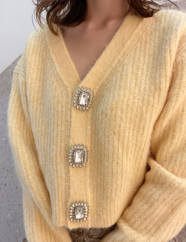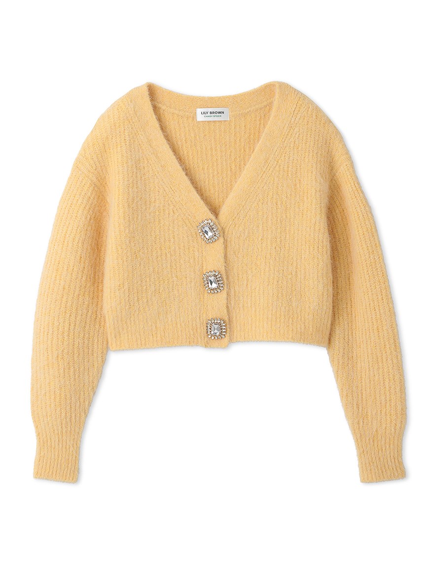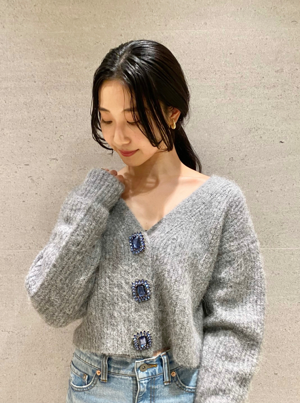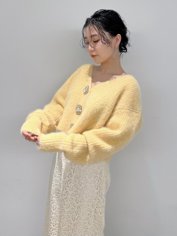 アルパカ高混率の糸を使用した上質なニット素材で仕立てています。クリスタルボタンがあしらわれたホワイト、同系色のビジューボタンのイエロー、ブルーのビジューボタンがあしらわれたグレーの3色をご用意しました。