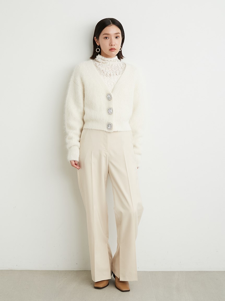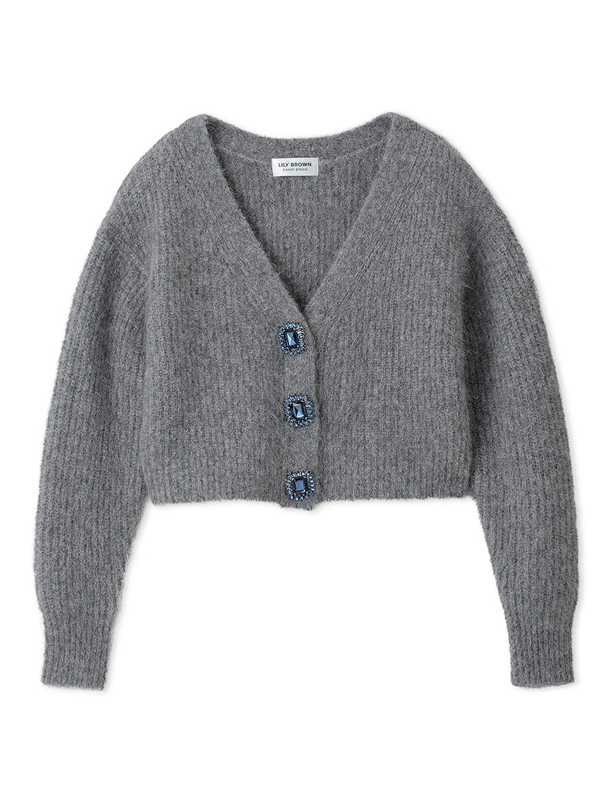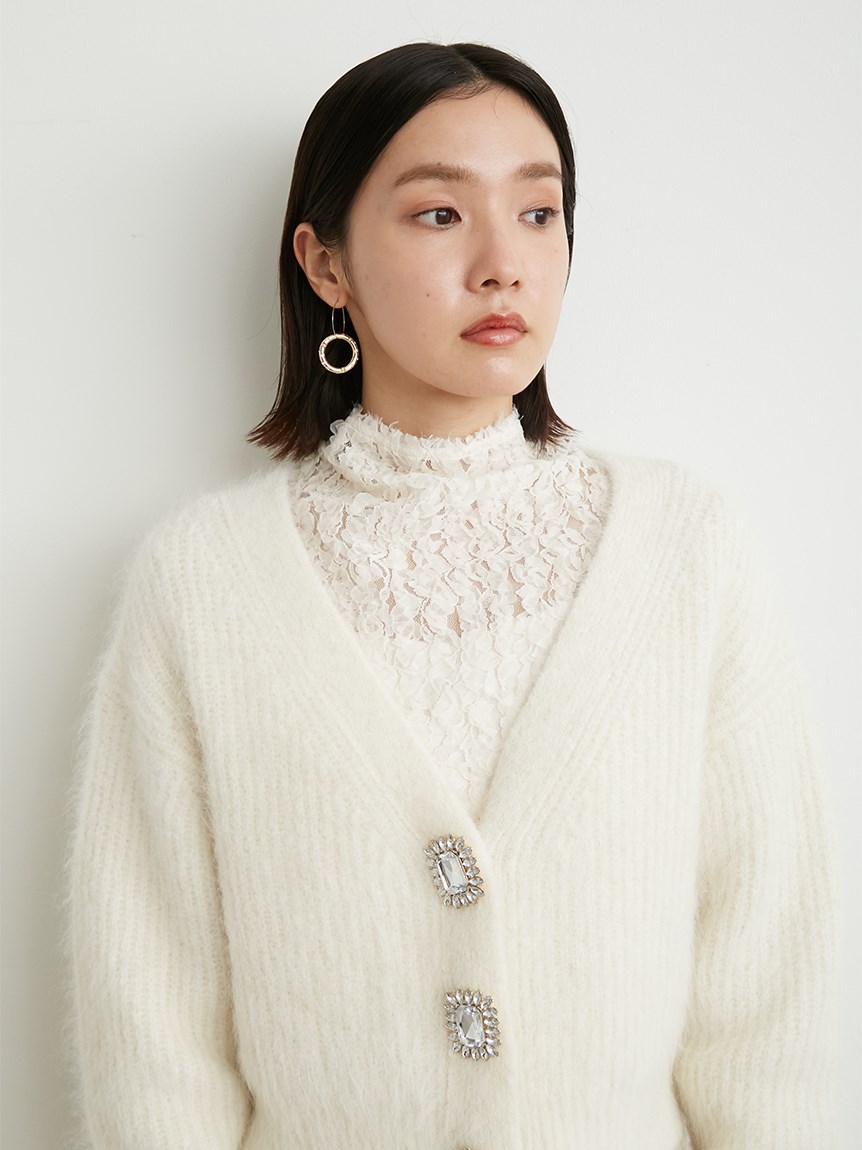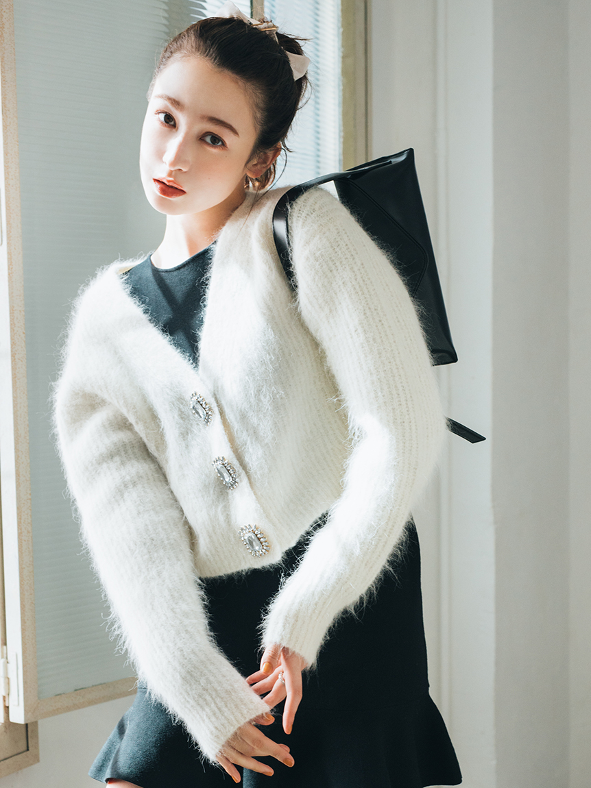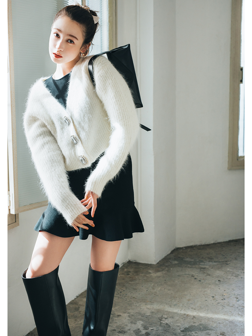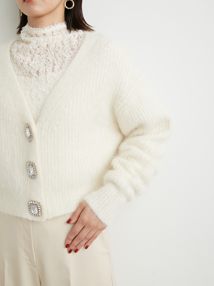 アルパカ高混率の糸を使用した上質なニット素材で仕立てています。クリスタルボタンがあしらわれたホワイト、同系色のビジューボタンのイエロー、ブルーのビジューボタンがあしらわれたグレーの3色をご用意しました。