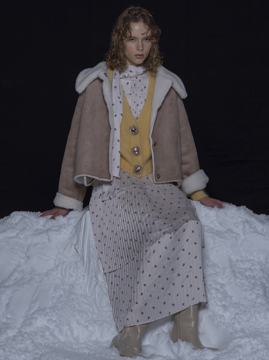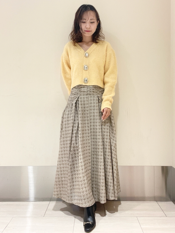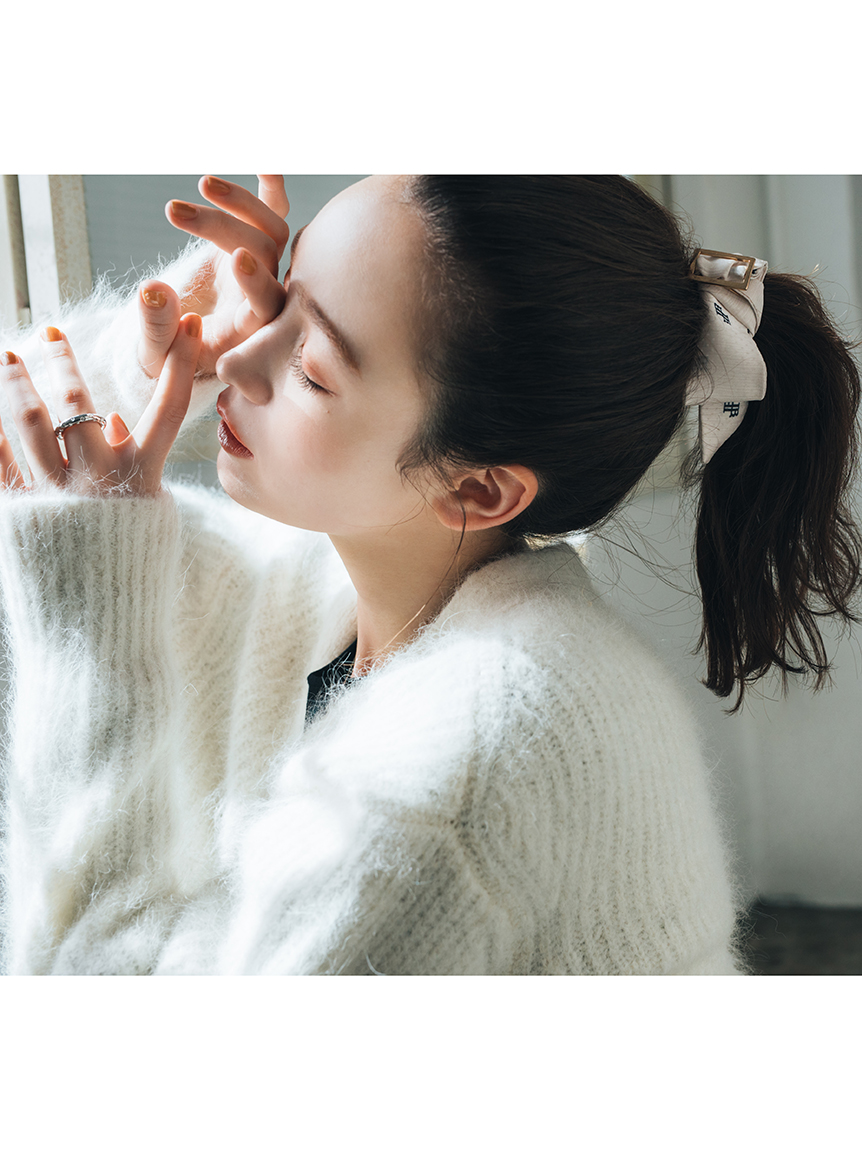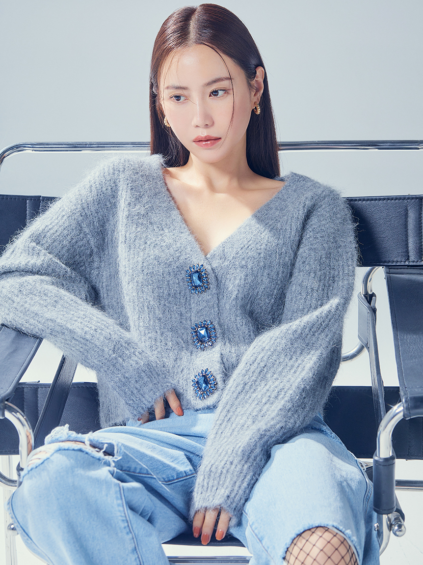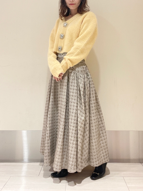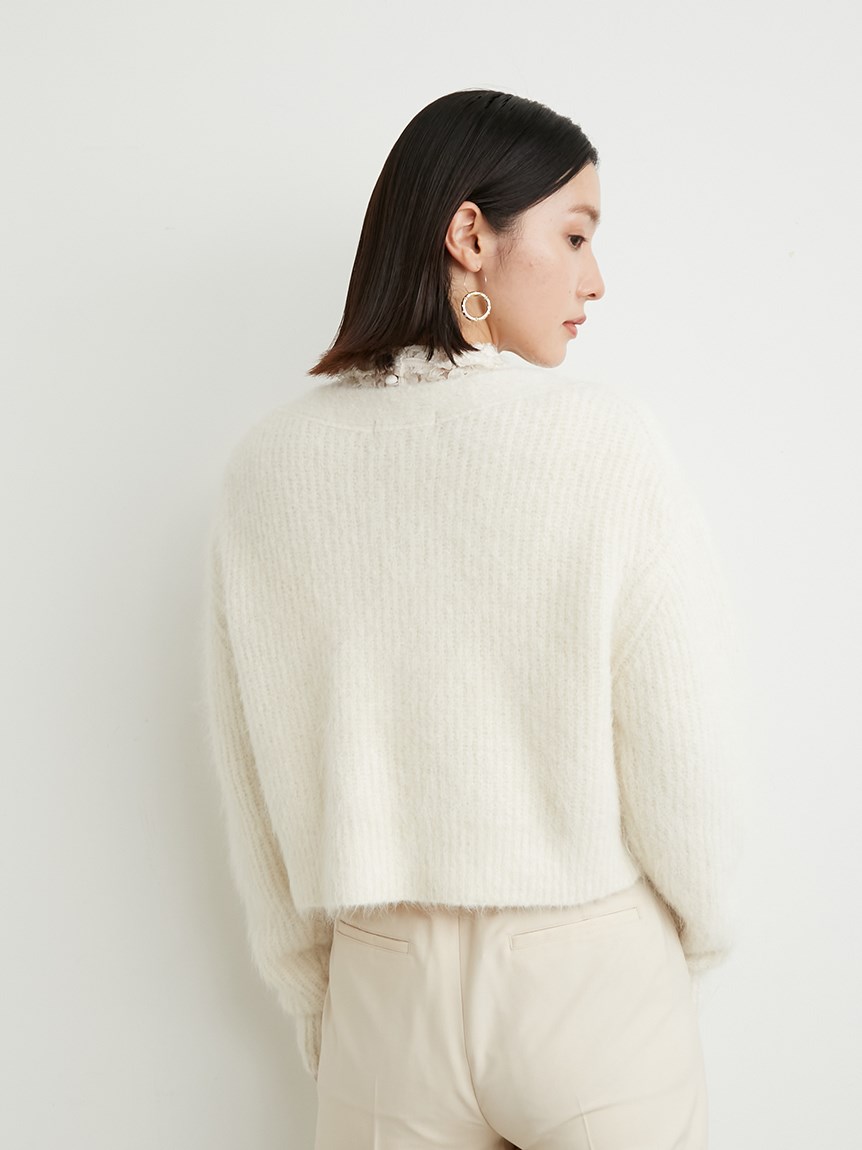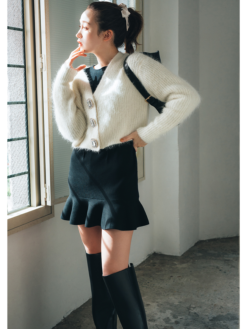 アルパカ高混率の糸を使用した上質なニット素材で仕立てています。クリスタルボタンがあしらわれたホワイト、同系色のビジューボタンのイエロー、ブルーのビジューボタンがあしらわれたグレーの3色をご用意しました。
