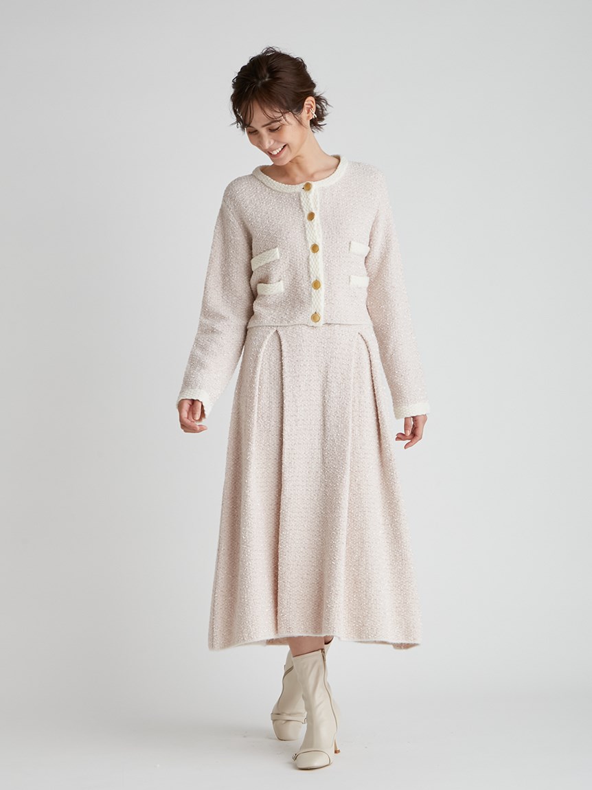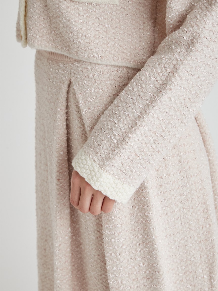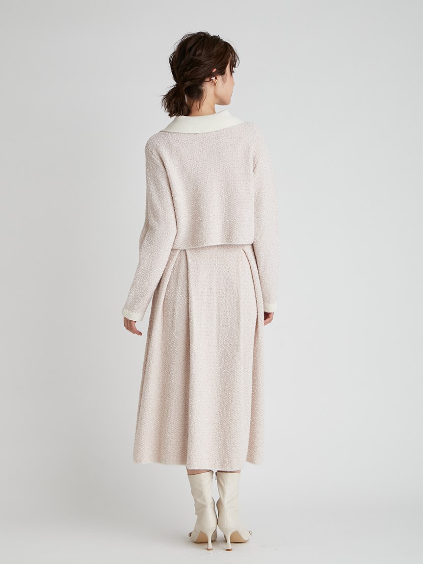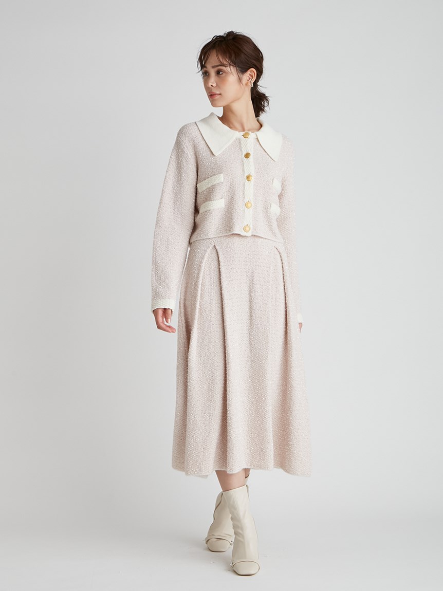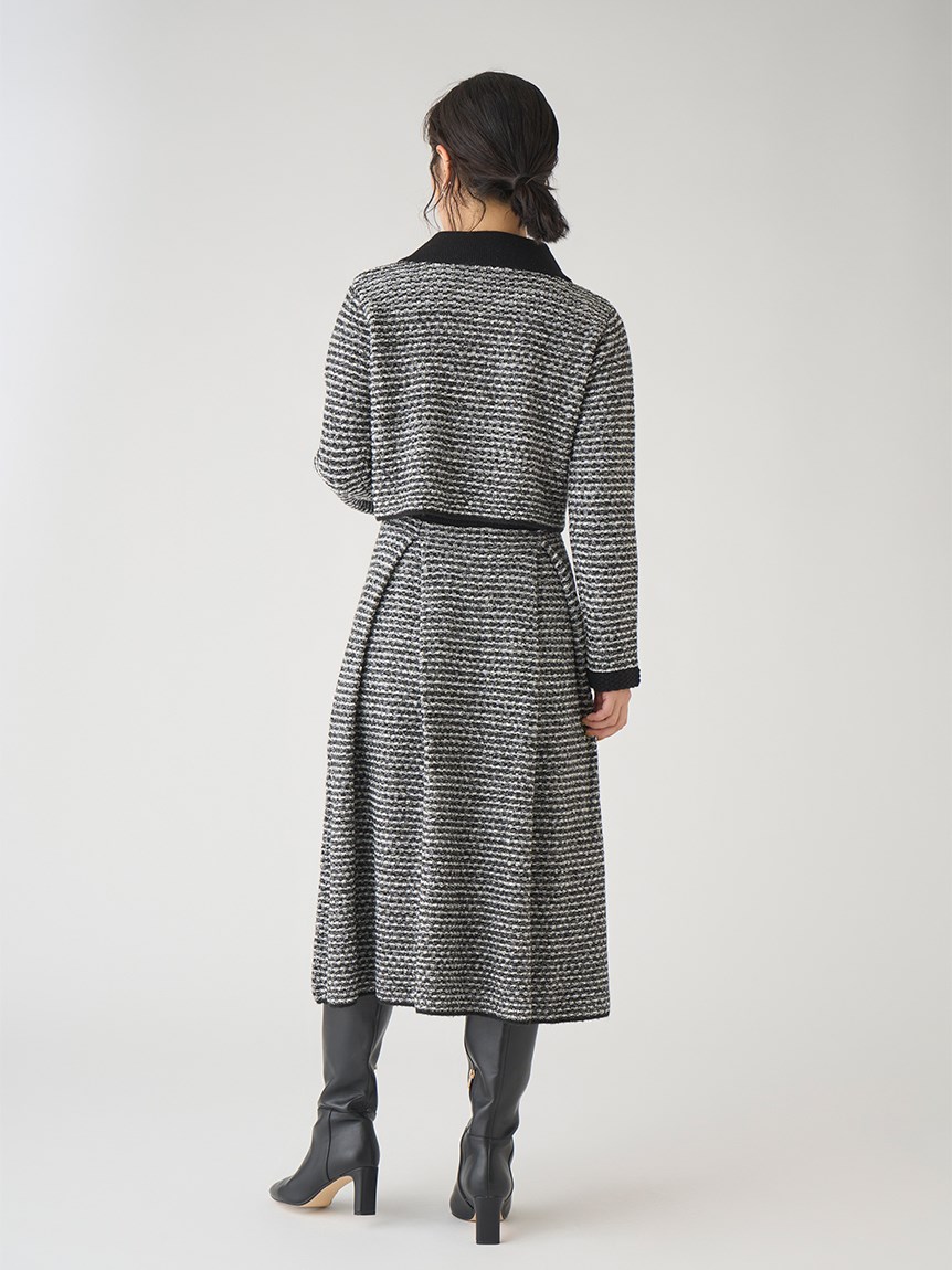 ツイードジャケットとツイードスカートをニットで表現しました。3種類の糸を使用しています。ウール混なので温かくリボンヤーンは表面に凹凸を出し体型のカバーにもなります。衿は取り外し可能になっていてノーカラーのツイードカーディガンとしても使用できます。鹿の子編みで作ったフェイクポケットと衿は全て配色です。スカートはウエスト部分は4cmのゴムを通して着心地の良さとホールド感をだしました。ウエストから前後ろ2本ずつボックスタックを入れていておなか回りが気にならないようにしつつも2cm間中綴じをすることで着ぶくれずすっきりみえるよう作りました。