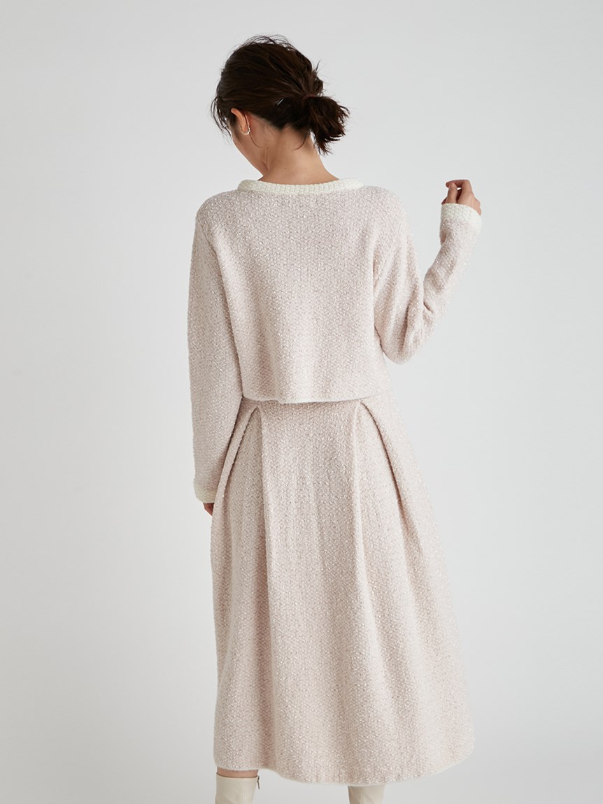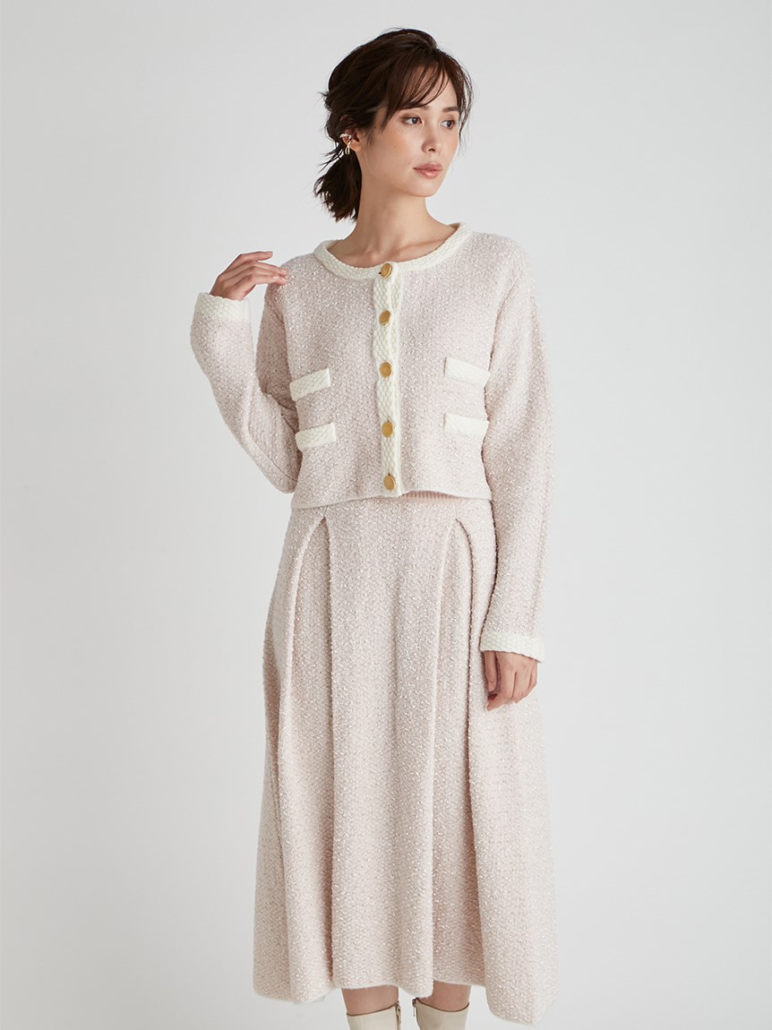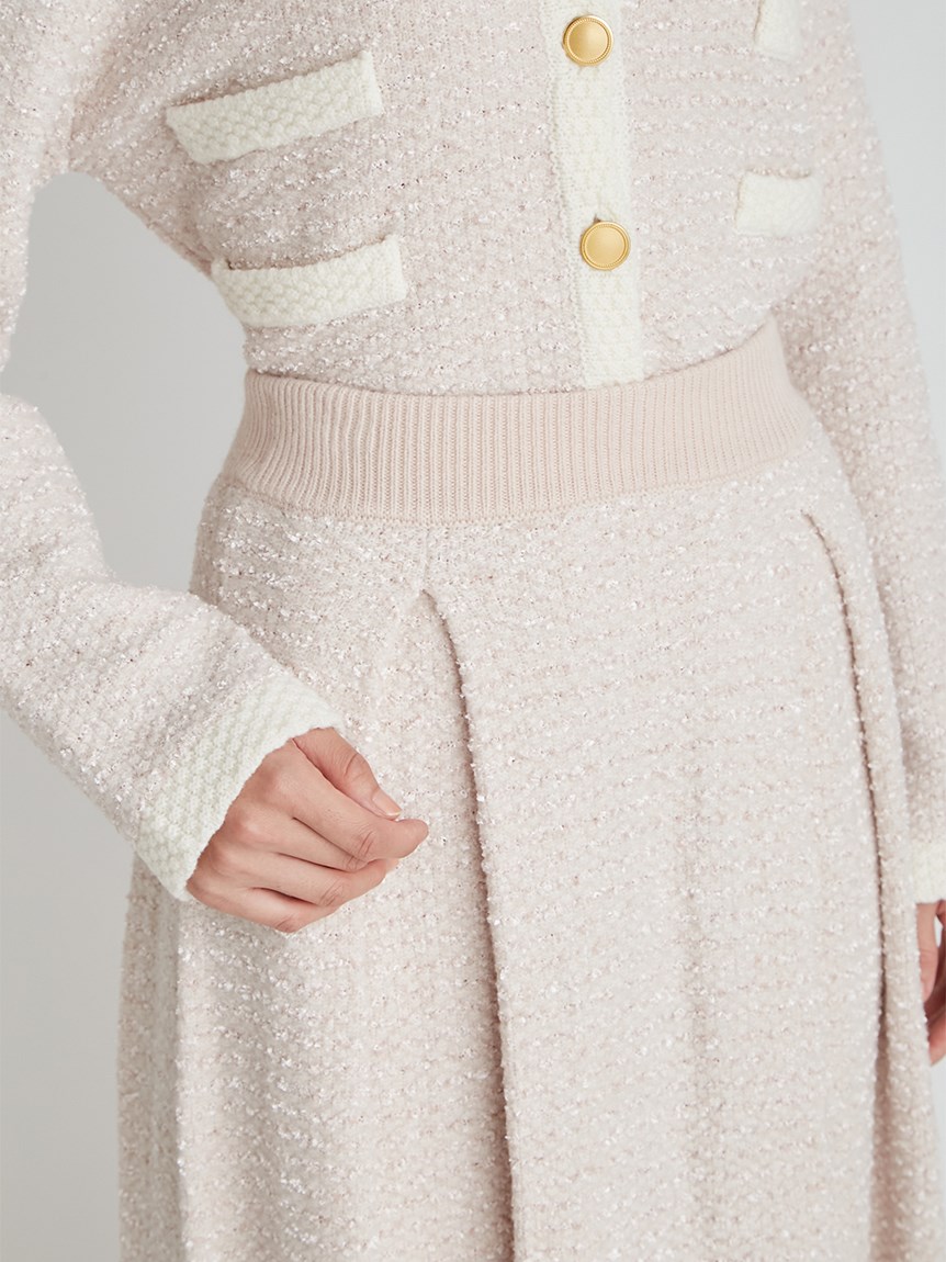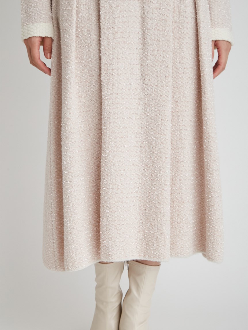 ツイードジャケットとツイードスカートをニットで表現しました。3種類の糸を使用しています。ウール混なので温かくリボンヤーンは表面に凹凸を出し体型のカバーにもなります。衿は取り外し可能になっていてノーカラーのツイードカーディガンとしても使用できます。鹿の子編みで作ったフェイクポケットと衿は全て配色です。スカートはウエスト部分は4cmのゴムを通して着心地の良さとホールド感をだしました。ウエストから前後ろ2本ずつボックスタックを入れていておなか回りが気にならないようにしつつも2cm間中綴じをすることで着ぶくれずすっきりみえるよう作りました。