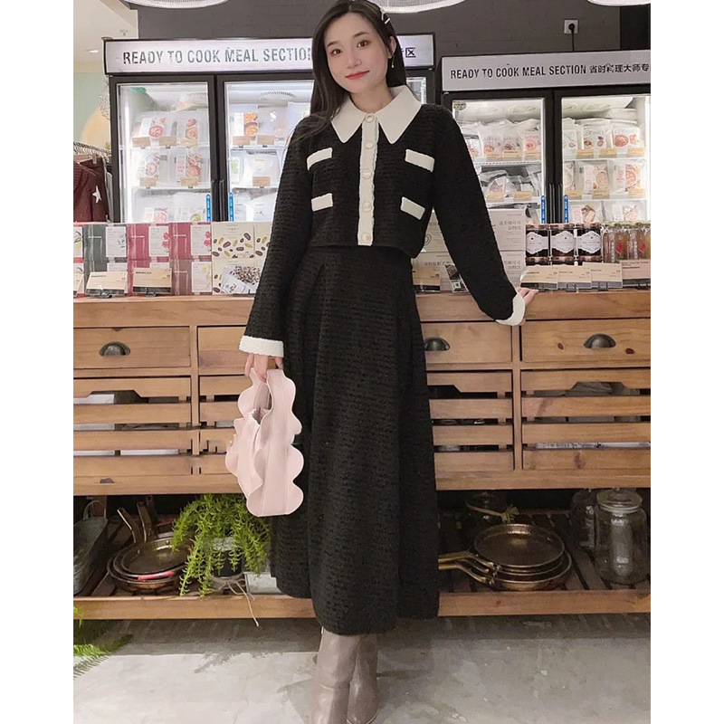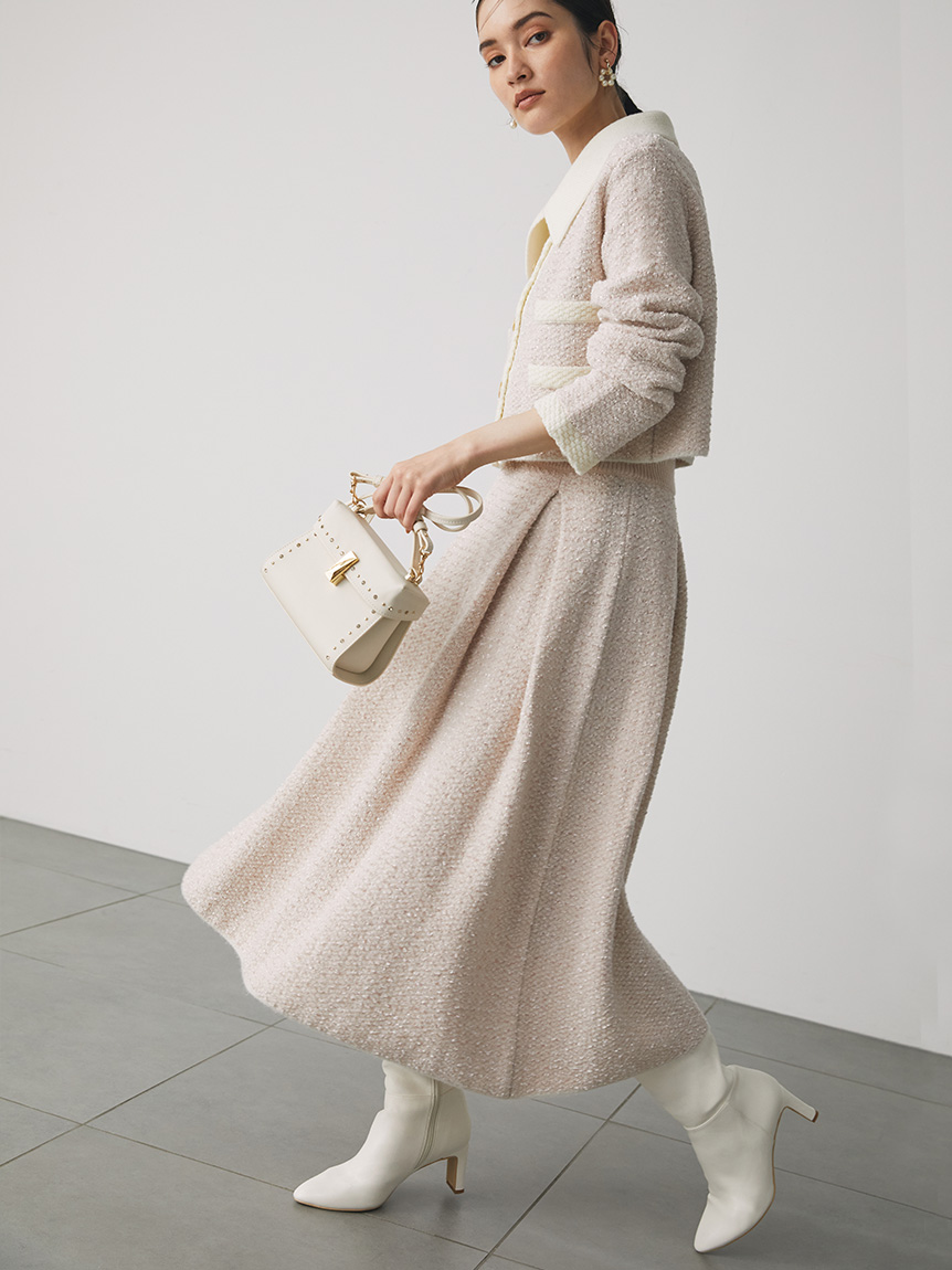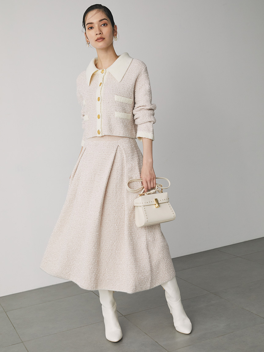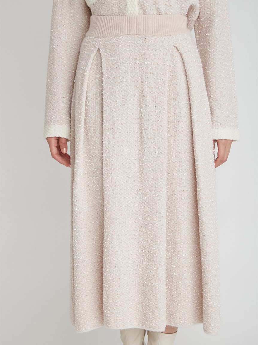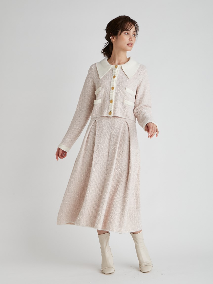 ツイードジャケットとツイードスカートをニットで表現しました。3種類の糸を使用しています。ウール混なので温かくリボンヤーンは表面に凹凸を出し体型のカバーにもなります。衿は取り外し可能になっていてノーカラーのツイードカーディガンとしても使用できます。鹿の子編みで作ったフェイクポケットと衿は全て配色です。スカートはウエスト部分は4cmのゴムを通して着心地の良さとホールド感をだしました。ウエストから前後ろ2本ずつボックスタックを入れていておなか回りが気にならないようにしつつも2cm間中綴じをすることで着ぶくれずすっきりみえるよう作りました。