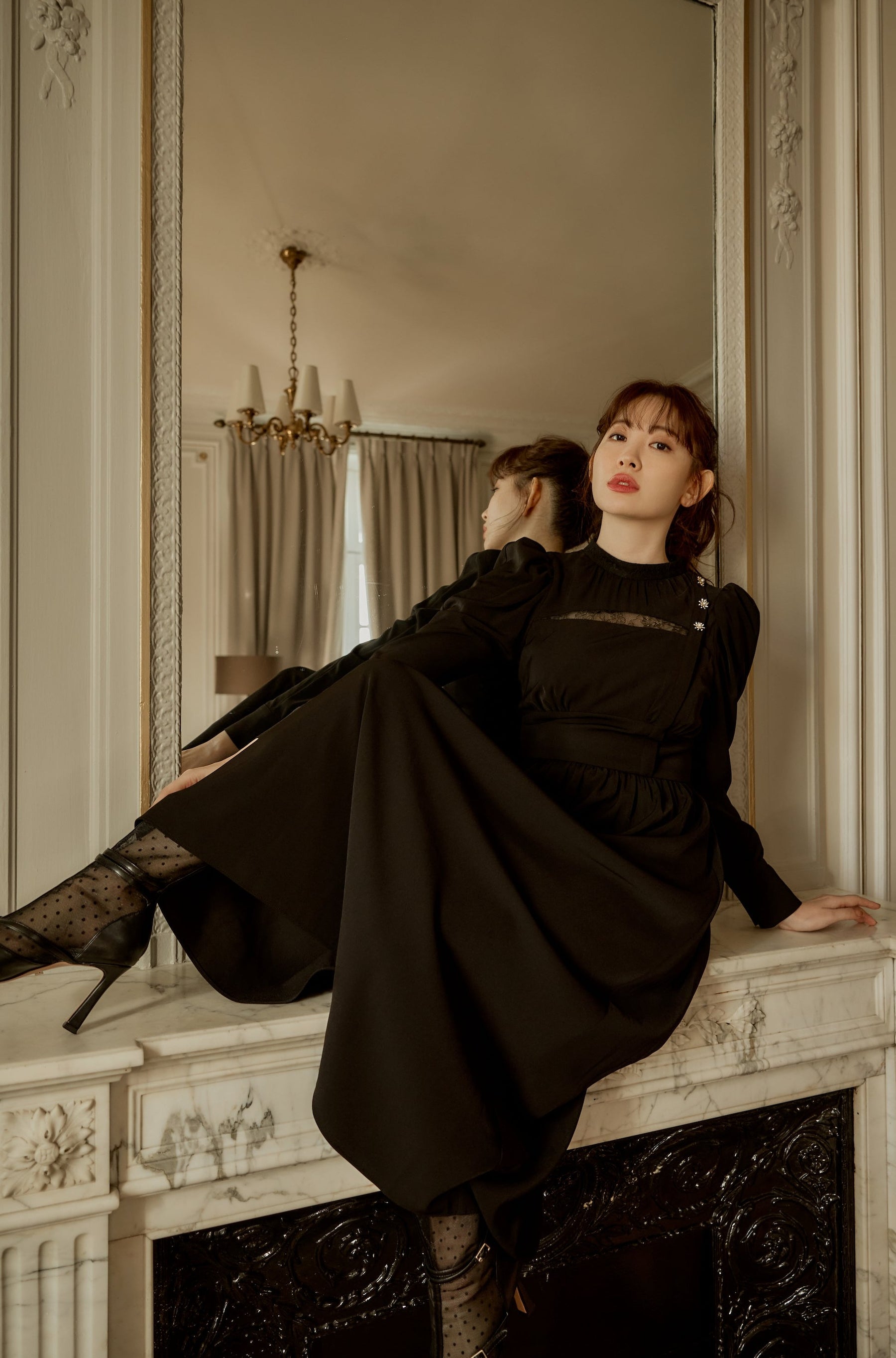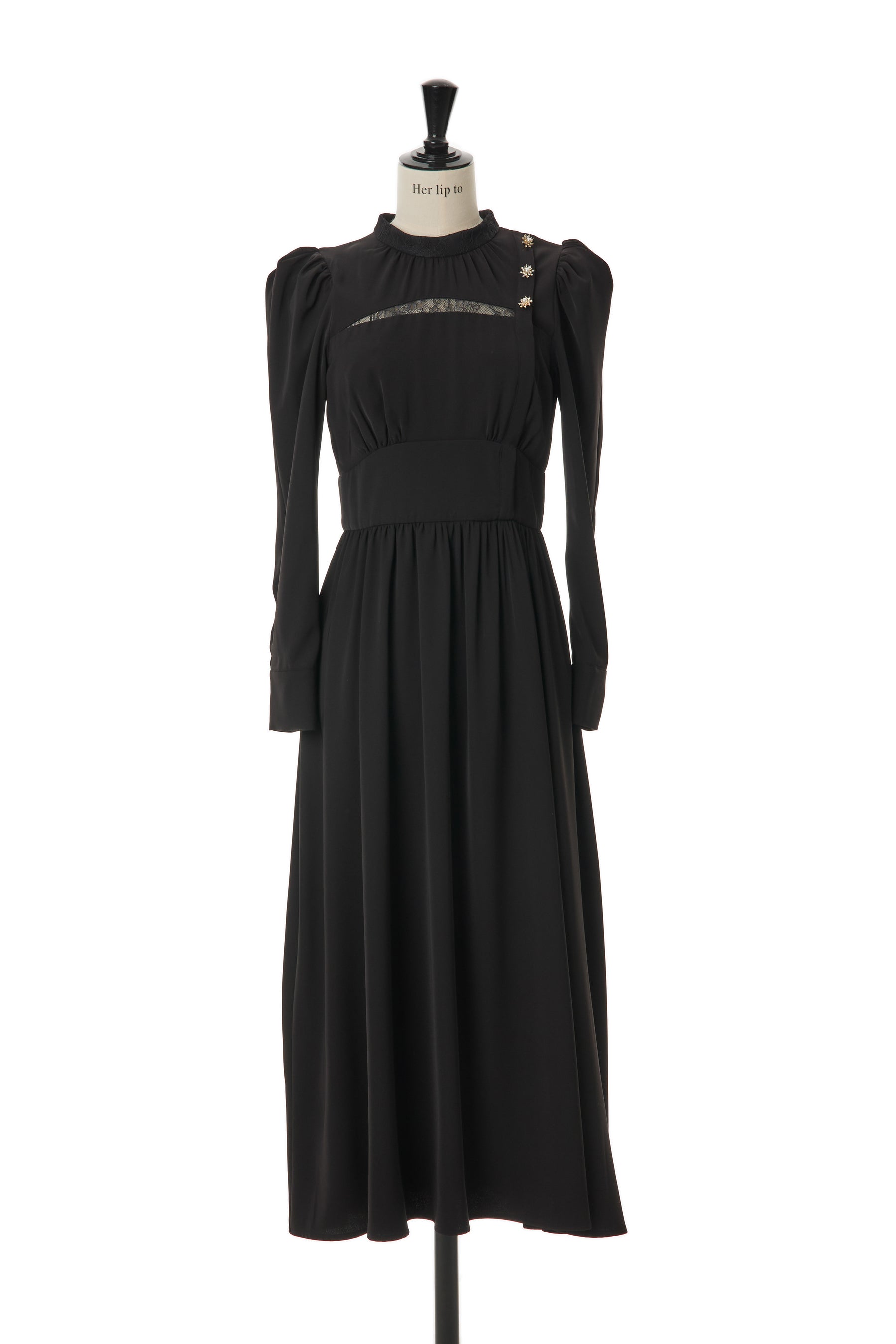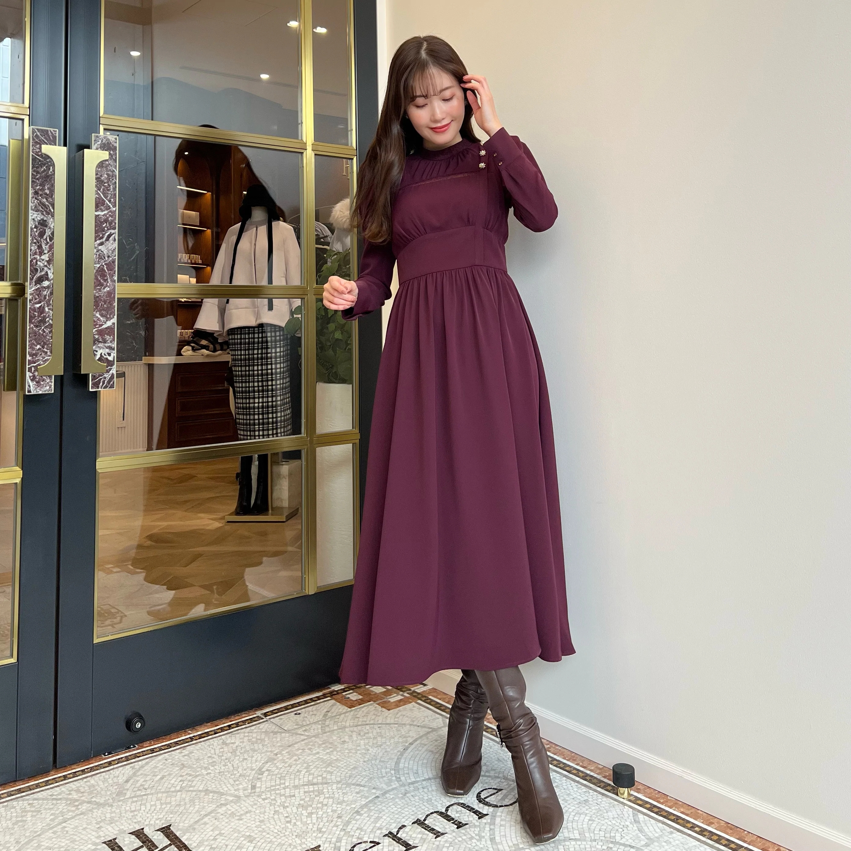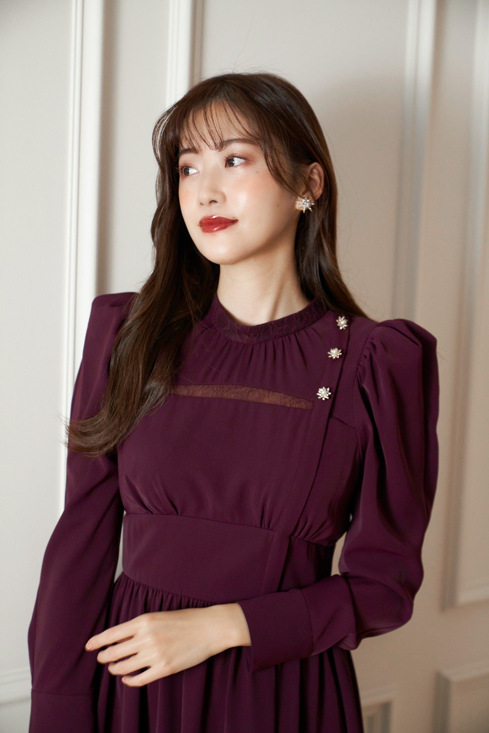 高めに配したウエスト位置により、美シルエットを叶え、スノーフレークのモチーフを使ったボタンが顔周りに華やかさを添えてくれます。