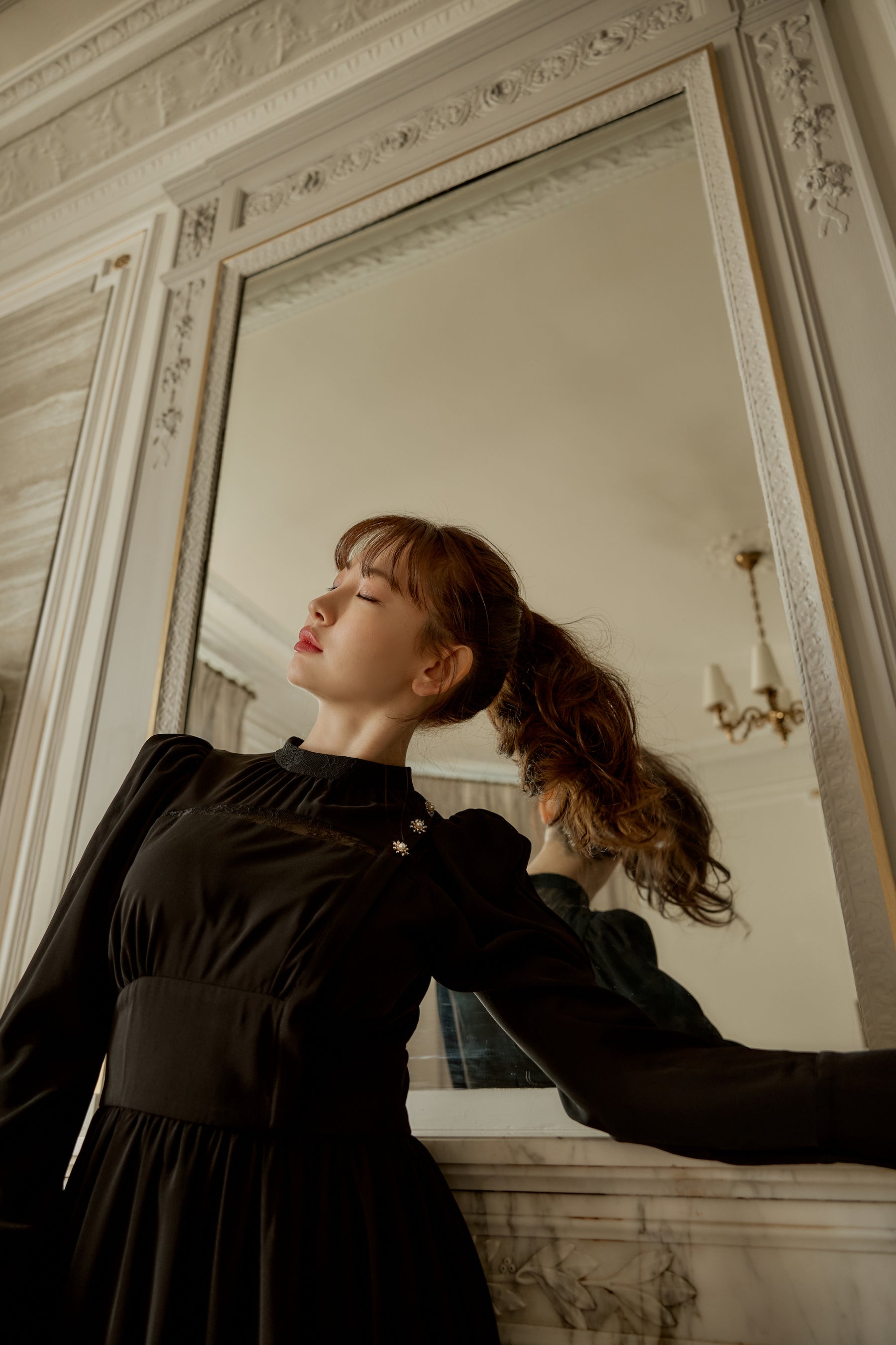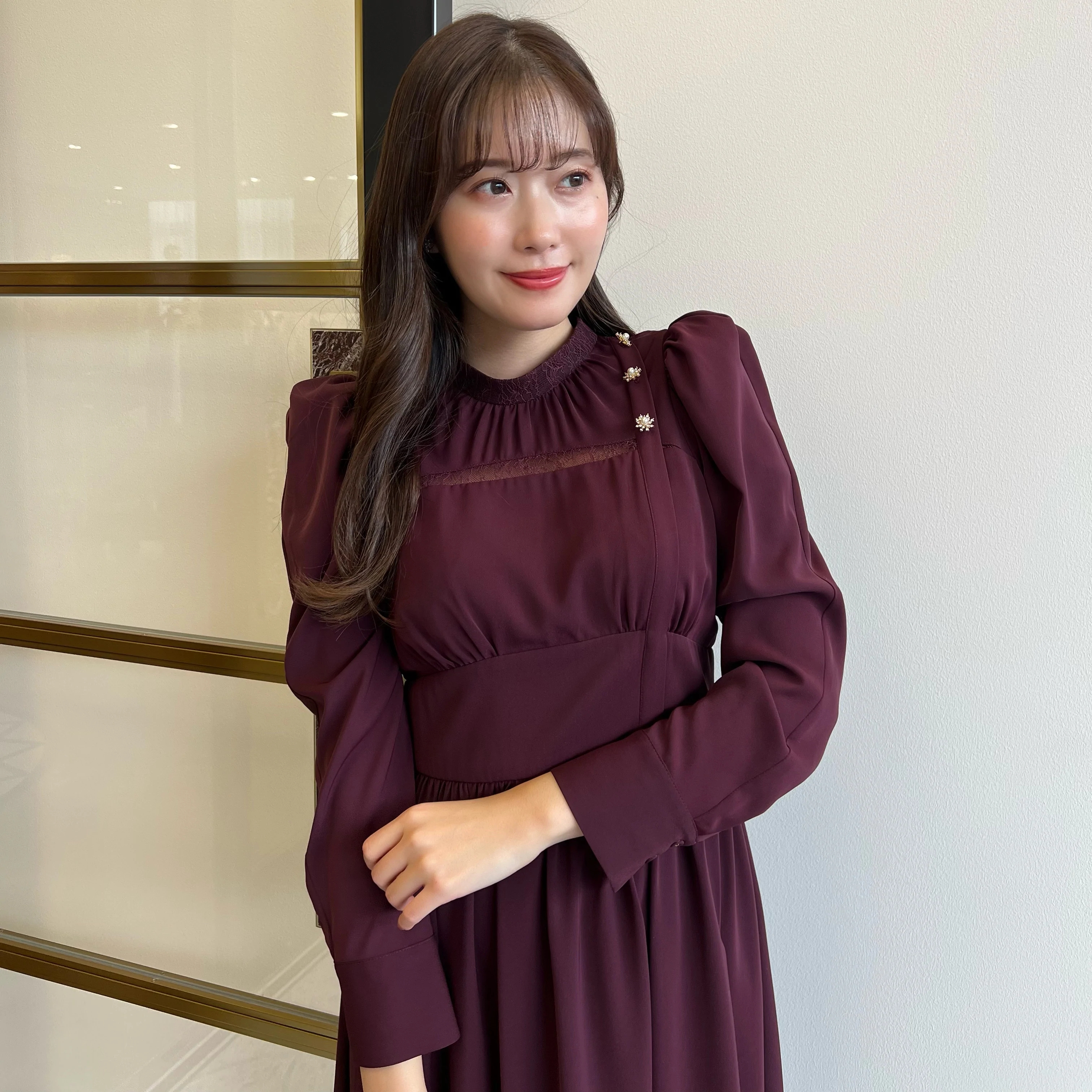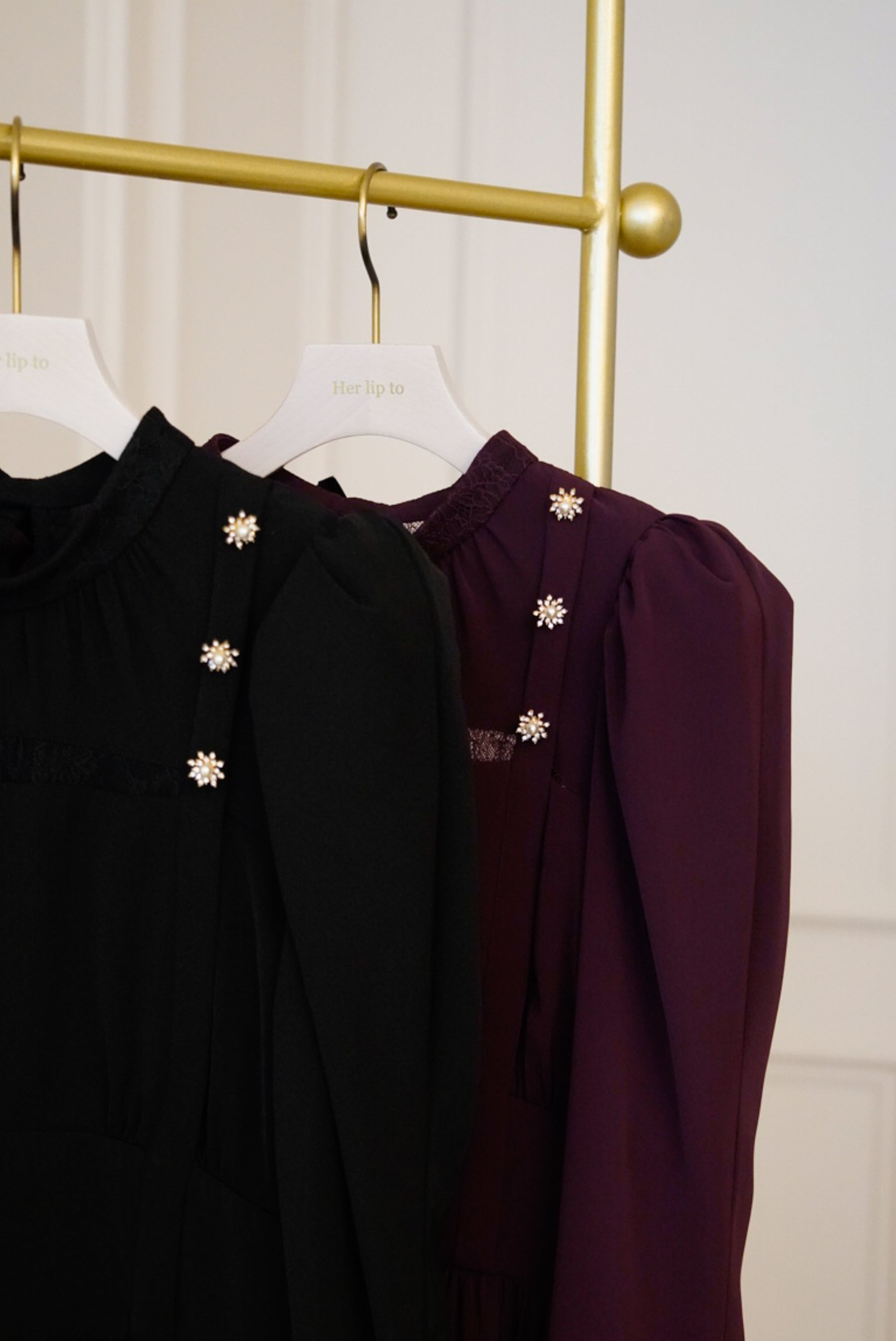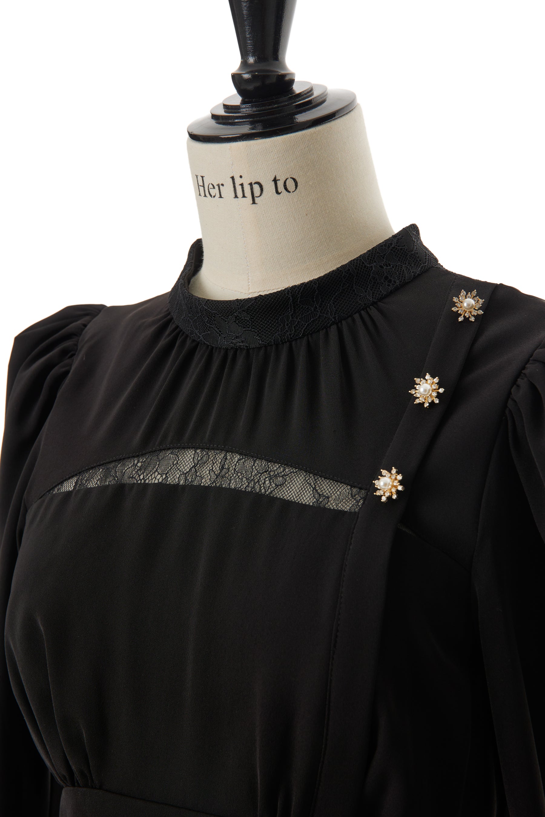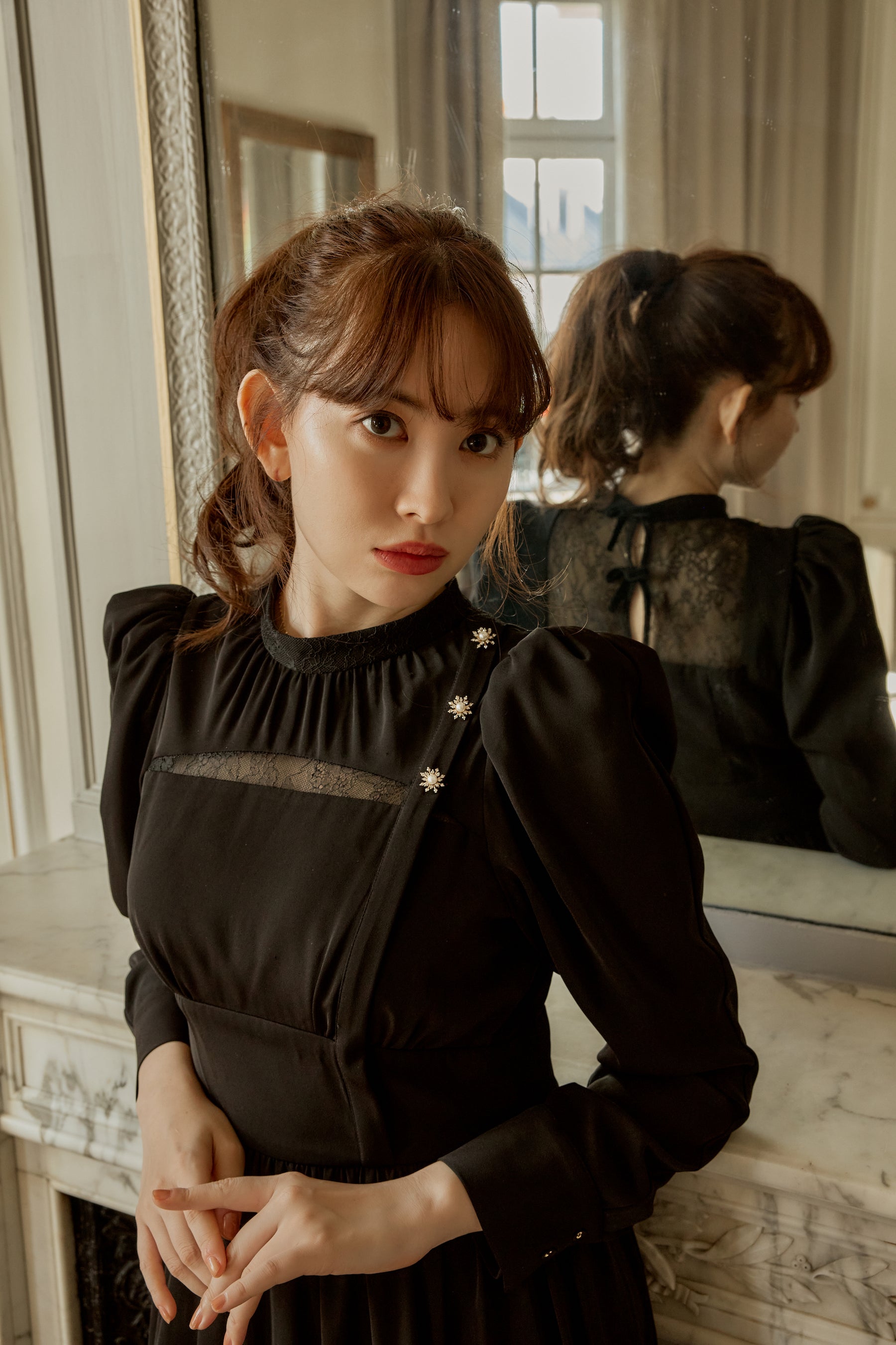 高めに配したウエスト位置により、美シルエットを叶え、スノーフレークのモチーフを使ったボタンが顔周りに華やかさを添えてくれます。