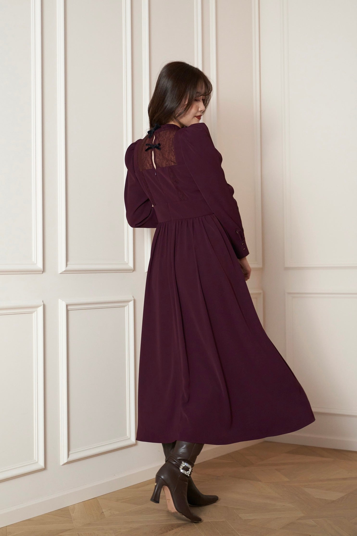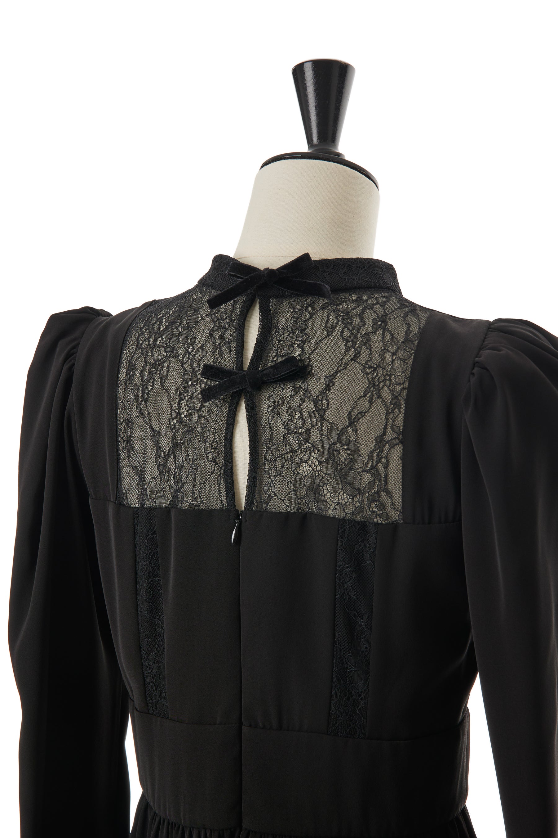 バックコンシャスなダブルリボンに視線が集まるレーストリミングドレス。