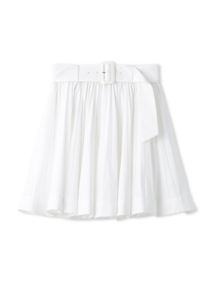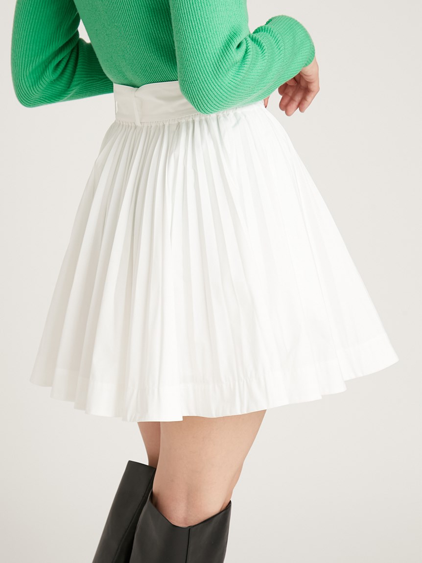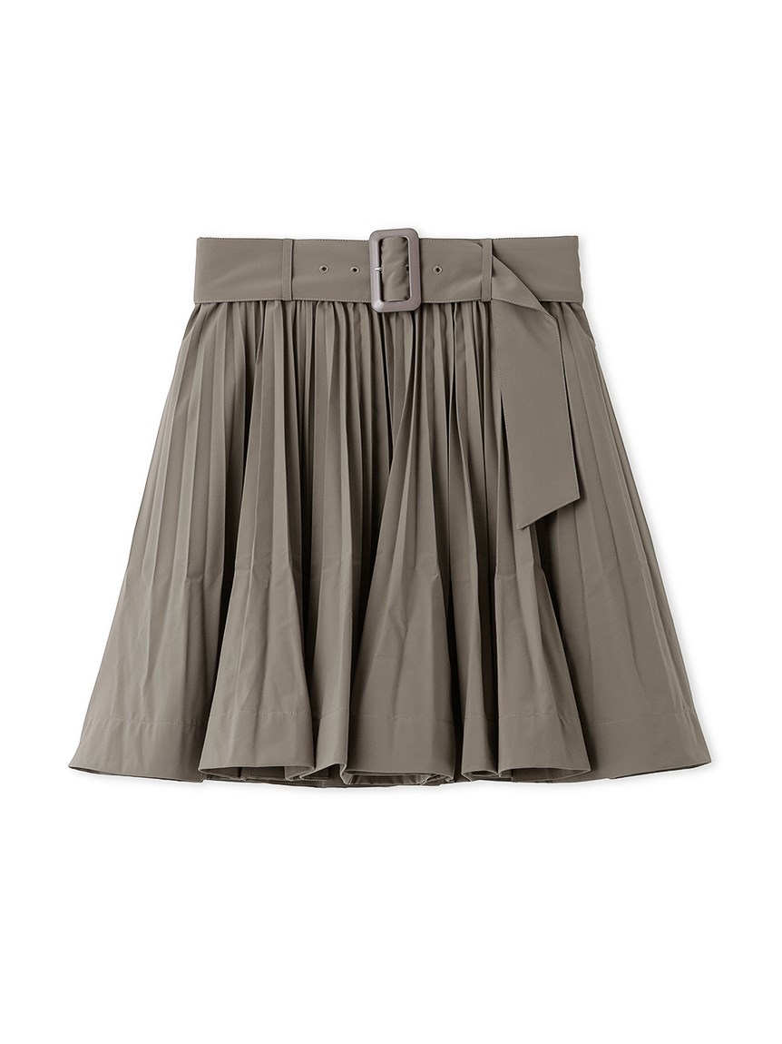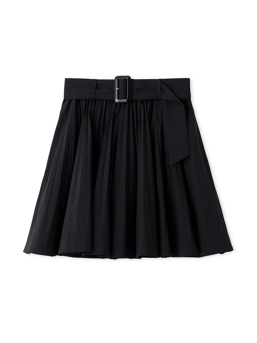 程よいカジュアル感のあるタフタ素材で仕立てたミニスカート。たっぷりとプリーツを効かせたボリュームのあるフレアシルエットで、女性らしさを存分に引き立ててくれます。セットになった共地ベルトでウエストマークすればメリハリ感が生まれスタイルアップ効果UP。ウエストはゴム仕様なので伸縮性があり、様々なシーンでの着用ができる万能アイテムです。