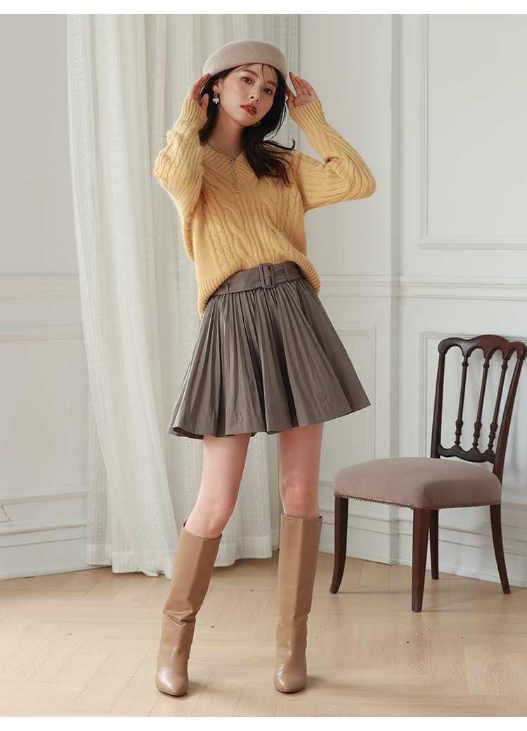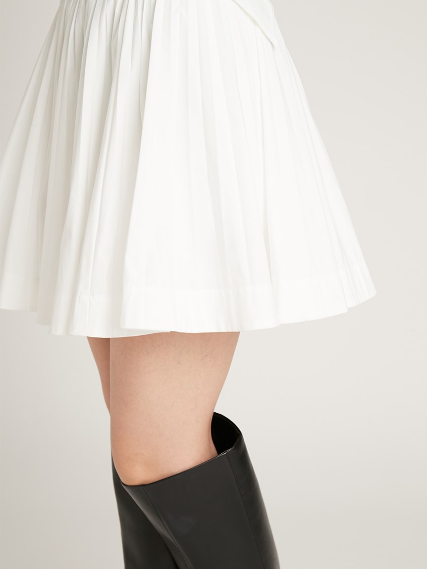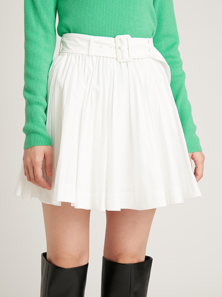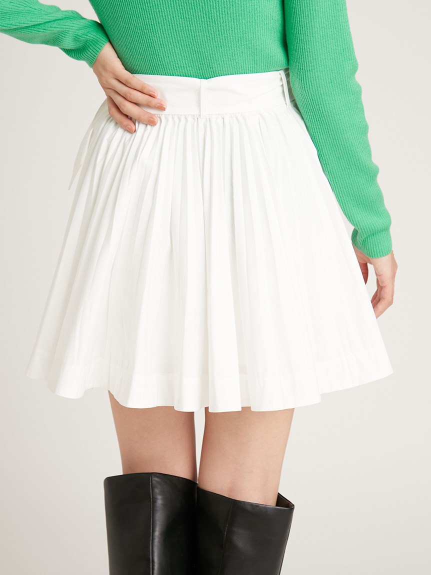 程よいカジュアル感のあるタフタ素材で仕立てたミニスカート。たっぷりとプリーツを効かせたボリュームのあるフレアシルエットで、女性らしさを存分に引き立ててくれます。セットになった共地ベルトでウエストマークすればメリハリ感が生まれスタイルアップ効果UP。ウエストはゴム仕様なので伸縮性があり、様々なシーンでの着用ができる万能アイテムです。
