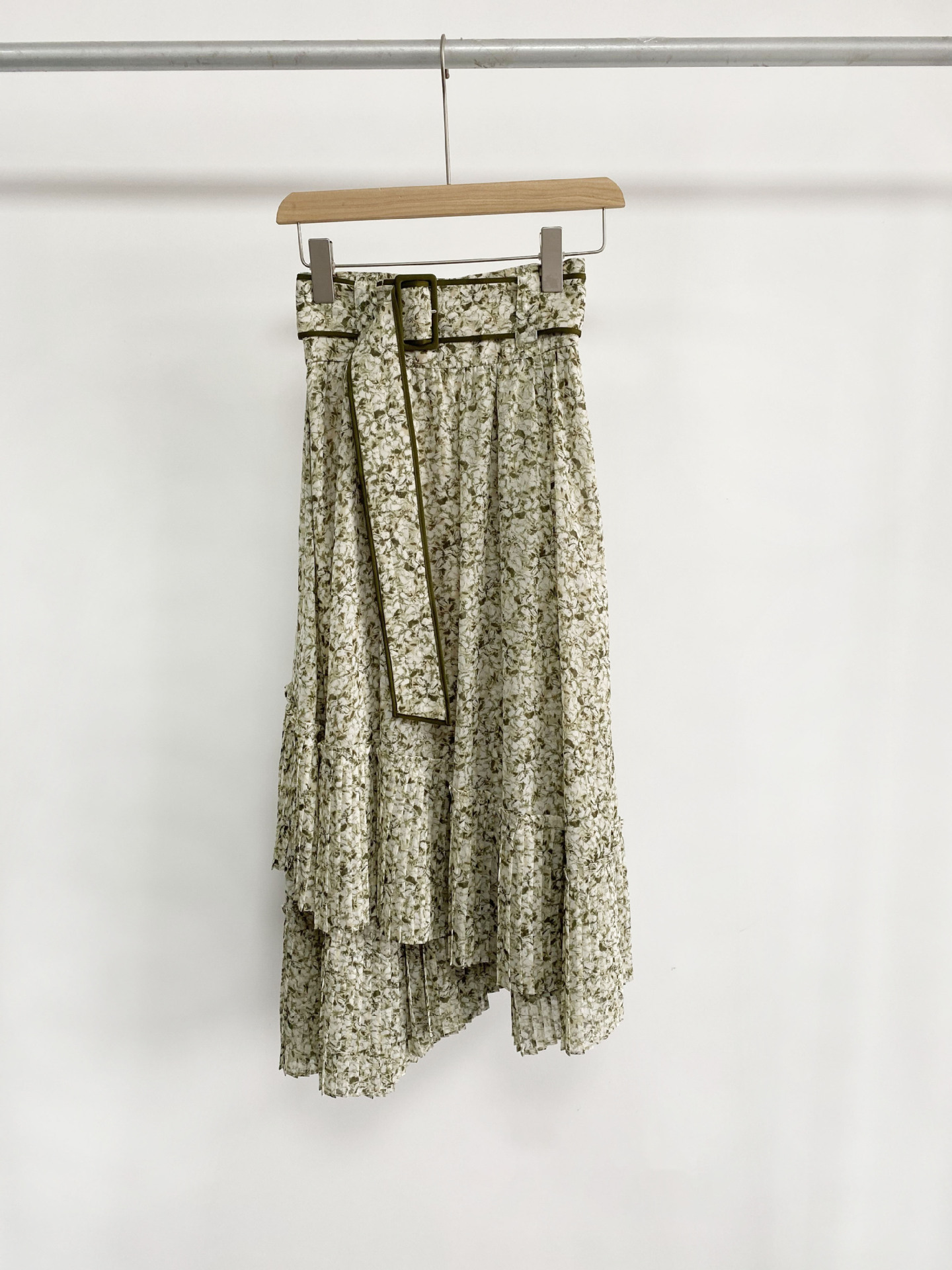 一面に浮かべたオリジナルのフラワープリントが印象的な、春らしいムードを感じさせるスカート。裾にプリーツをふんだんに施したイレギュラーヘムが歩くたびになびき、女性らしく軽やかな表情を演出しています。パイピングでアクセントを付けた同素材のベルトでウエストマークすれば引き締まった印象に。トップスはウエストにインしてすっきりとまとめるのがスタイルアップの秘訣です。