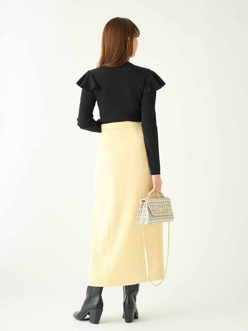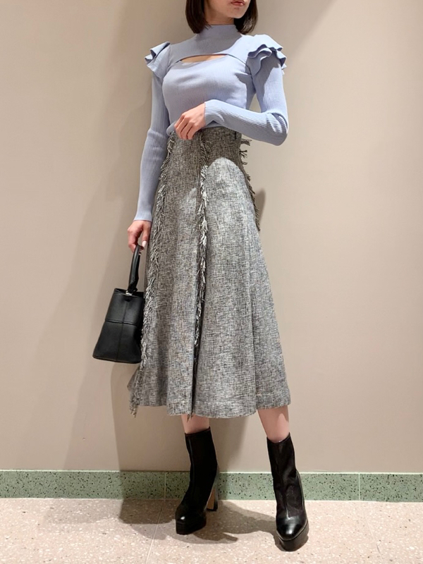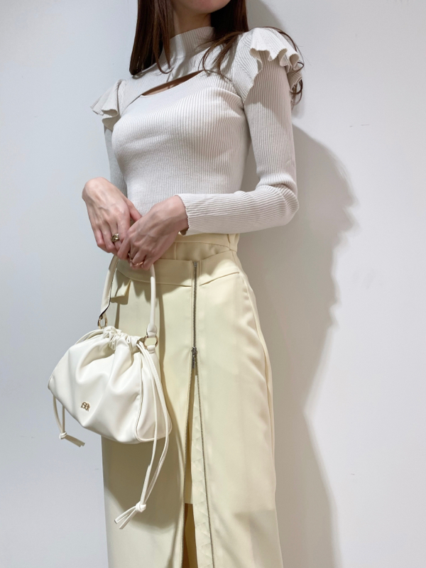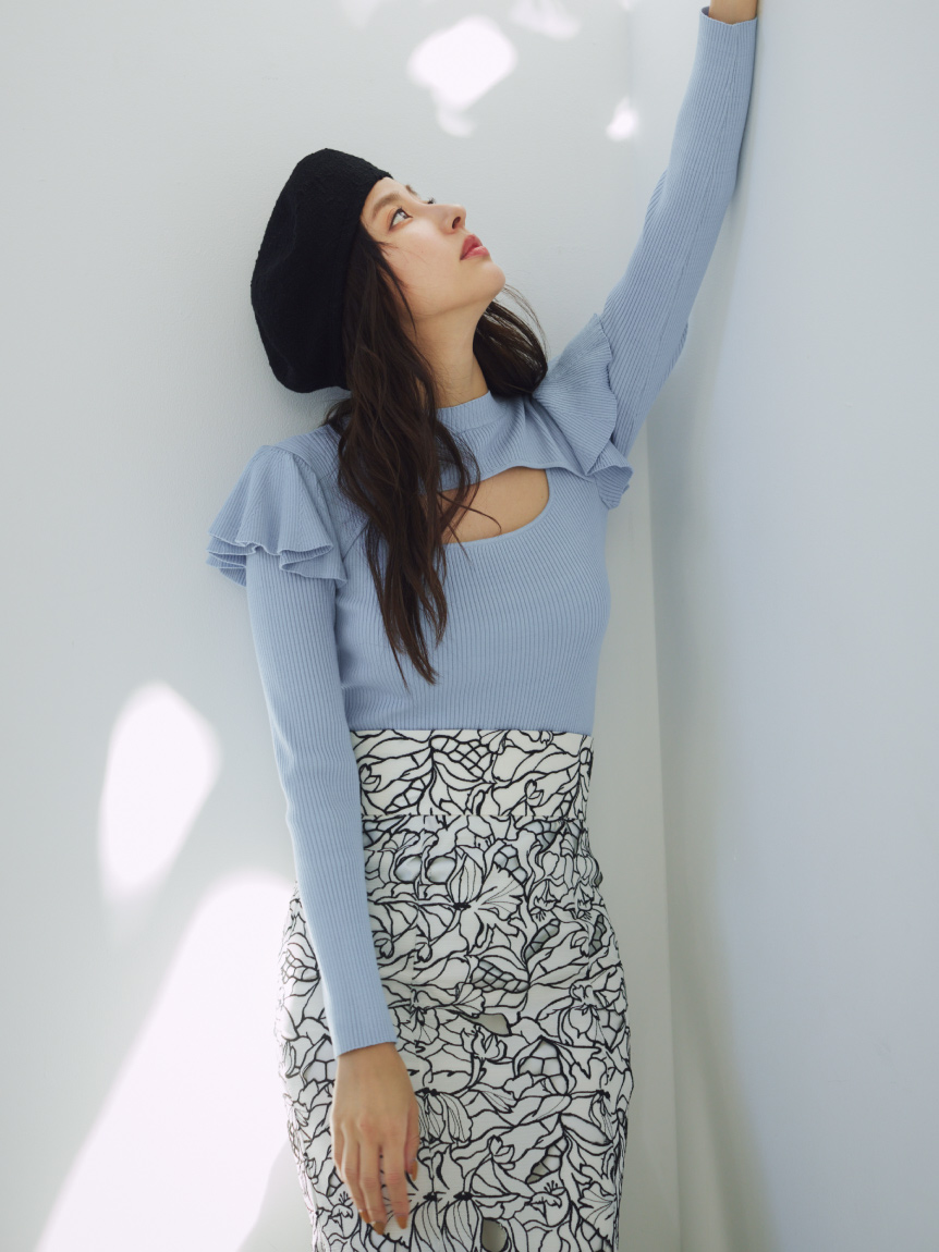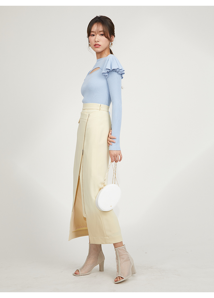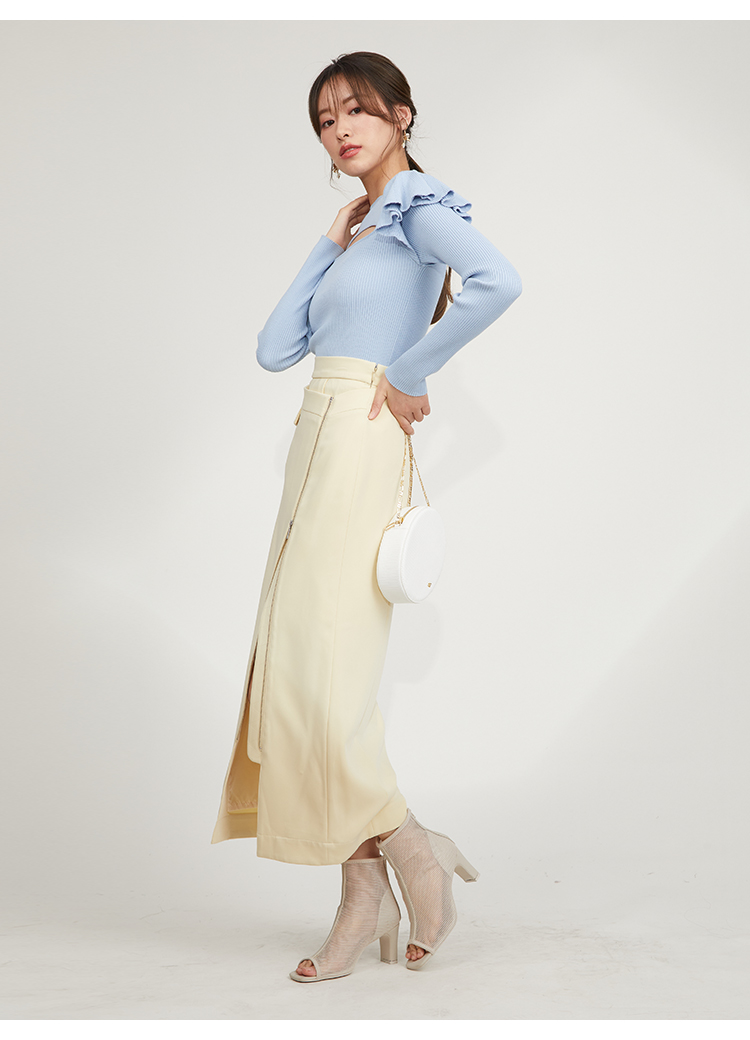 デコルテのカッティングが印象的な、今年らしい肌見せを叶えてくれるニットトップス。袖にはフリルパーツを挟み込むことで「SNIDEL」らしさをプラス。1枚でも華やかに決まる優秀アイテムです。ボディラインにフィットするタイトなシルエットなので合わせるボトムを選ばず幅広く活躍してくれます。