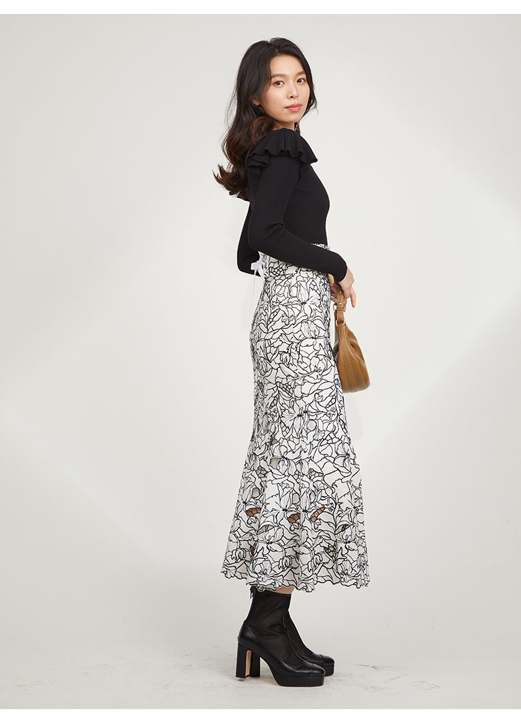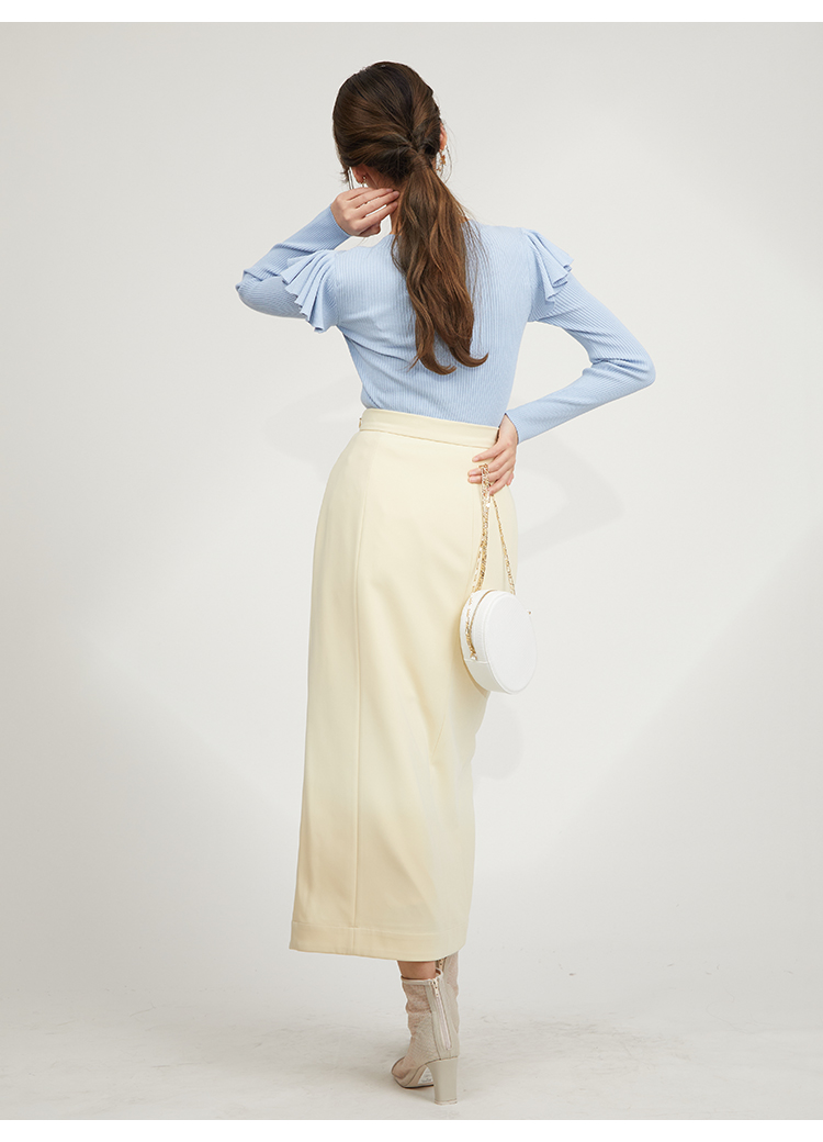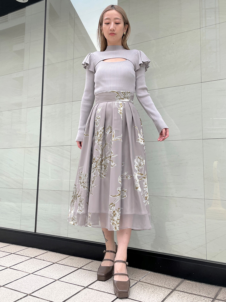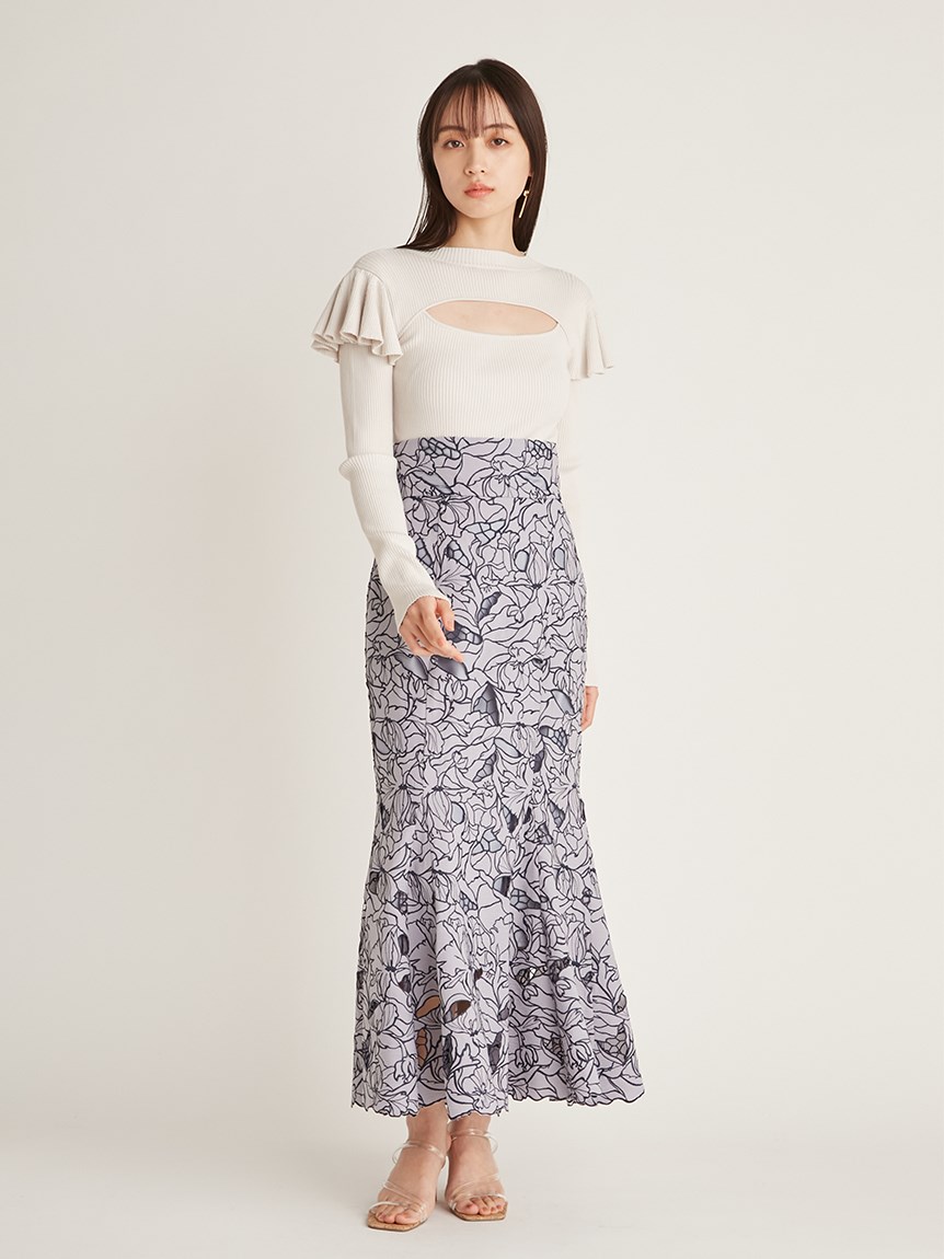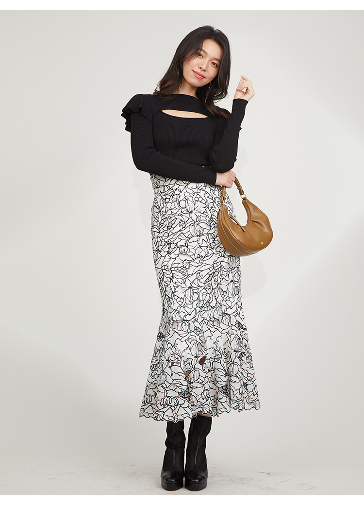 デコルテのカッティングが印象的な、今年らしい肌見せを叶えてくれるニットトップス。袖にはフリルパーツを挟み込むことで「SNIDEL」らしさをプラス。1枚でも華やかに決まる優秀アイテムです。ボディラインにフィットするタイトなシルエットなので合わせるボトムを選ばず幅広く活躍してくれます。