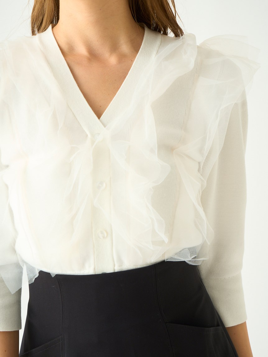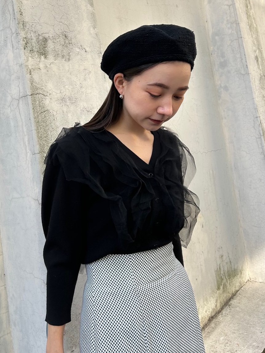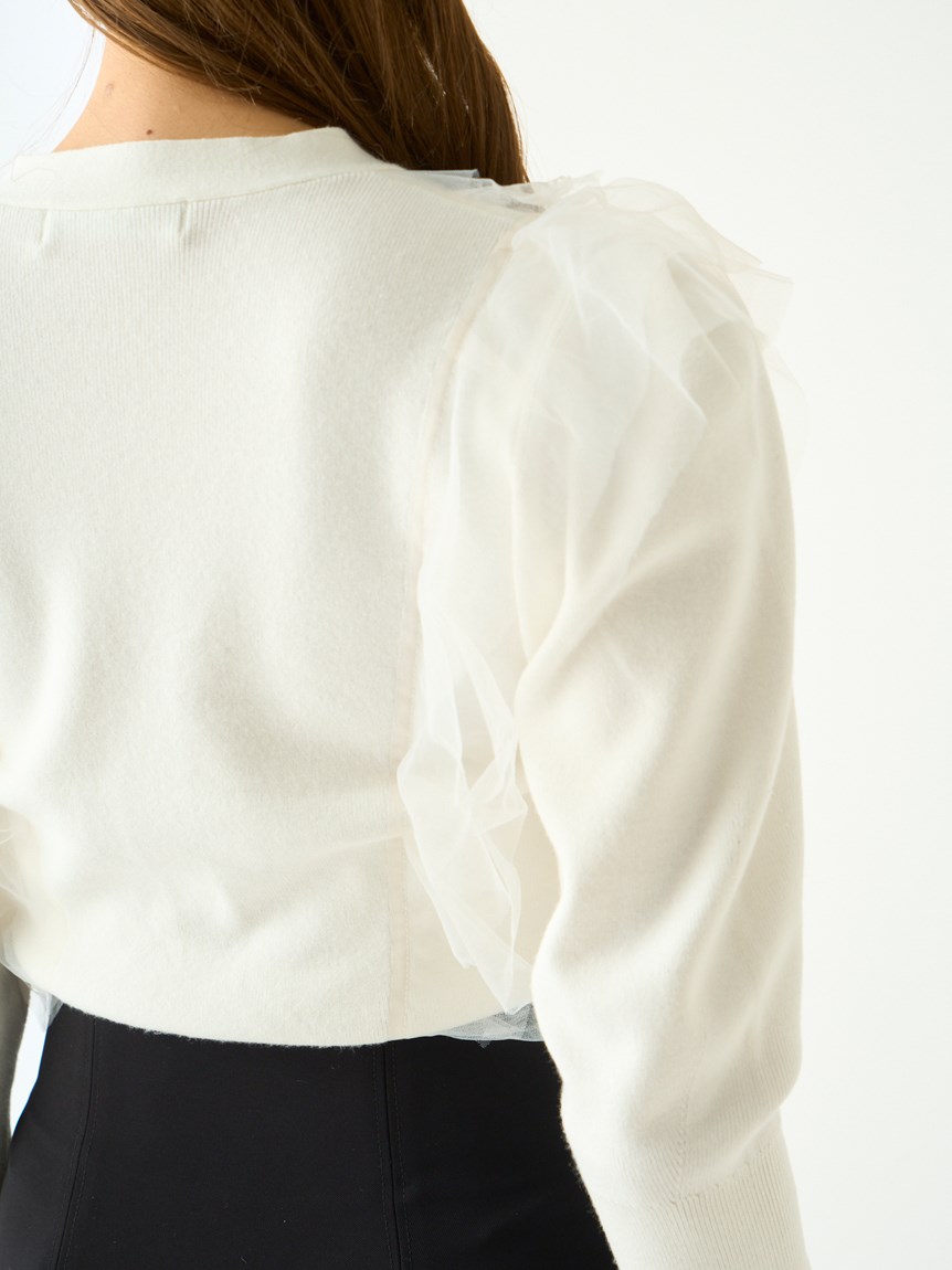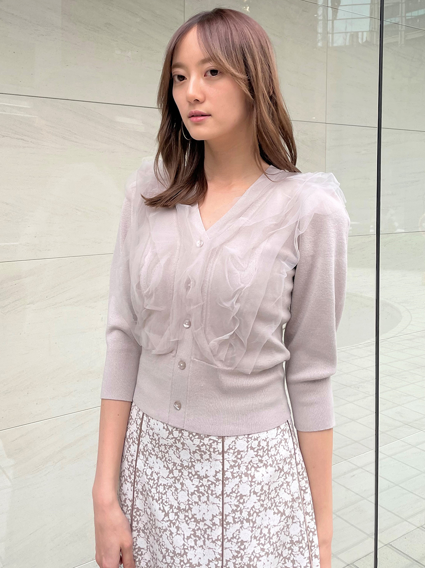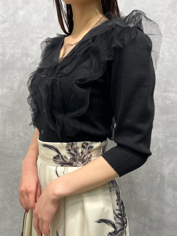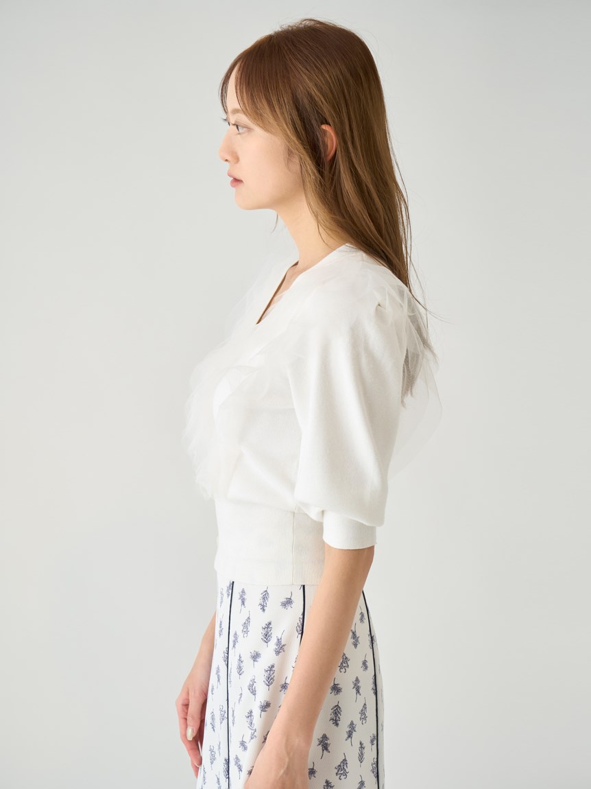エコレーヨンを用いたサステナブルなニットにチュールをドッキングしました。アイボリー、ブラック、ベージュのベーシックなカラー展開でお届けします。