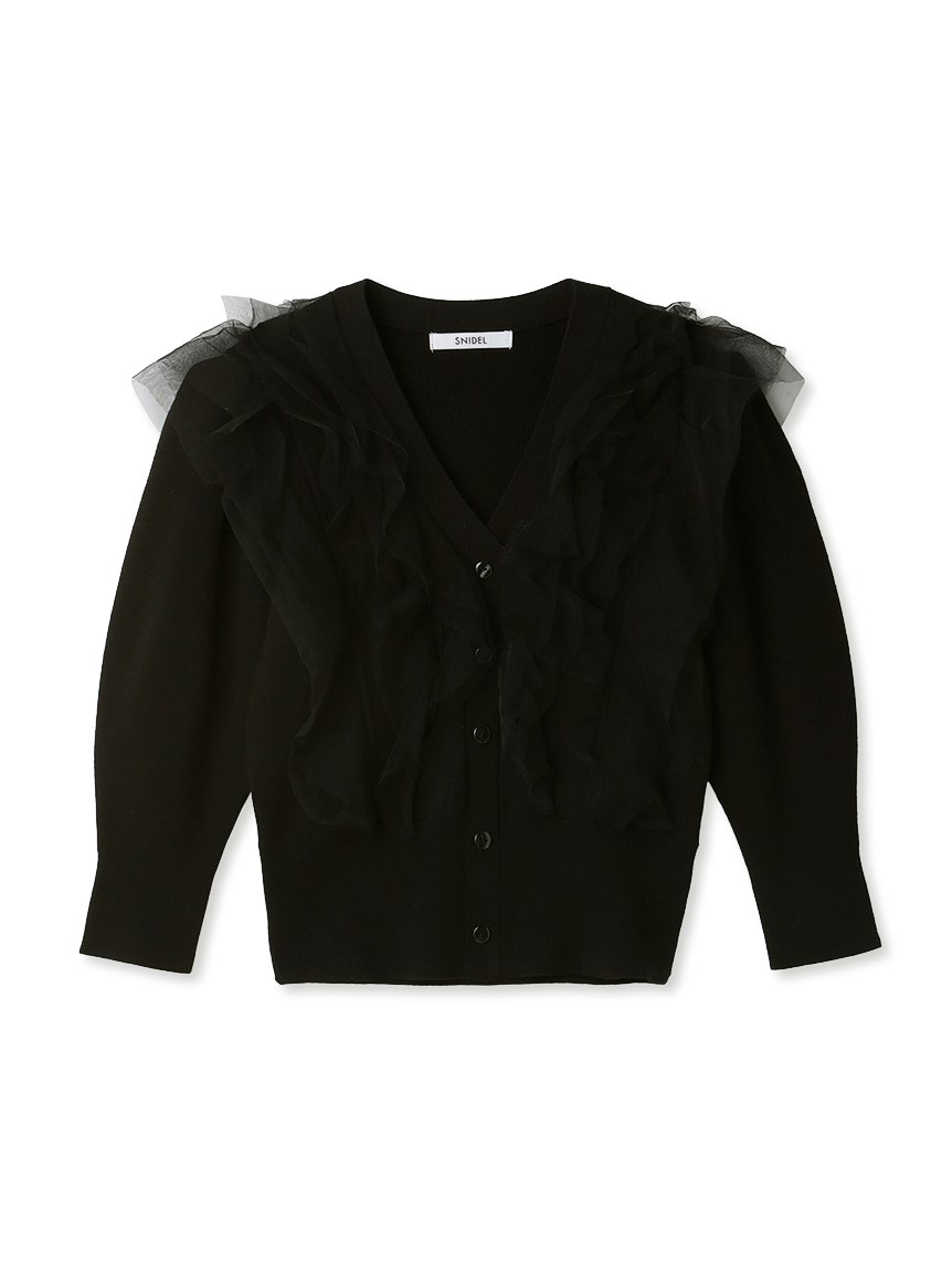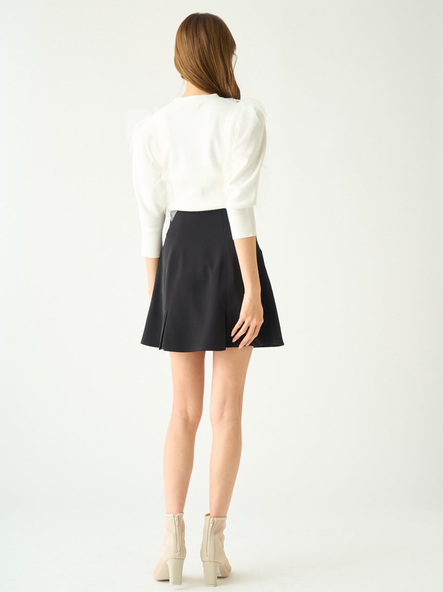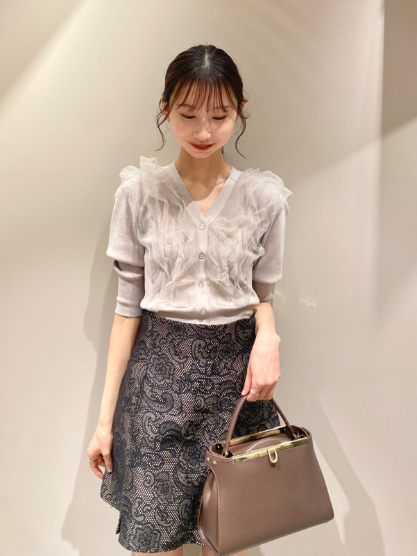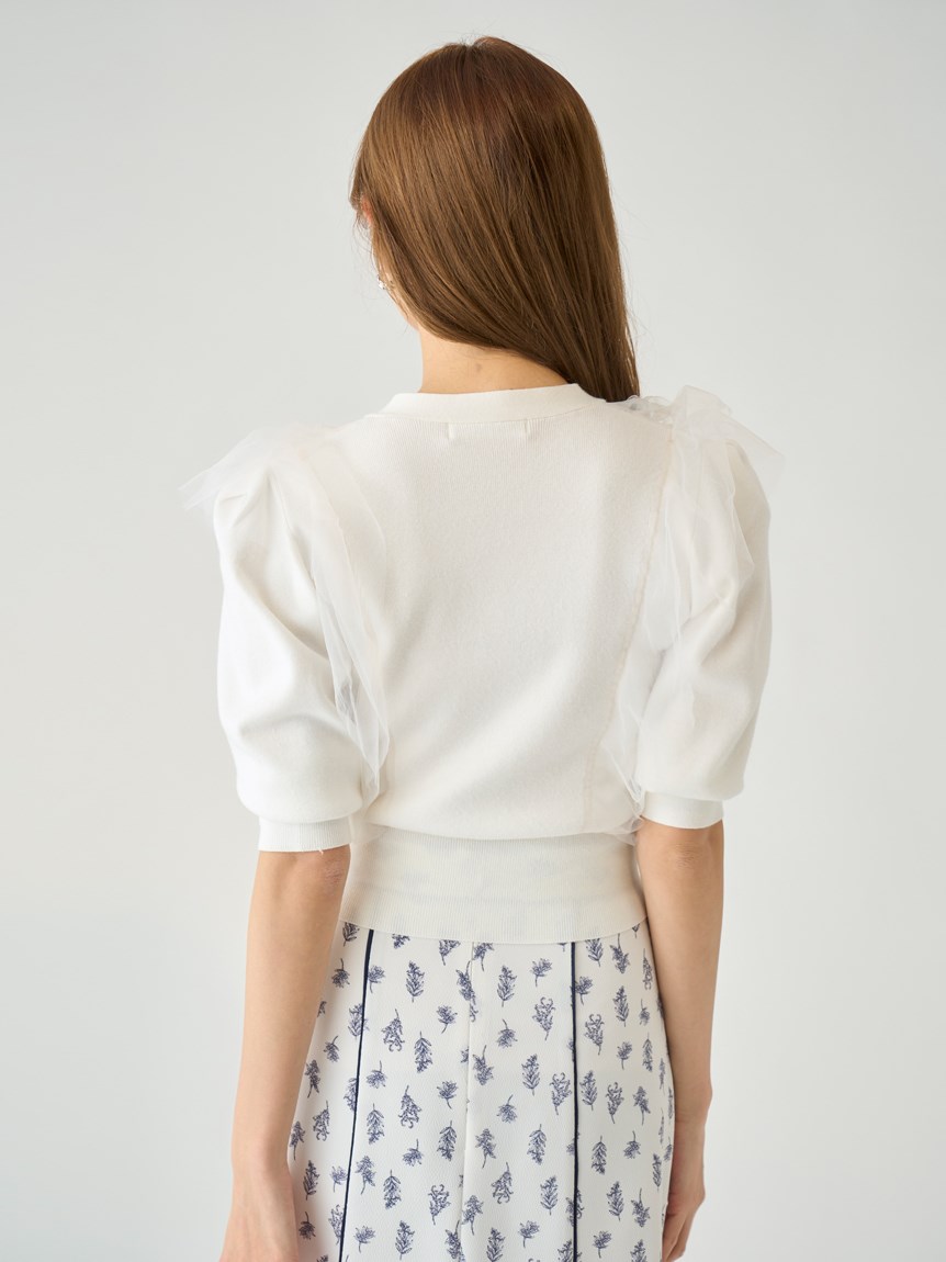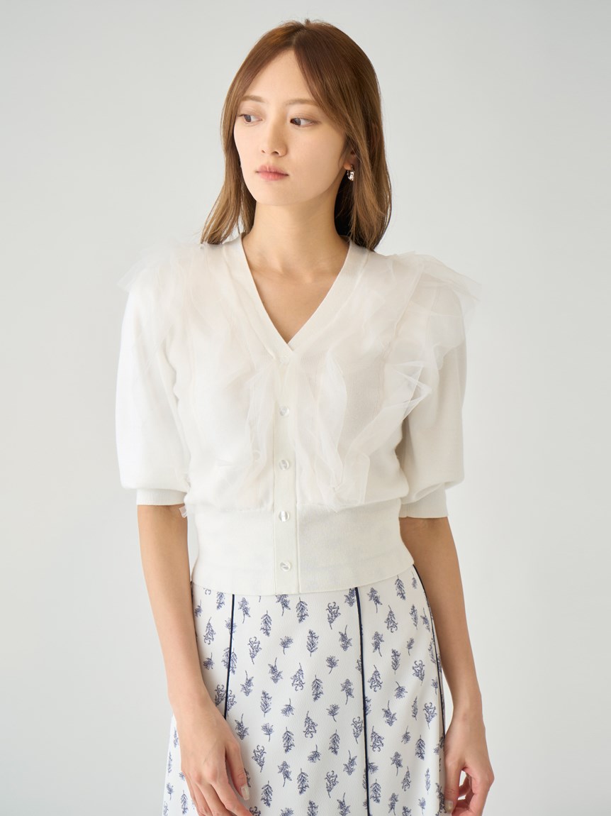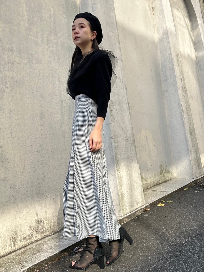 エコレーヨンを用いたサステナブルなニットにチュールをドッキングしました。アイボリー、ブラック、ベージュのベーシックなカラー展開でお届けします。