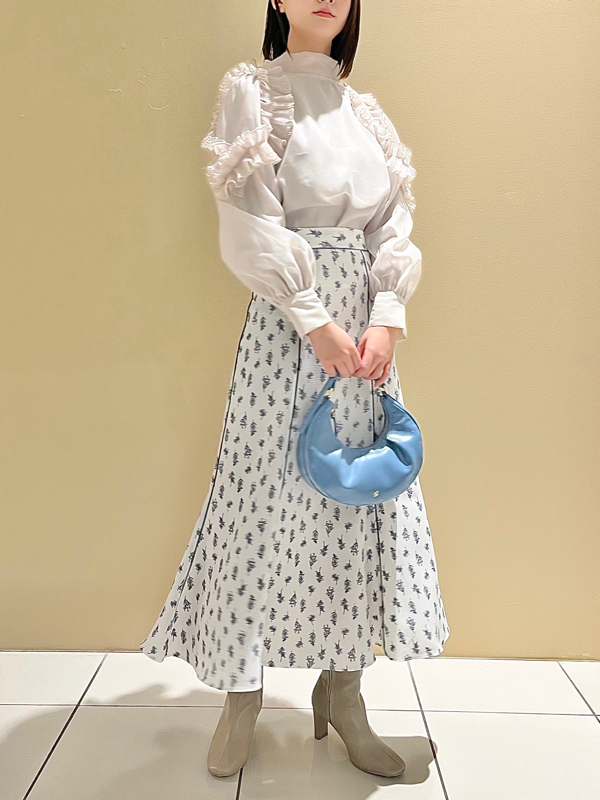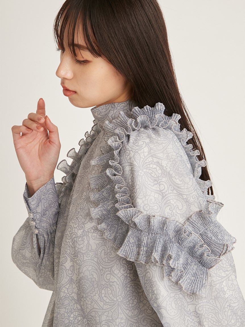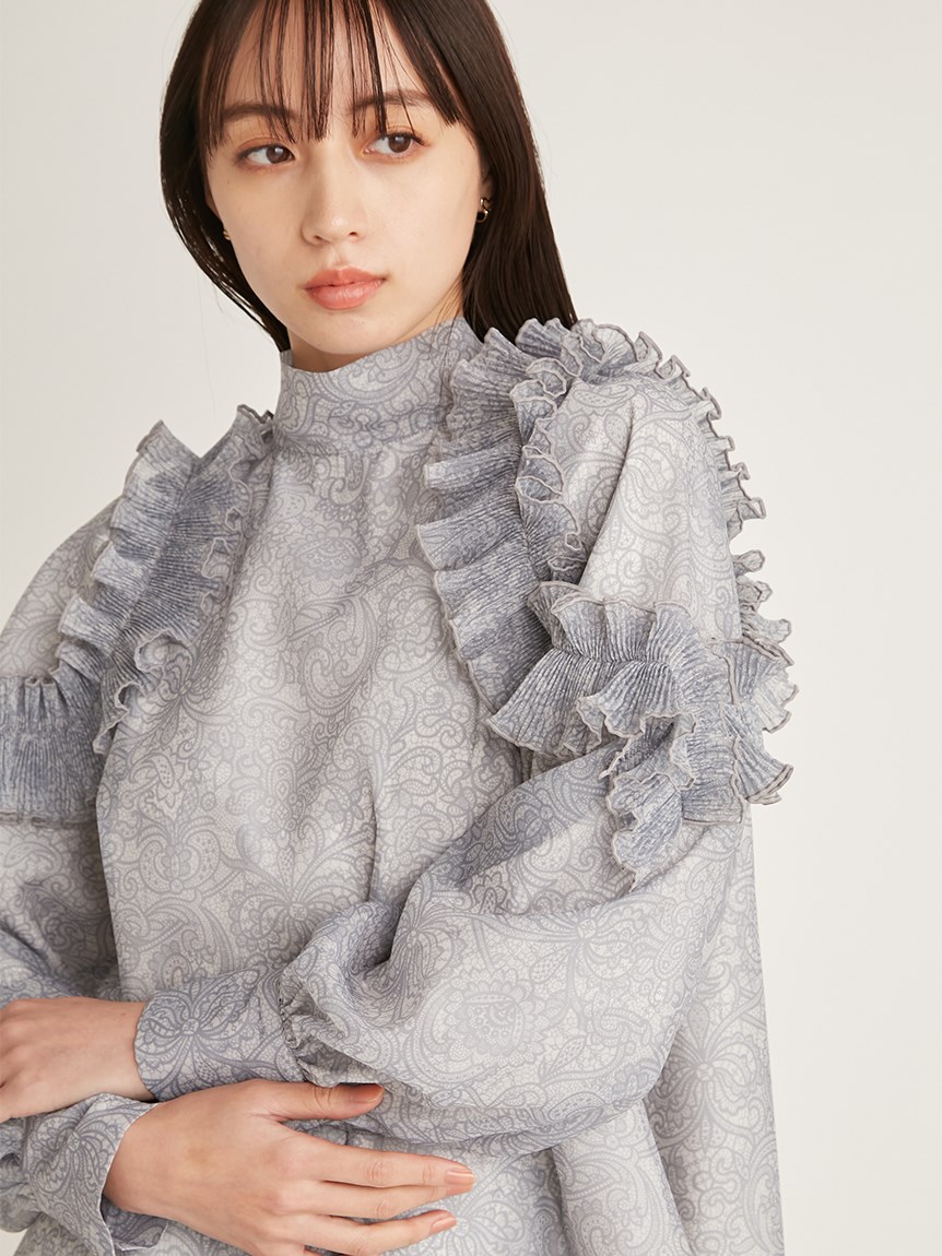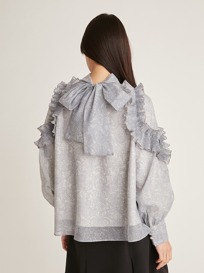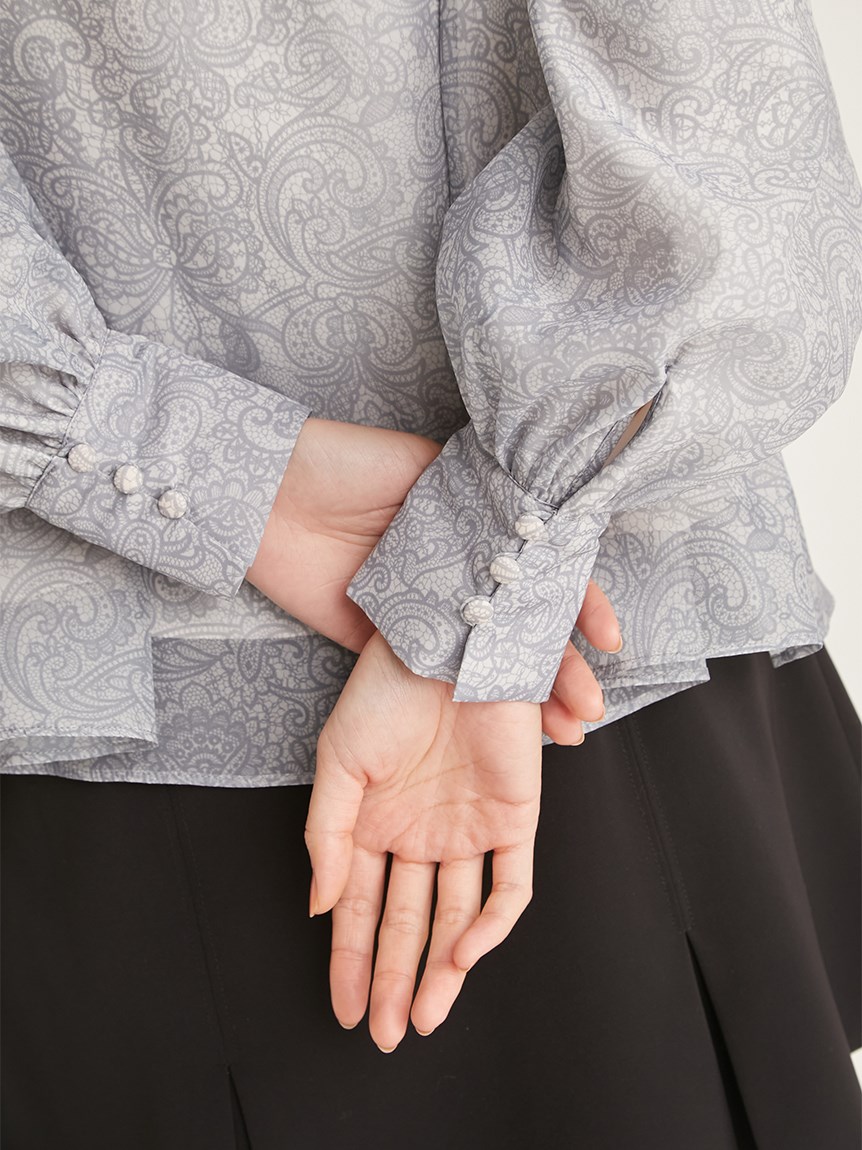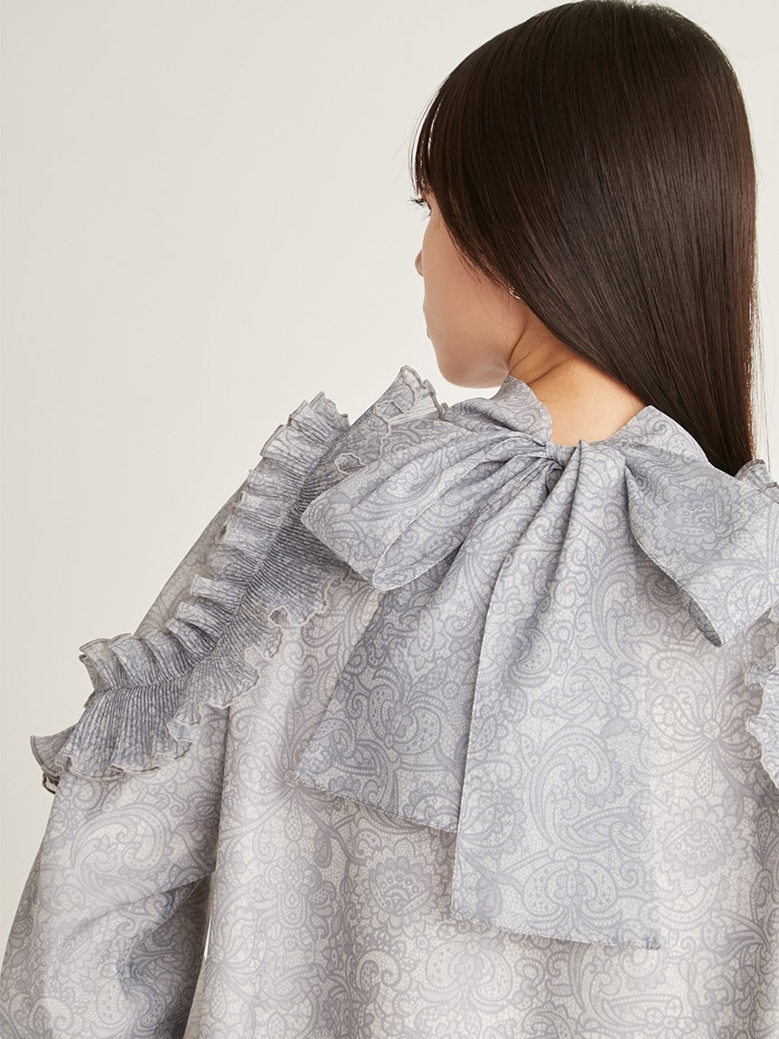 リサイクル素材を用いたサステナブルなオーガンジーを使用しました。淡い色合いが優しい印象を与えるオフホワイト、グレー、ライトピンクに、クラシカルなプリントをのせたミックスの4色をご用意。