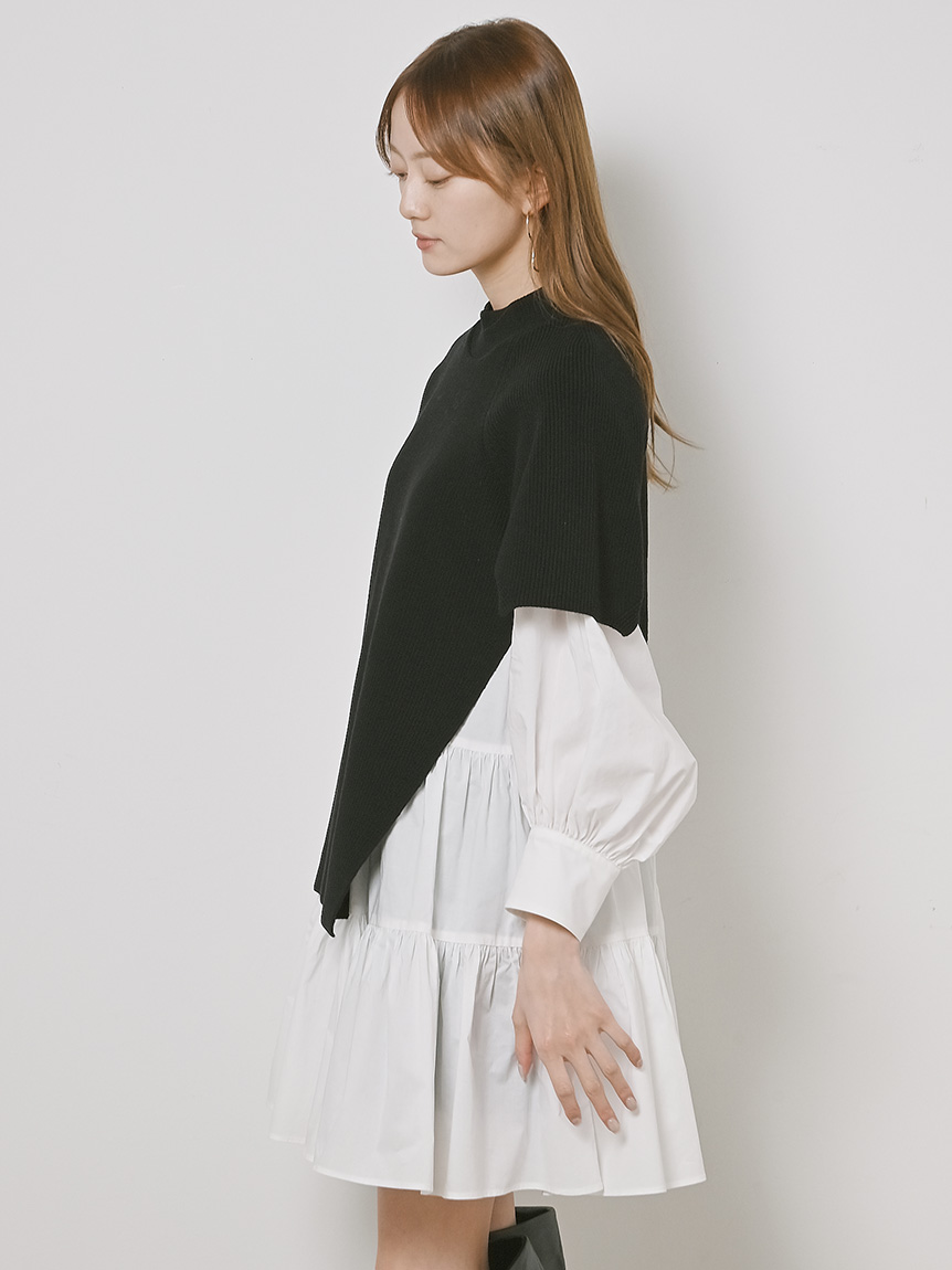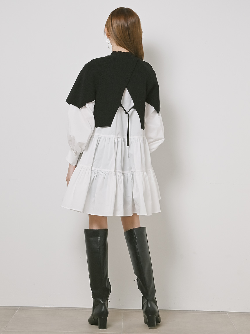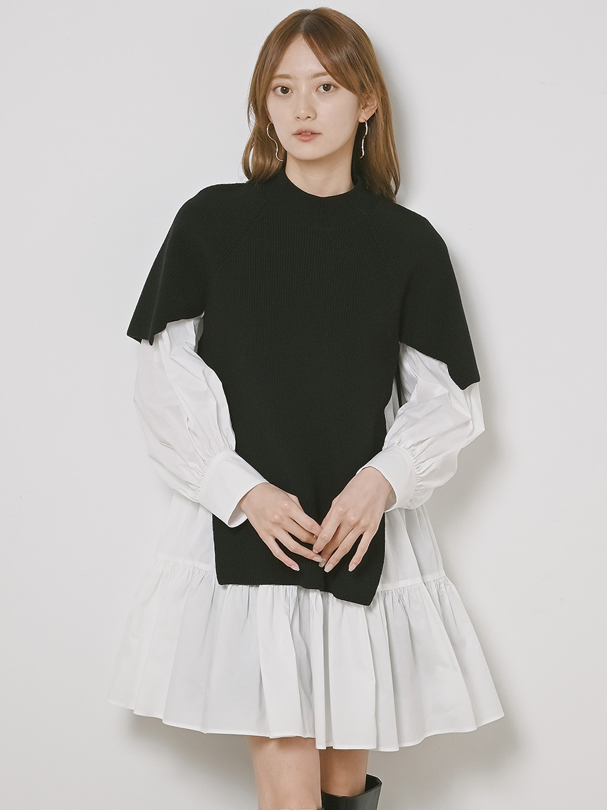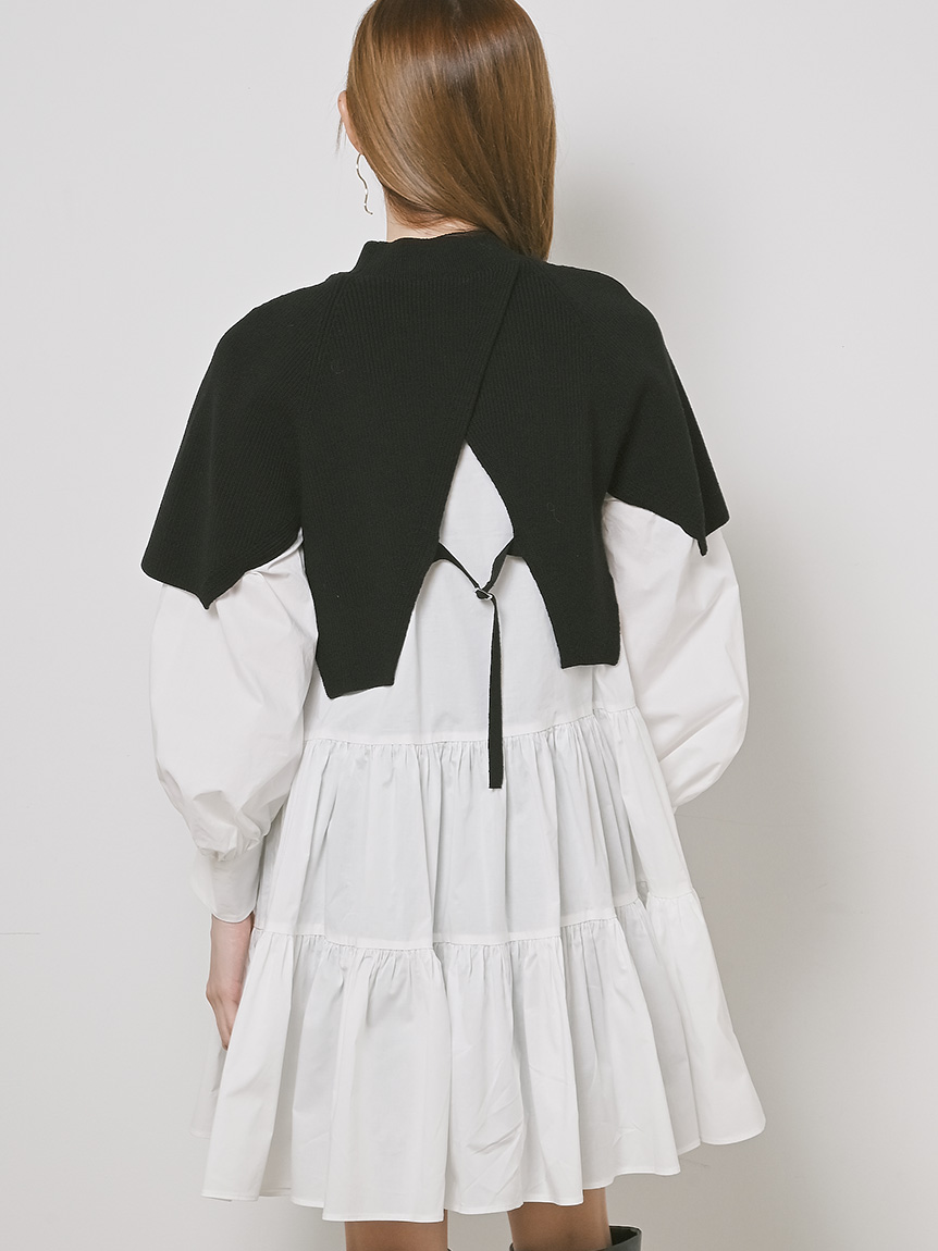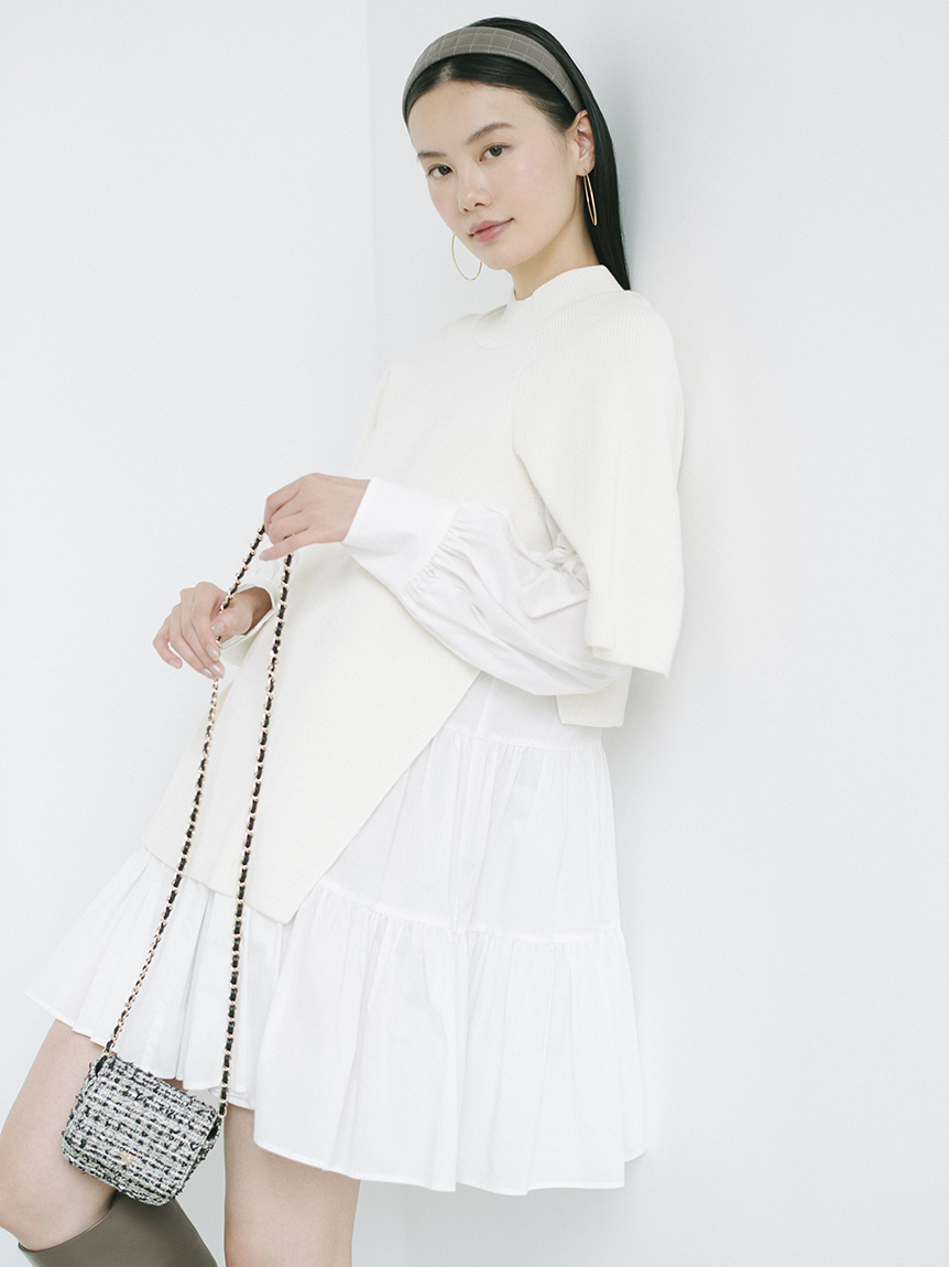 ニットトップスをレイヤードしたような、ドッキングデザインのミニワンピース。ニットの着丈を後ろはぐっと短くし、布帛のティアードの分量を多くすることで、全体に軽い印象を与えられるようにデザインしました。前後の表情ががらりと変わる絶妙なミスマッチ感が新鮮で、ワンランク上のスタイリングを叶えてくれます。年齢層をあまり問わず着用できる万能アイテムです。