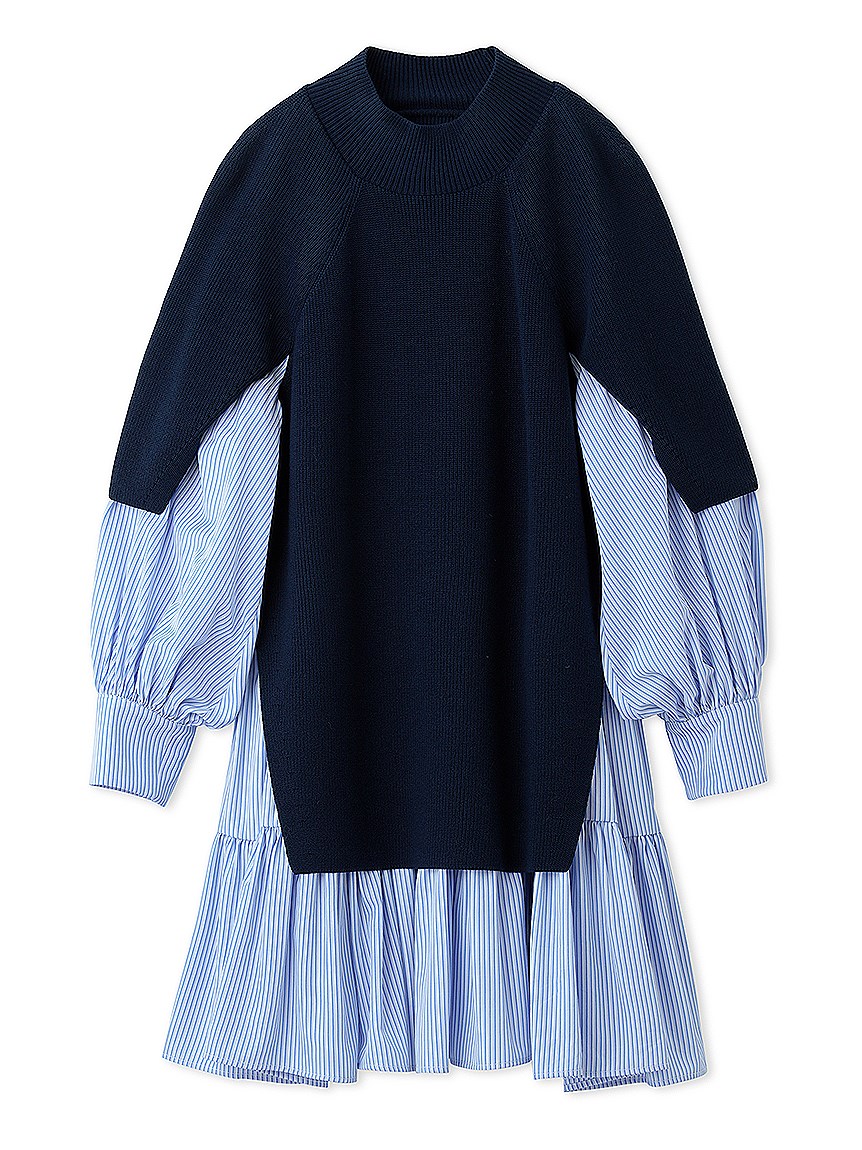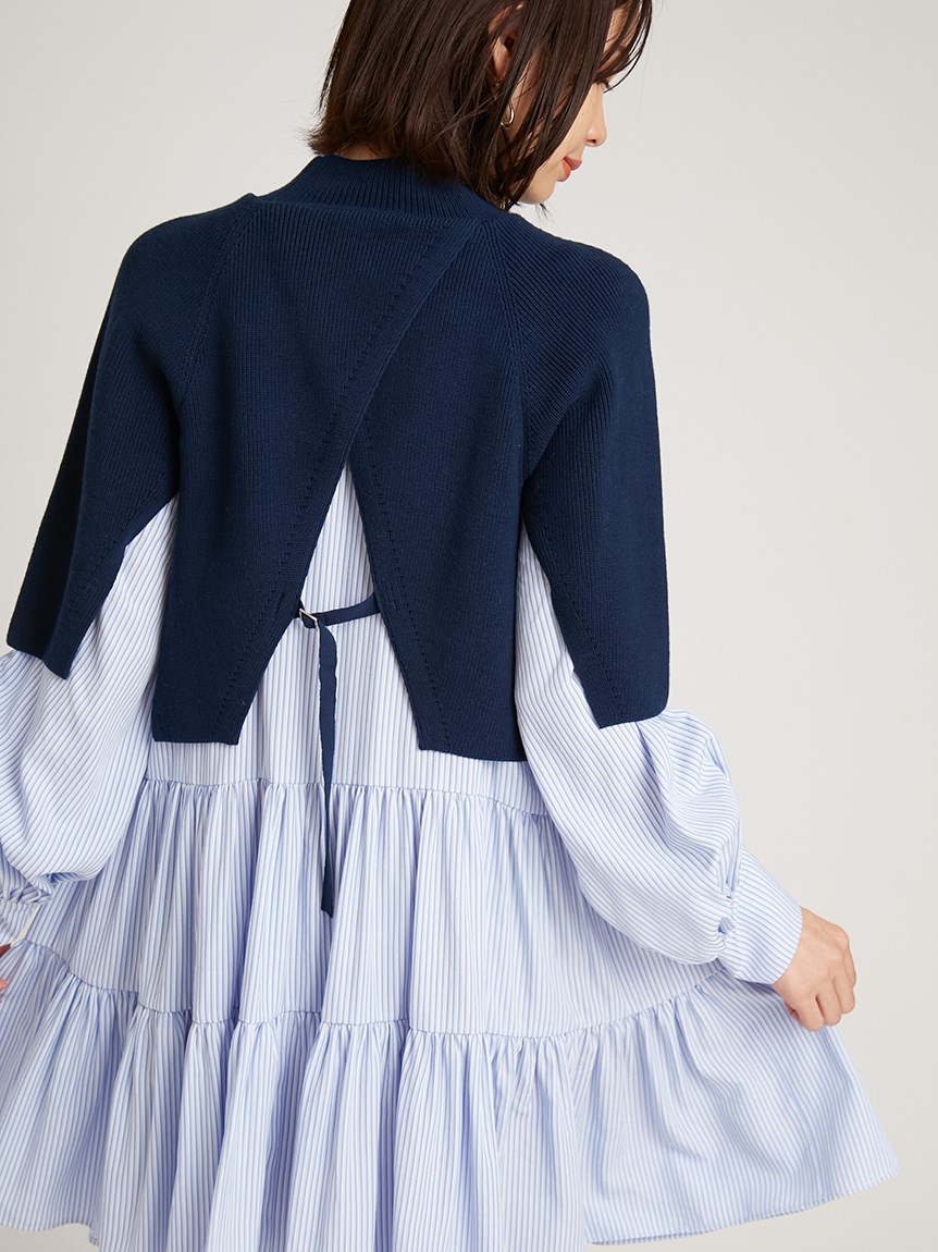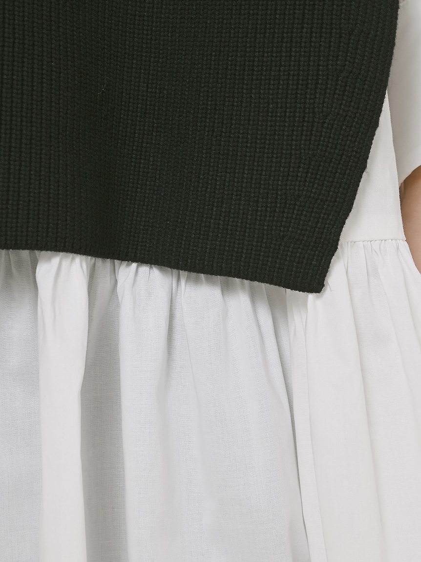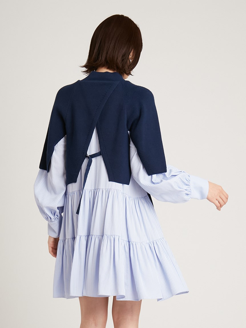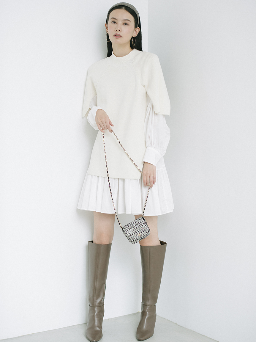 ニットトップスをレイヤードしたような、ドッキングデザインのミニワンピース。ニットの着丈を後ろはぐっと短くし、布帛のティアードの分量を多くすることで、全体に軽い印象を与えられるようにデザインしました。前後の表情ががらりと変わる絶妙なミスマッチ感が新鮮で、ワンランク上のスタイリングを叶えてくれます。年齢層をあまり問わず着用できる万能アイテムです。