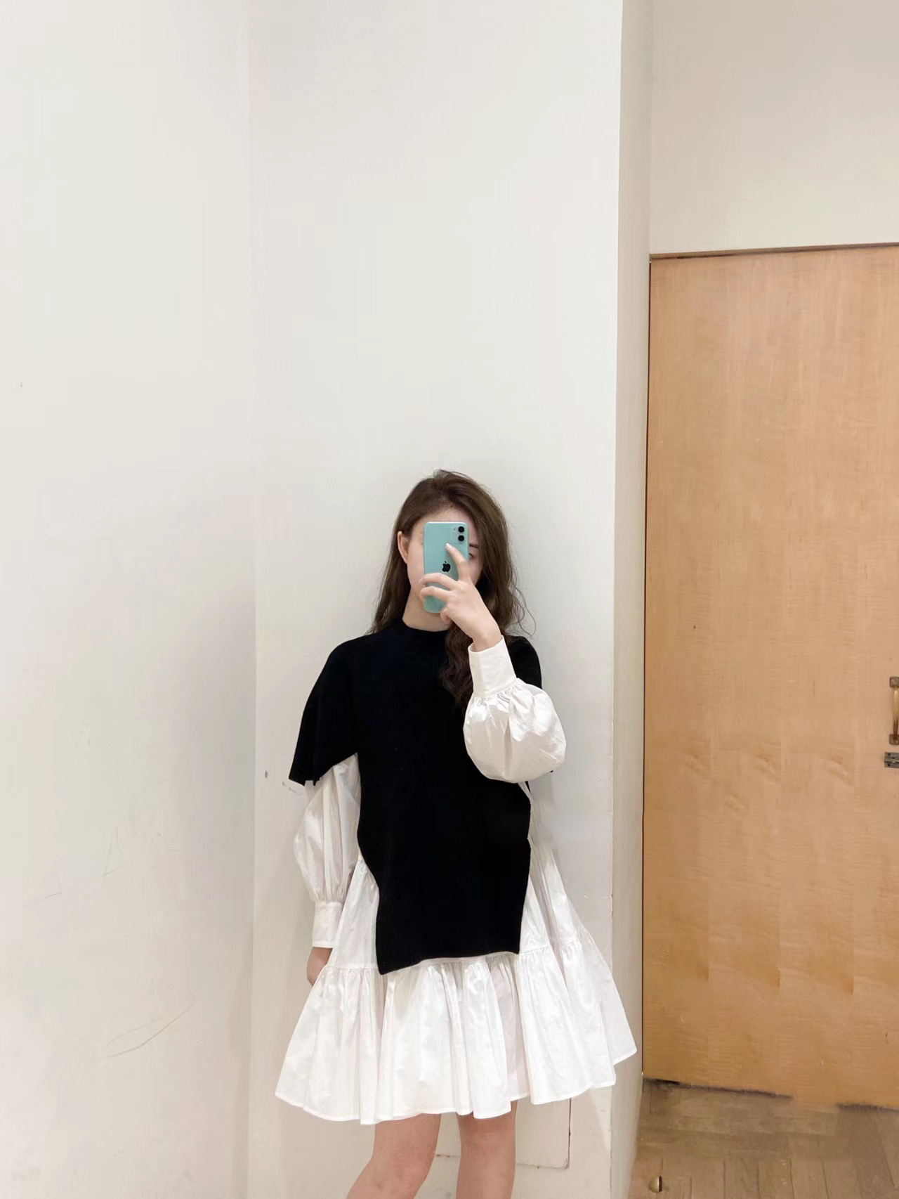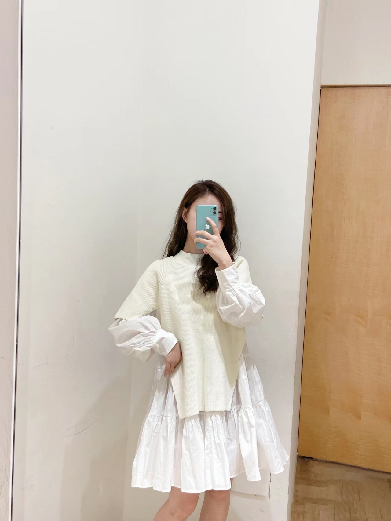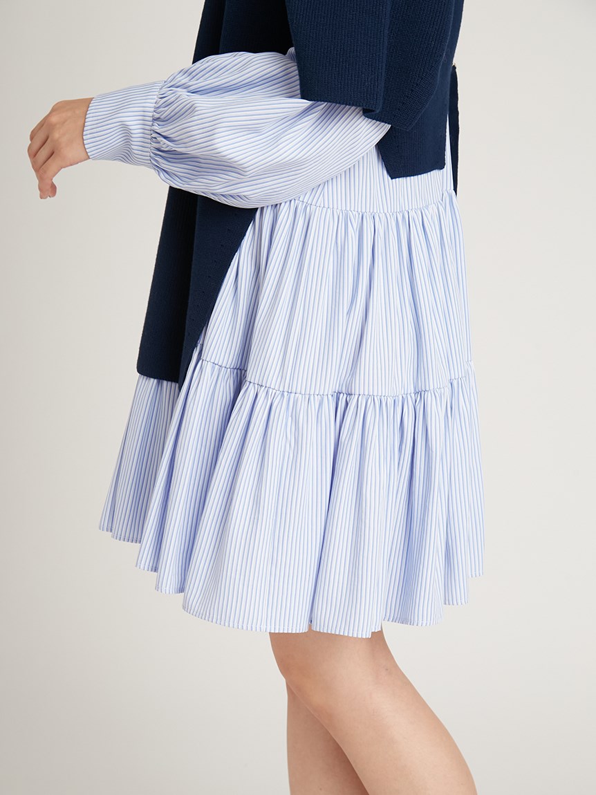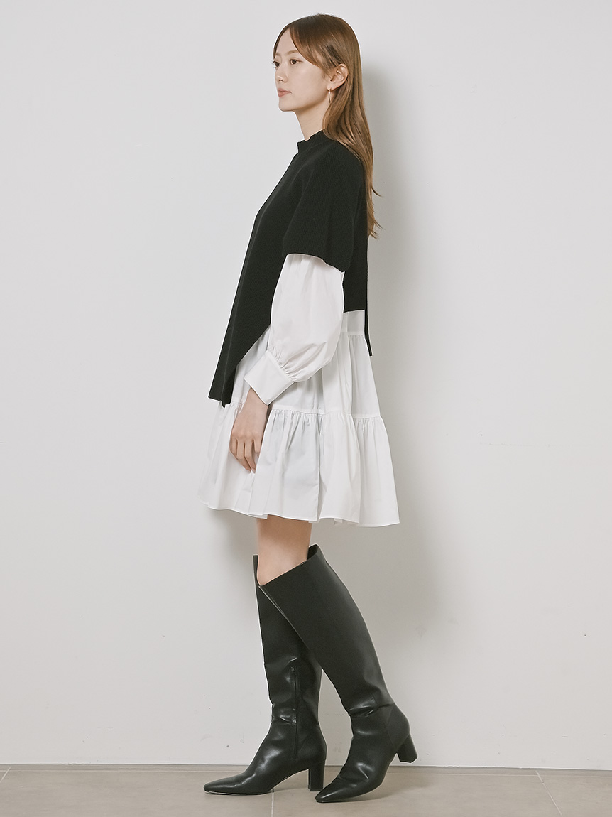 ニットトップスをレイヤードしたような、ドッキングデザインのミニワンピース。ニットの着丈を後ろはぐっと短くし、布帛のティアードの分量を多くすることで、全体に軽い印象を与えられるようにデザインしました。前後の表情ががらりと変わる絶妙なミスマッチ感が新鮮で、ワンランク上のスタイリングを叶えてくれます。年齢層をあまり問わず着用できる万能アイテムです。