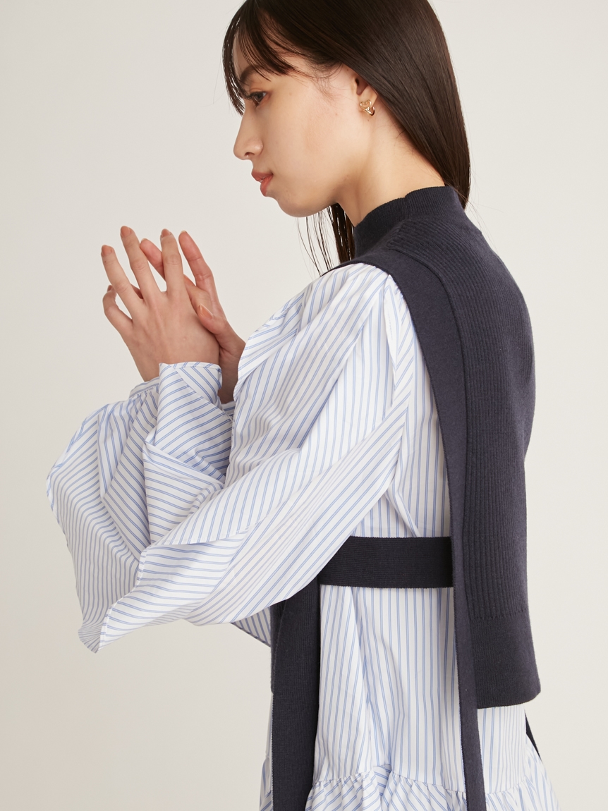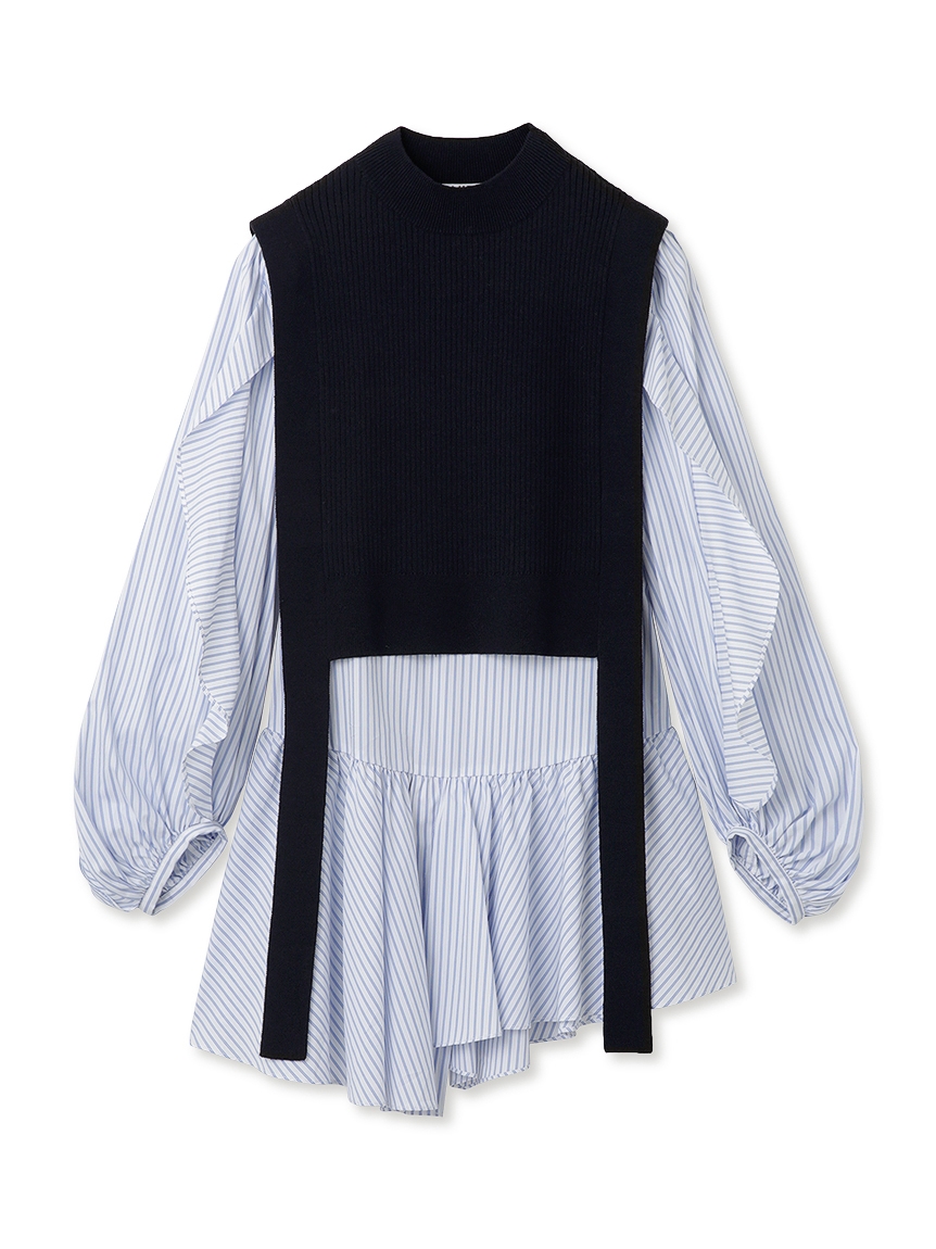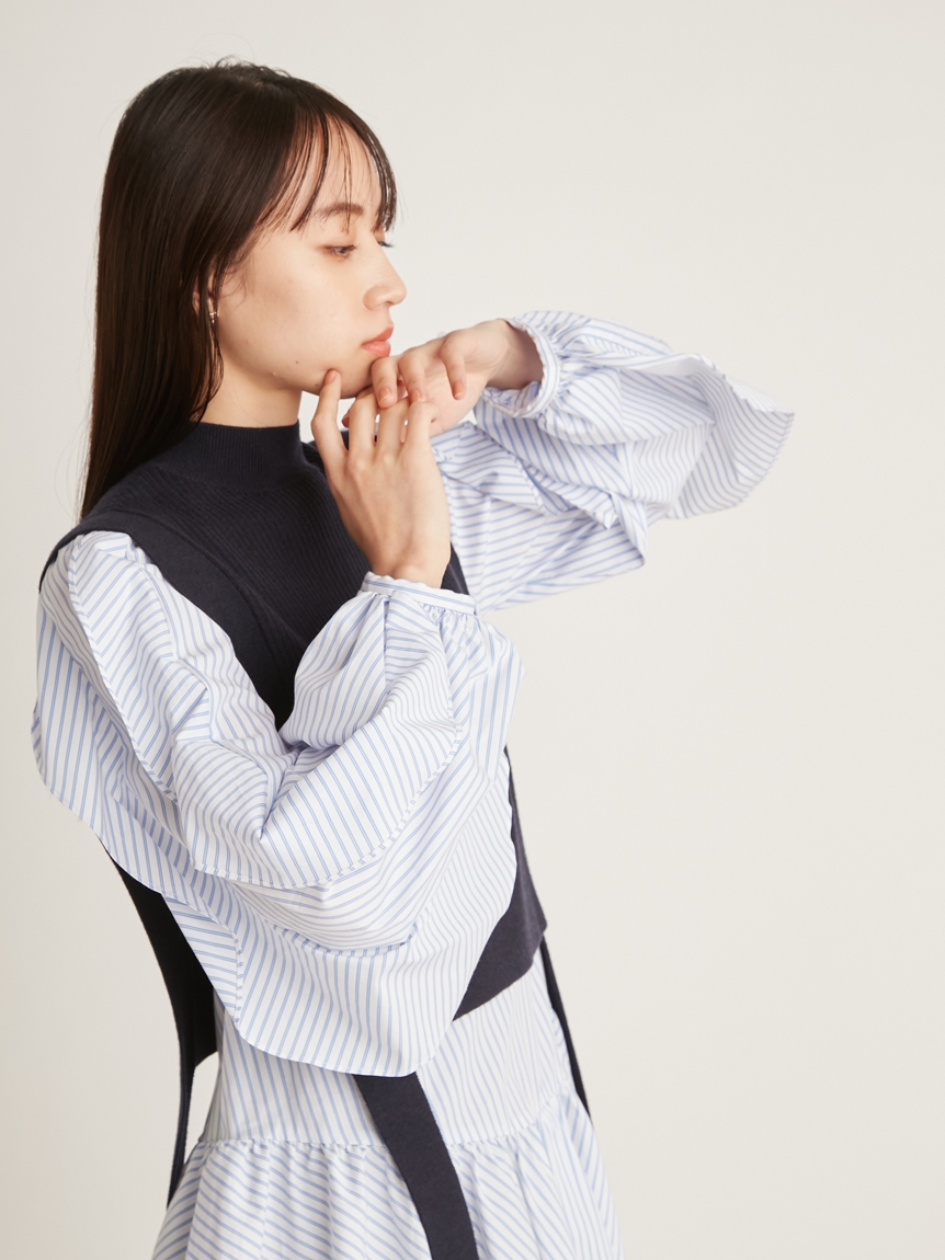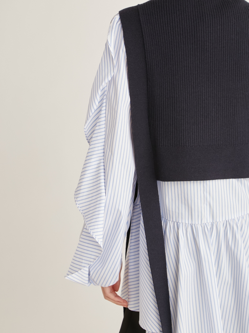 きれいめな質感のリブニットとシンプルなシャツ地を組み合わせました。優しい色合いのアイボリー、ニュアンスカラーのグレーベージュ、バイカラーがモードなネイビーの3色をご用意。