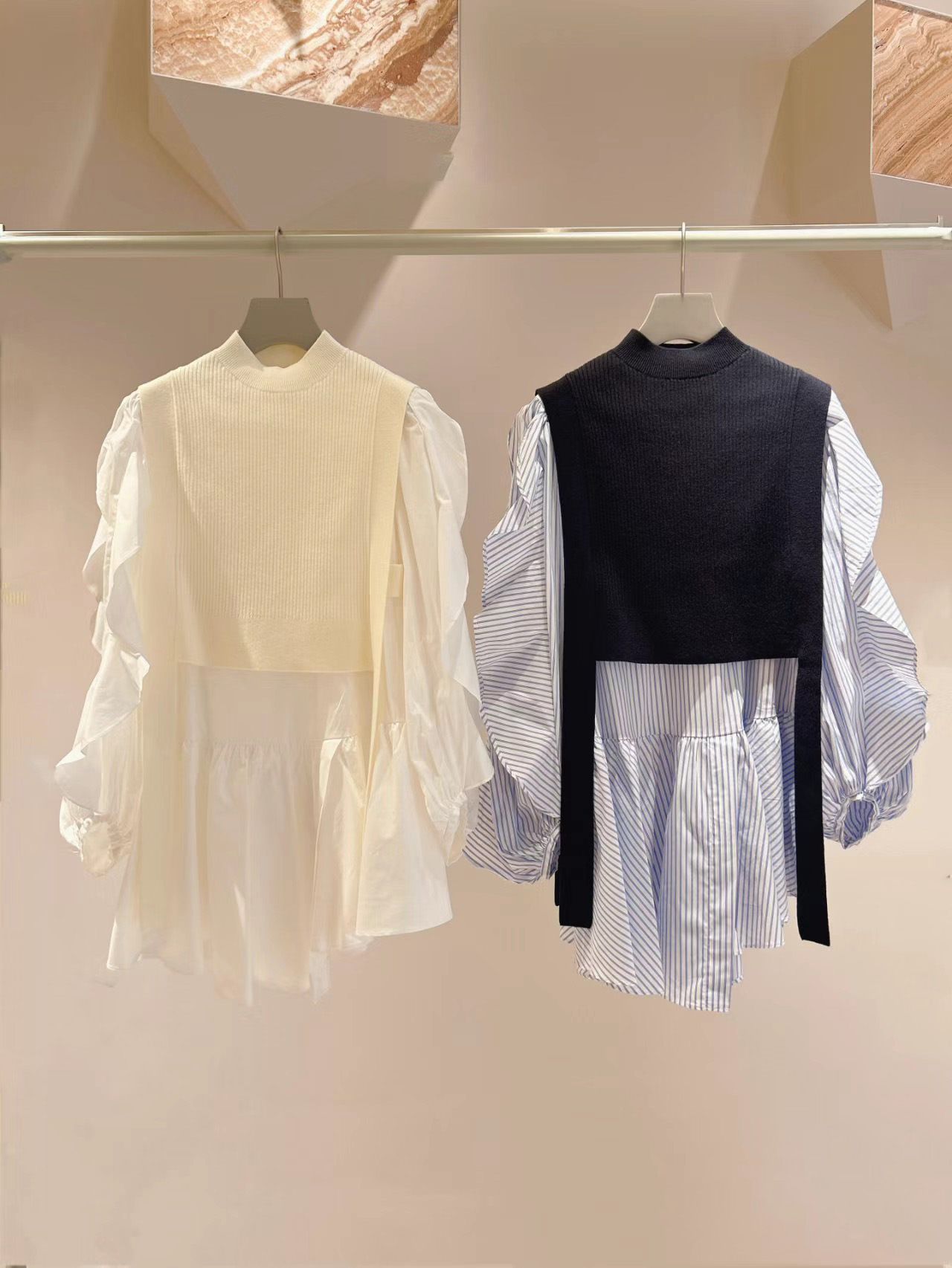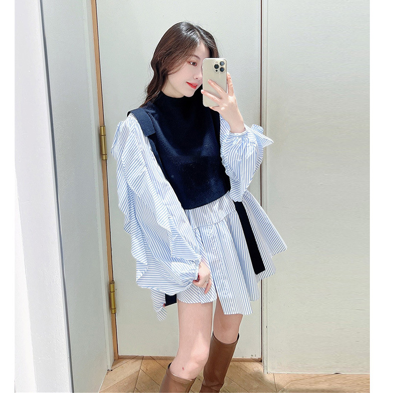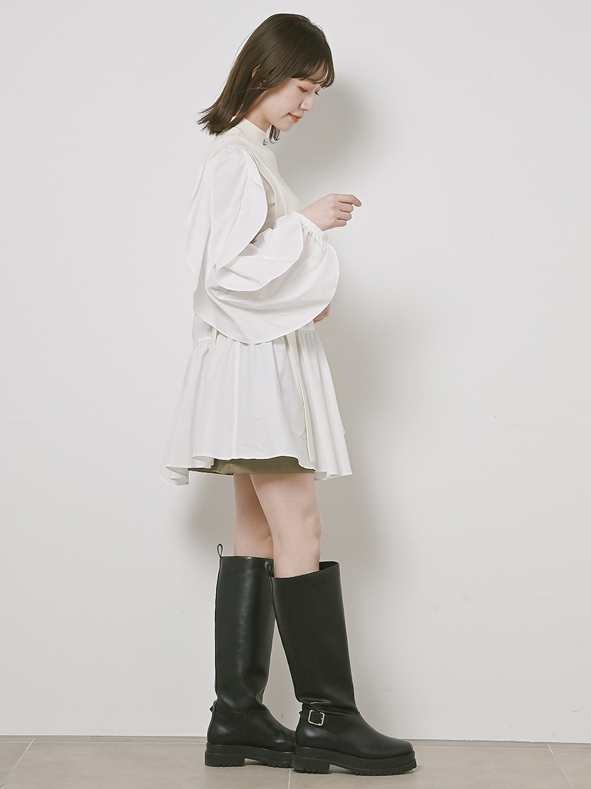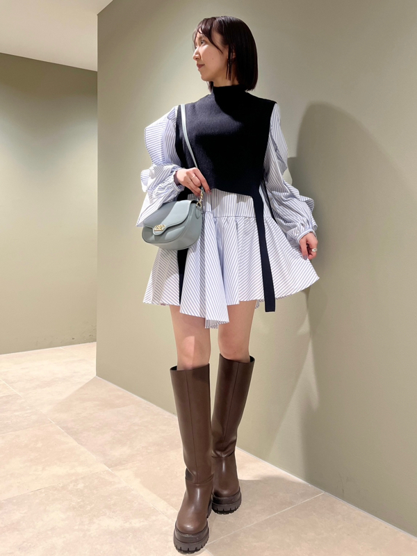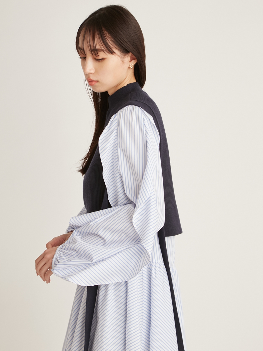 きれいめな質感のリブニットとシンプルなシャツ地を組み合わせました。優しい色合いのアイボリー、ニュアンスカラーのグレーベージュ、バイカラーがモードなネイビーの3色をご用意。