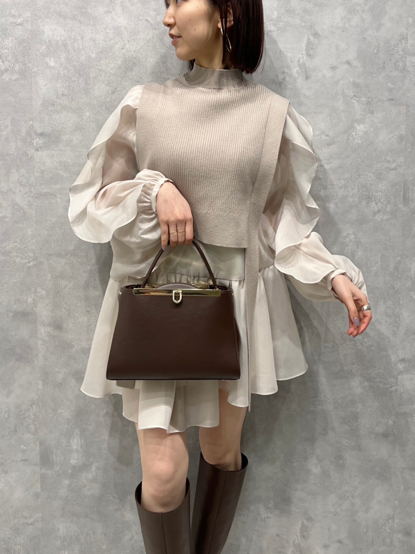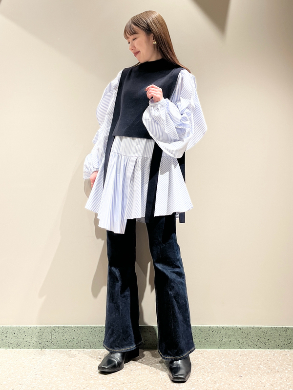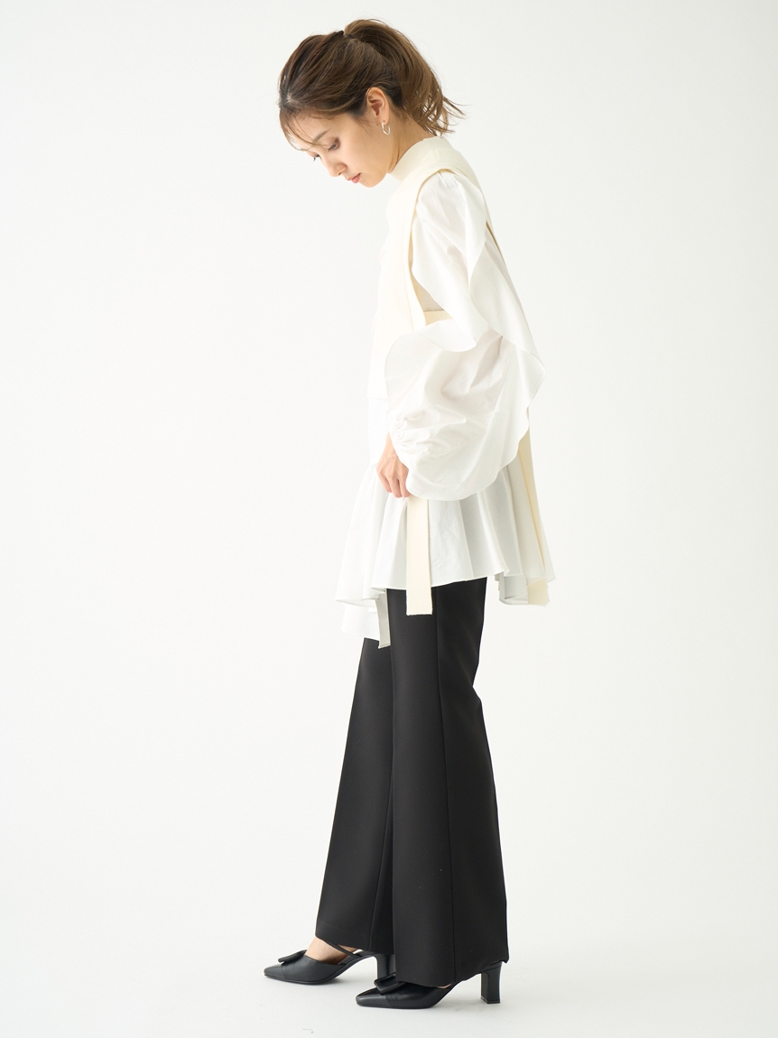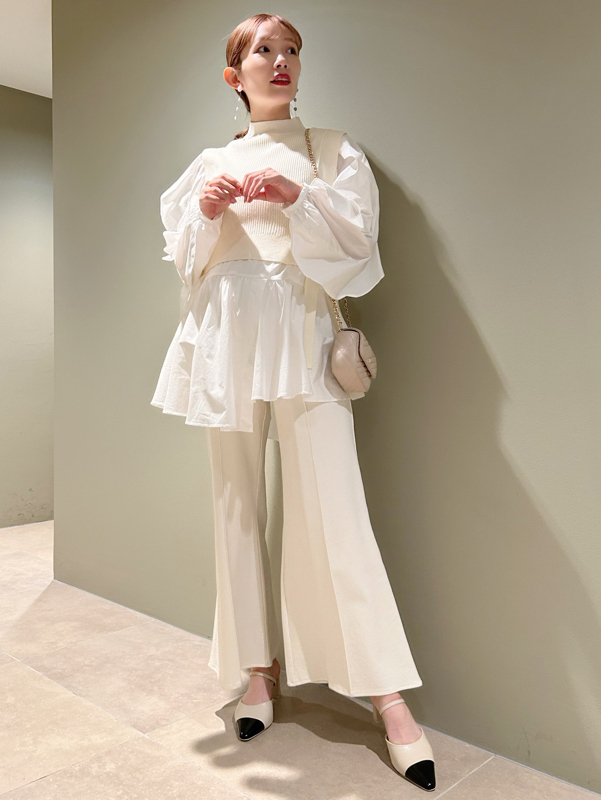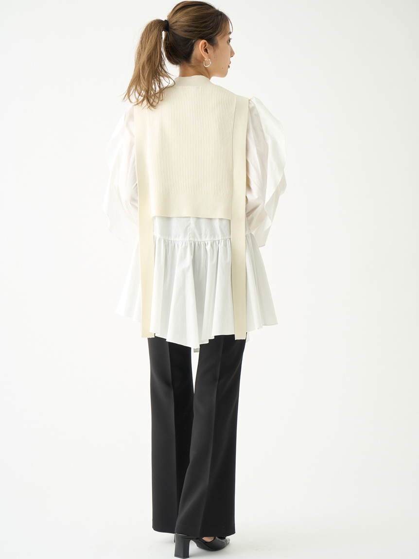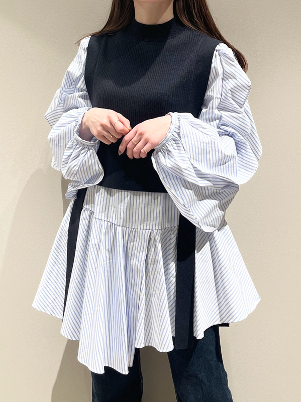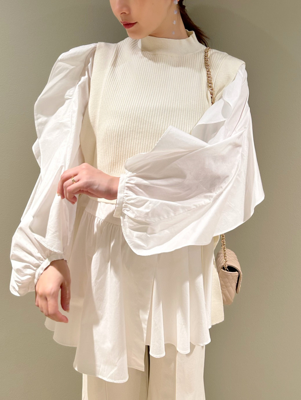 大胆な袖のフリルが目を引くチュニックブラウスにニットベストを組み合わせたセットアイテム。これだけで今年らしいレイヤードスタイルが完成する優秀アイテムです。アシンメトリーなヘムデザインで、フェミニンな中にモードなエッセンスをプラス。それぞれ単品でも活躍してくれるので、コーディネートの幅は一気に広がります。