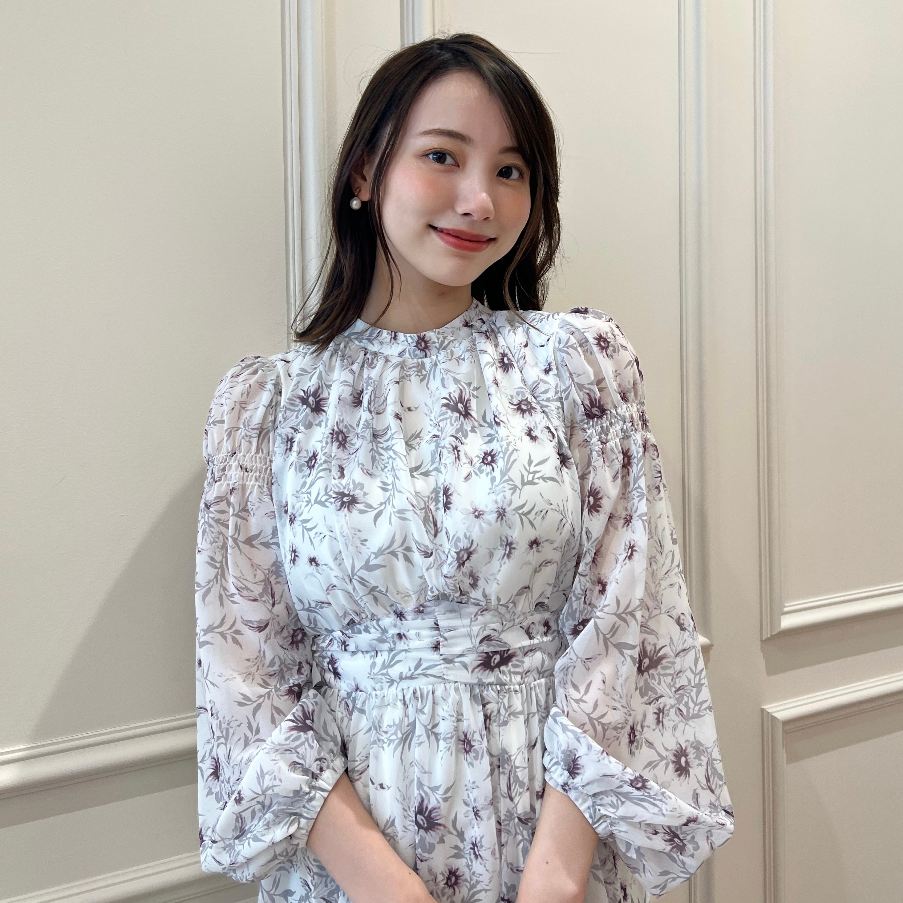 首元はスタンドカラーを配し、胸元にはフロントからバストトップに掛けてギャザーを施すことで上品な立体感を演出。