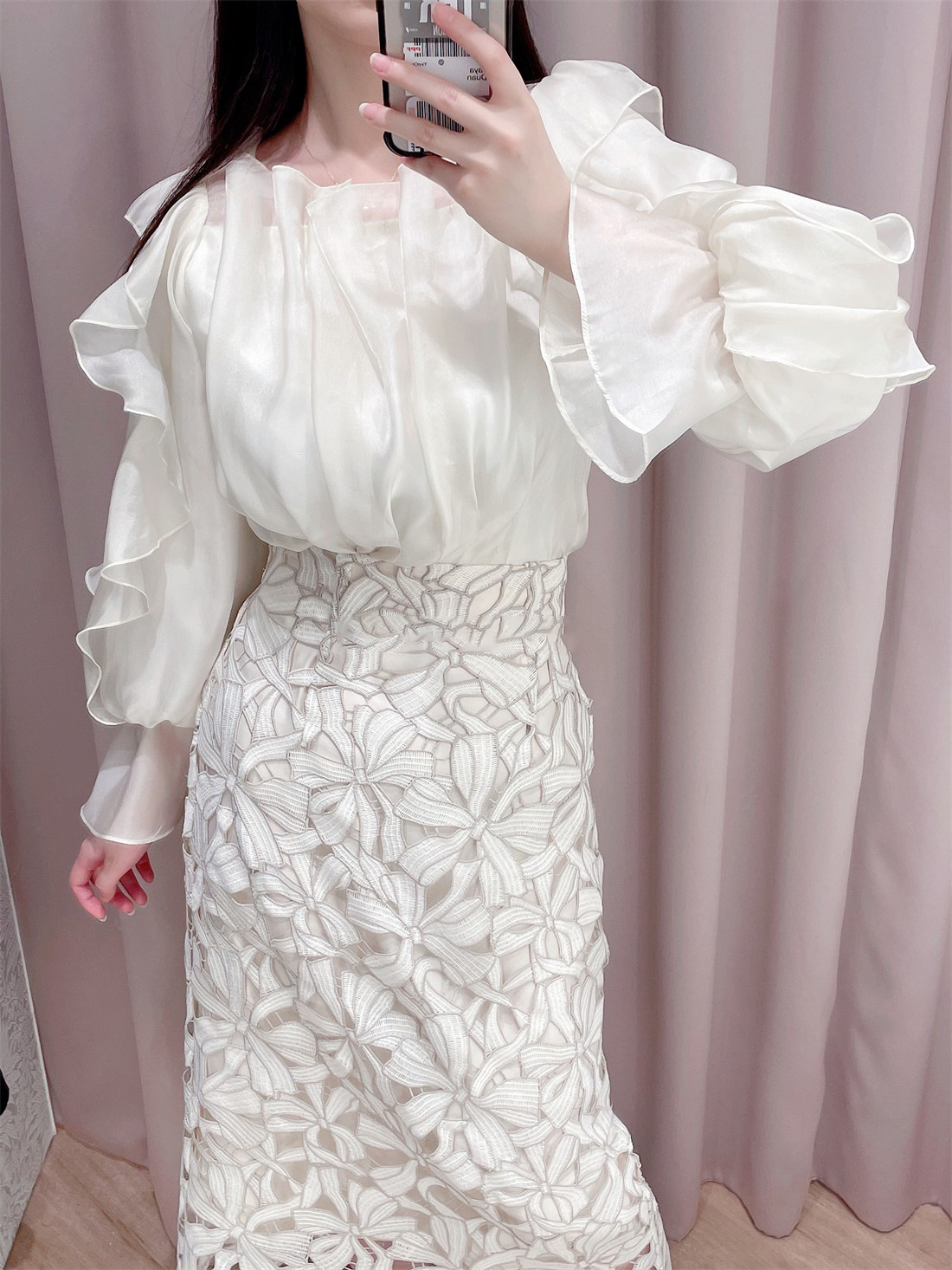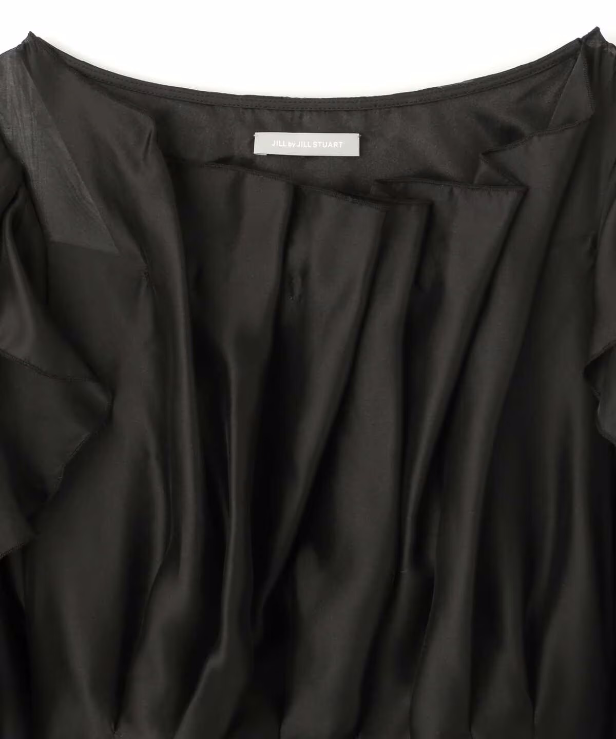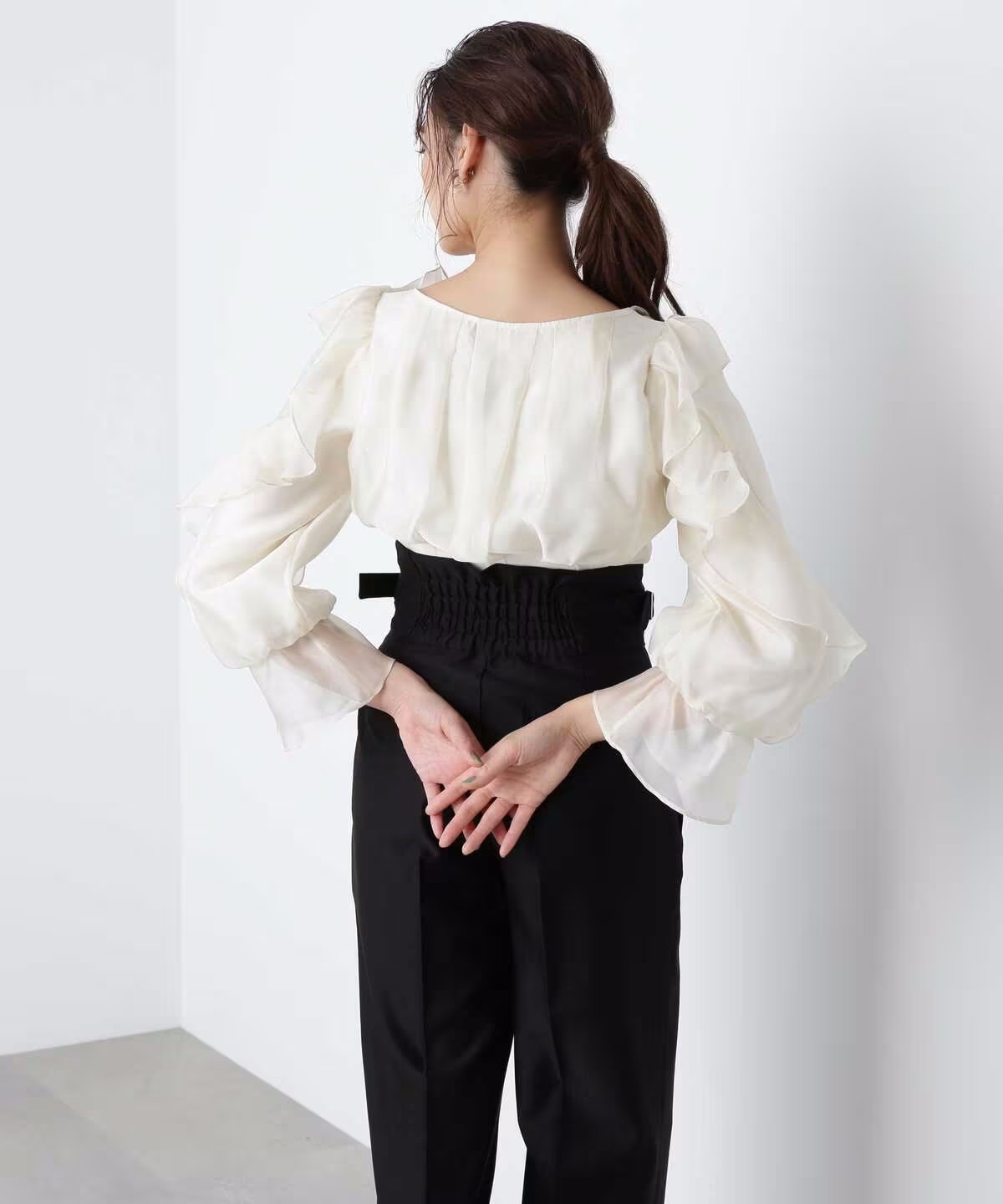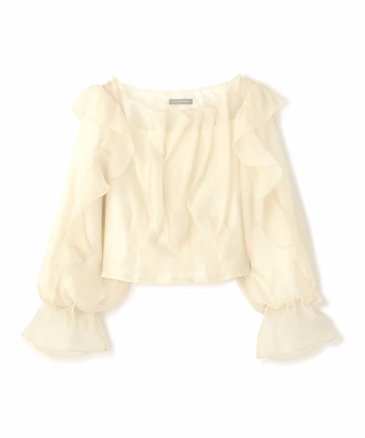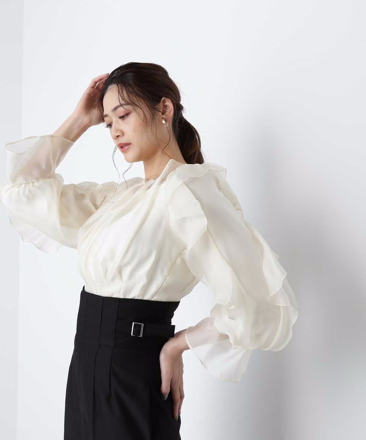 ほんのり透けるラッフルブラウス。身頃とショルダーラインの華やかなラッフルデザインが映えます。デコルテラインを綺麗に見せてくれるのもポイント。スカートやパンツに裾をインするだけで上品に決まります。※撮影時照明の関係により、色味が違って見える場合がございます。