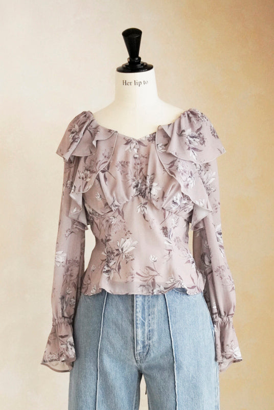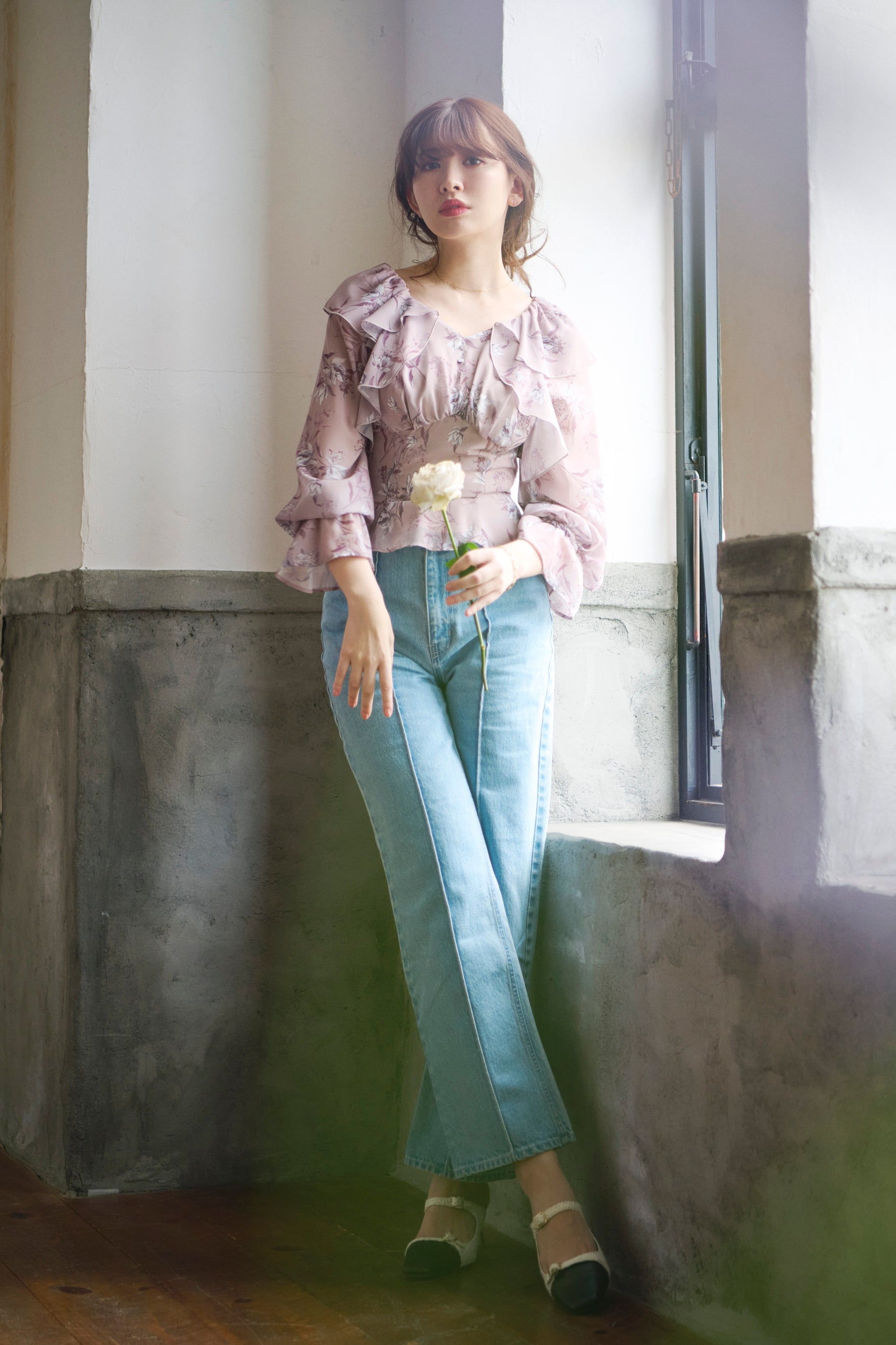 袖部分は程よいシアー感があり、女性らしい抜け感を演出。袖口はゴム仕様の為、袖丈をお好みで調節していただくことが可能。控えめなフレアスリーブデザインが洗練された手元に魅せてくれます。